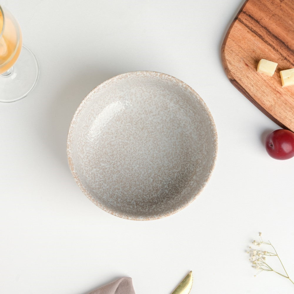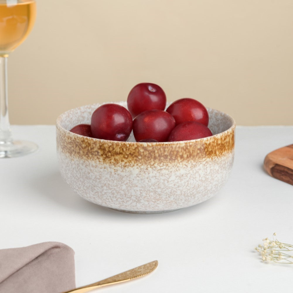 The earthy vibe of the handcrafted ceramic bowl makes it a must-have in a rustic tablescape setting. The earthenware bowl is perfect to dish out breakfast and mid-day meals. One can serve munchies, fritters, Nori rolls, fries and chips to a group of friends or guests along with evening tea and coffee. Nestip: Serve curd or yoghurt from this rustic bowl. Size: 16cm D x 8cm H Capacity: 500ml Colour: Brown and grey Material: Ceramic Products included: 1 serving bowl Style: DBAC110T239