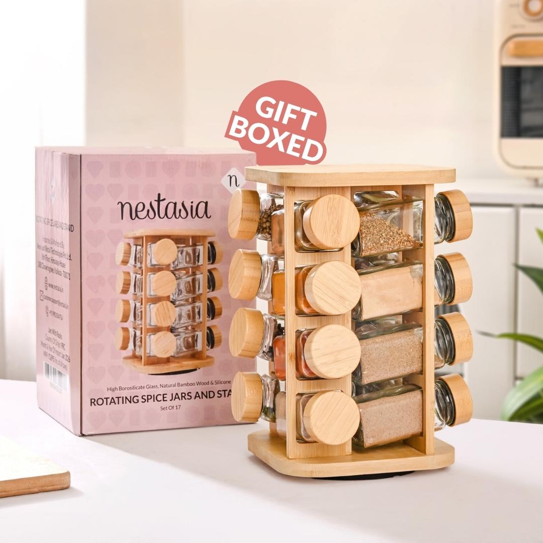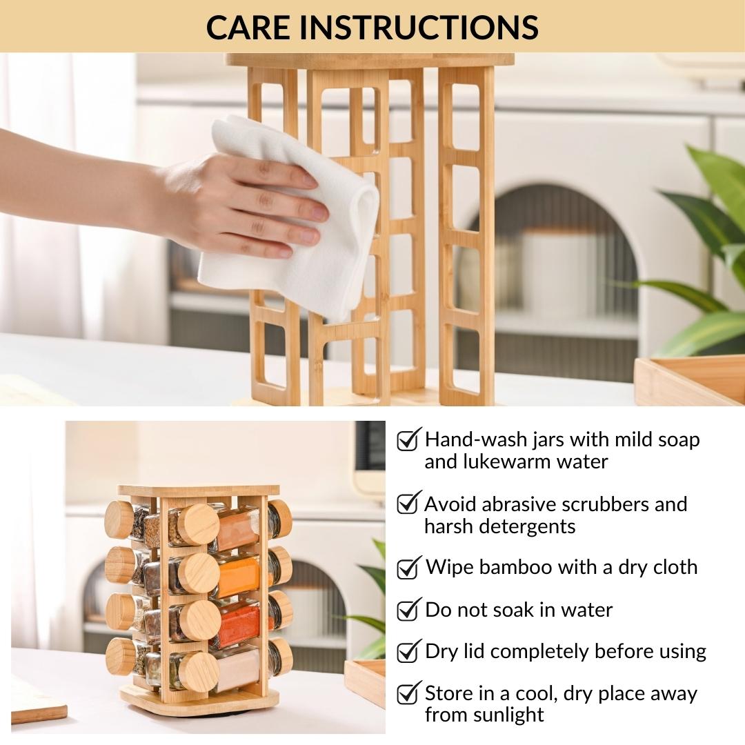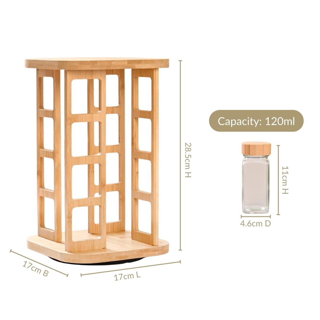 Design: This set includes sixteen glass containers for kitchen use, each featuring a clear body and a natural bamboo lid. The jars fit into a two-tier rotating bamboo stand that allows for quick access from any side. Each glass jar has a unique PVC insert cap with small holes for sprinkling and a larger opening for pouring.