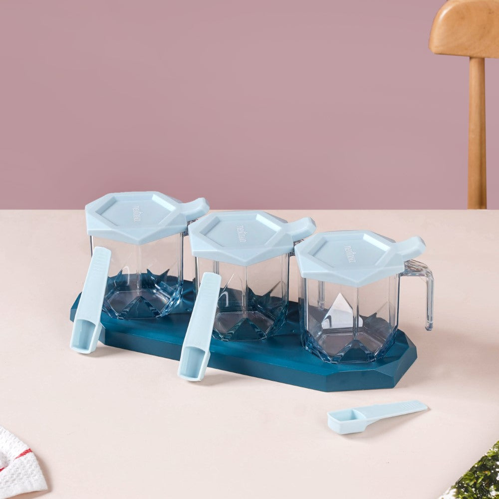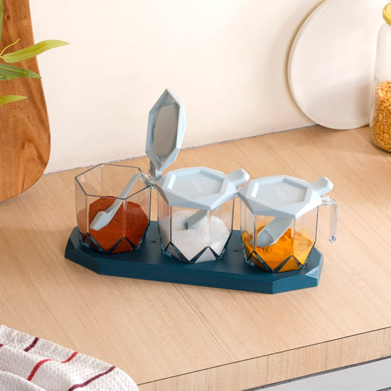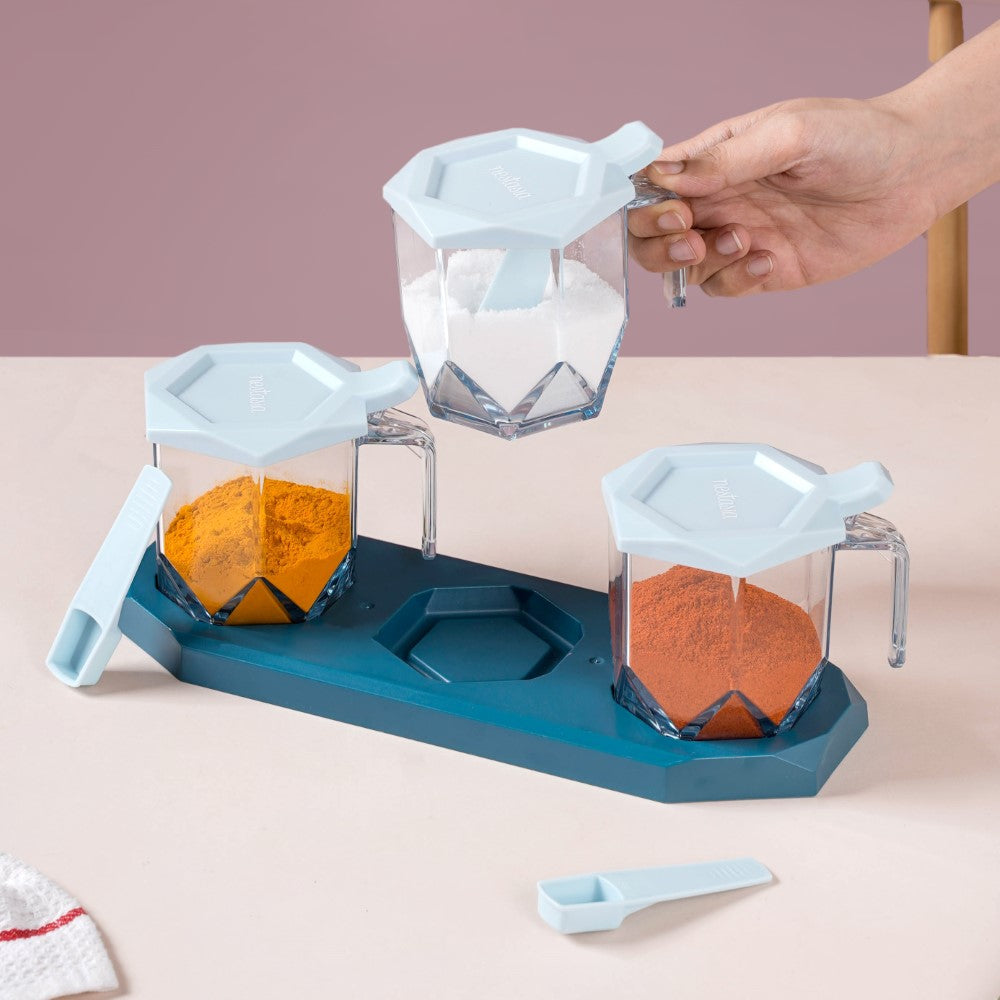 Our premium set of 3 spice containers is the epitome of kitchen organisation. Crafted with meticulous attention to detail, these elegant spice jars elevate your culinary space while ensuring functionality. Made from non-toxic, BPA-free PVC material, each spice jar features a flip-top lid, an easy-grab handle, and a measuring spoon for effortless seasoning. Complete with labels for effortless identification, these small spice containers rest upon a sturdy tray base, offering stability and style. Their ergonomic design guarantees easy holding and seamless portability. Transform your kitchen into a masterpiece of efficiency with this essential spice jar set.