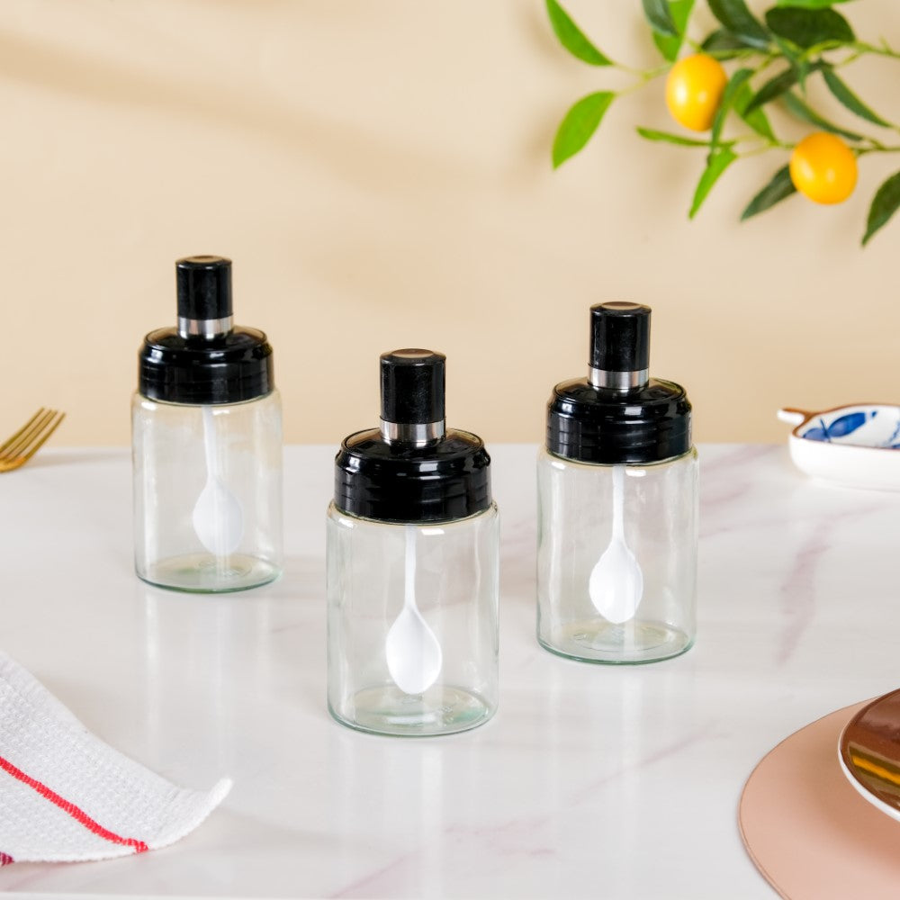 The seasoning glass jar with spoon comes in a set of 3 and can be a sleek and stylish addition to any kitchen. The spice jar has been made of high-quality glass and this container for the kitchen not only looks great on your countertop but also keeps your oil, ghee, and spices, fresh and easily accessible. The glass jar that comes with an attached spoon allows for easy and precise measurement, ensuring that you use just the right amount every time. No matter whether you use it for everyday cooking or to simply add a touch of flavour to your dishes, this seasoning glass jar set of 3 is the perfect tool to elevate your cooking game.