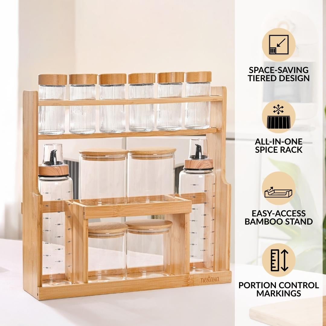 Benefits: The varied jar sizes cater to everyday spices, staples, and oils, while the marked dispensers ensure accurate pouring. The sturdy bamboo rack keeps everything accessible, streamlined, and beautifully arranged in one place.