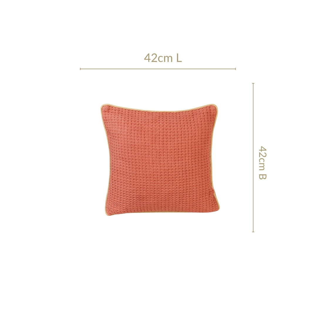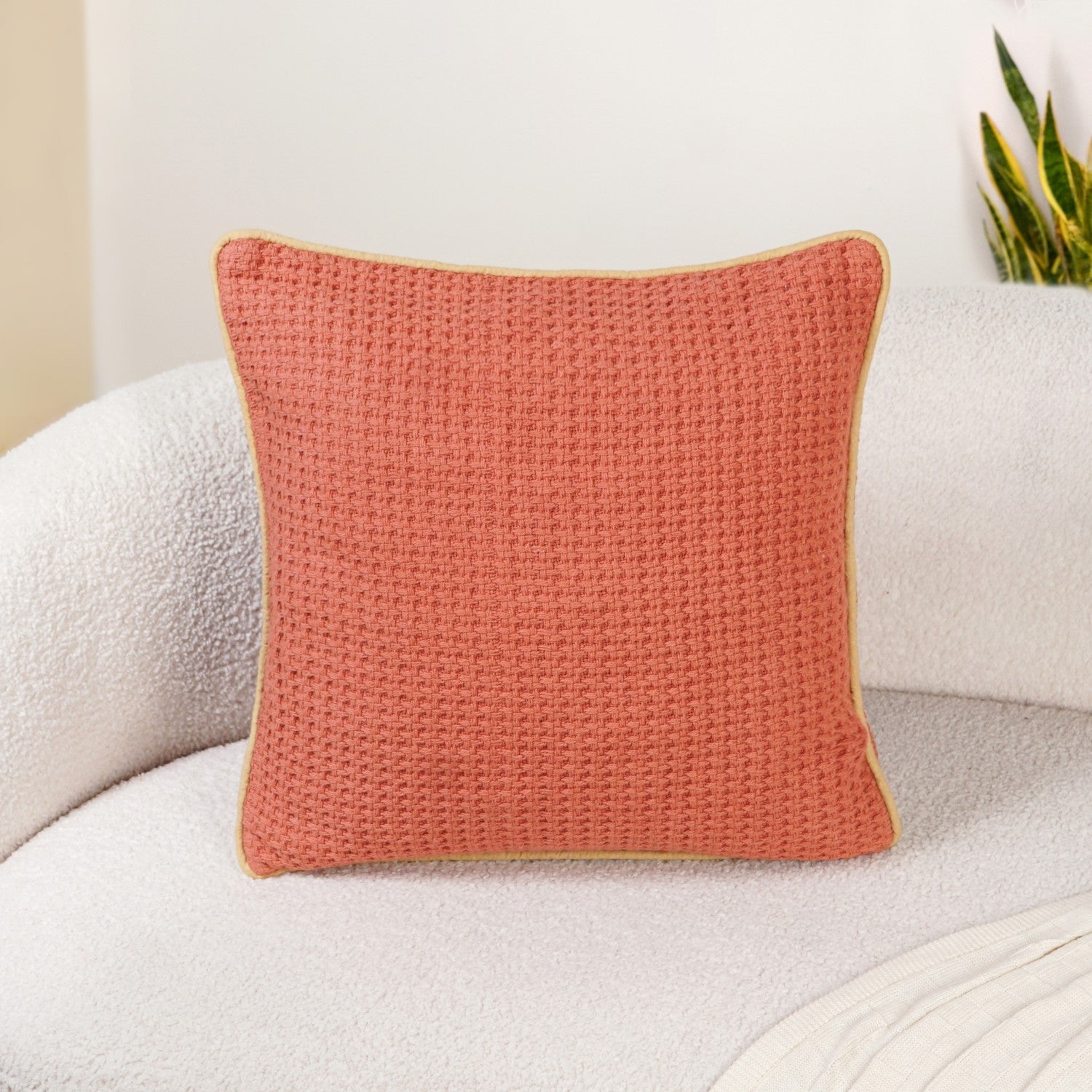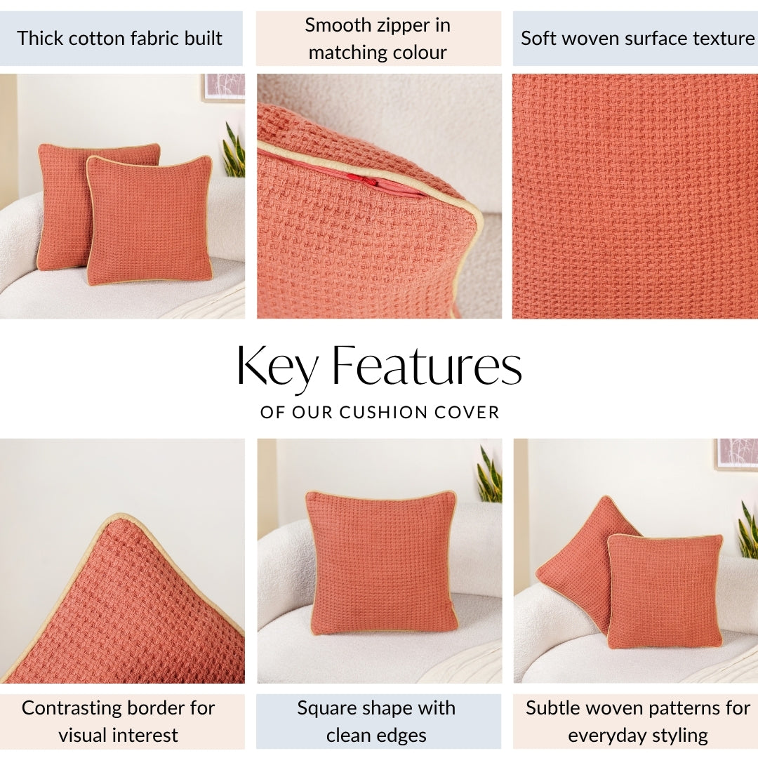 Benefits: The cotton fabric is breathable, gentle on the skin, and ideal for daily lounging. Its structured square design fits snugly and stays in place without slipping. The concealed zipper makes it easy to switch covers in seconds. A tight weave and dual-toned colour help conceal light dust or marks. The bright border adds a pop of style while keeping the look polished and balanced.