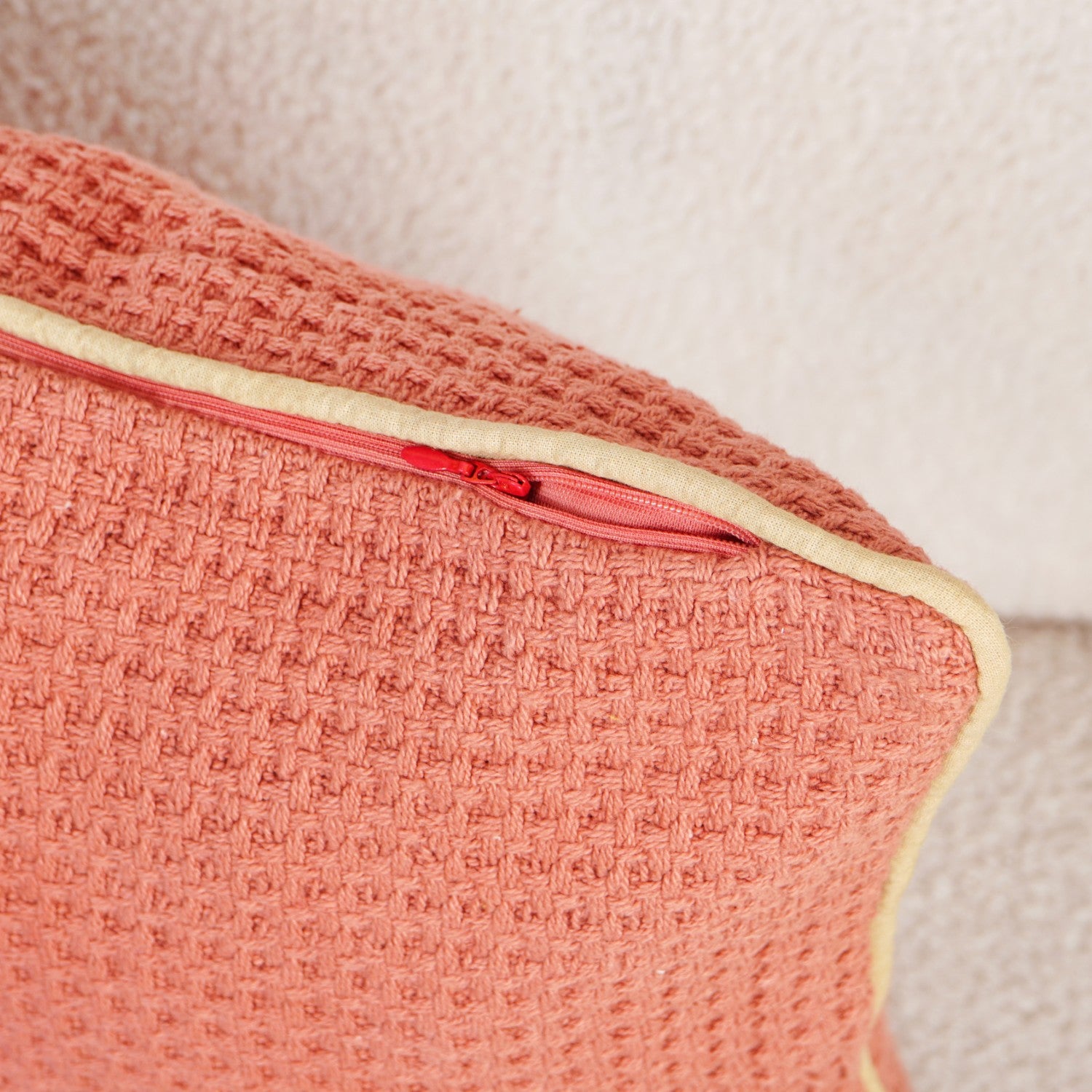 Design: This cushion cover set is crafted from soft cotton with a thick structure that makes it perfect for everyday use. The fabric is smooth to the touch and has a tight woven texture that adds subtle depth. A rich, dark yellow border frames the pink base, offering a vibrant contrast without overwhelming the design. The square shape fits standard cushions and creates clean, defined lines when styled on beds or sofa cushions. A matching concealed zipper keeps the closure neat and tidy. Perfectly sized as couch cushion covers, they blend comfort and structure for a versatile look.