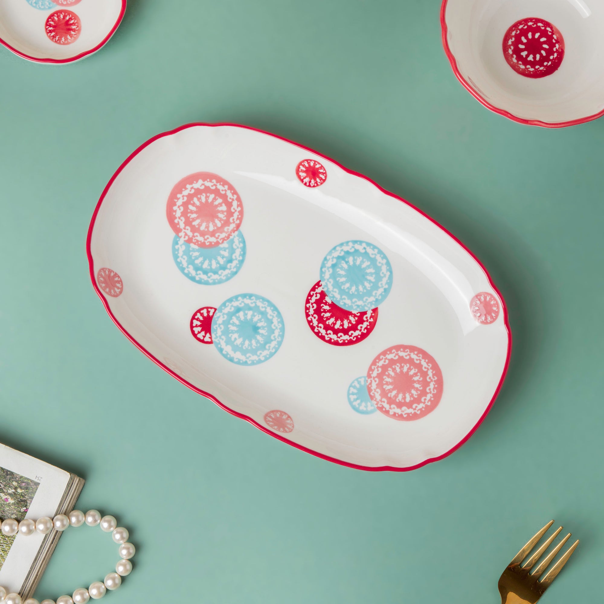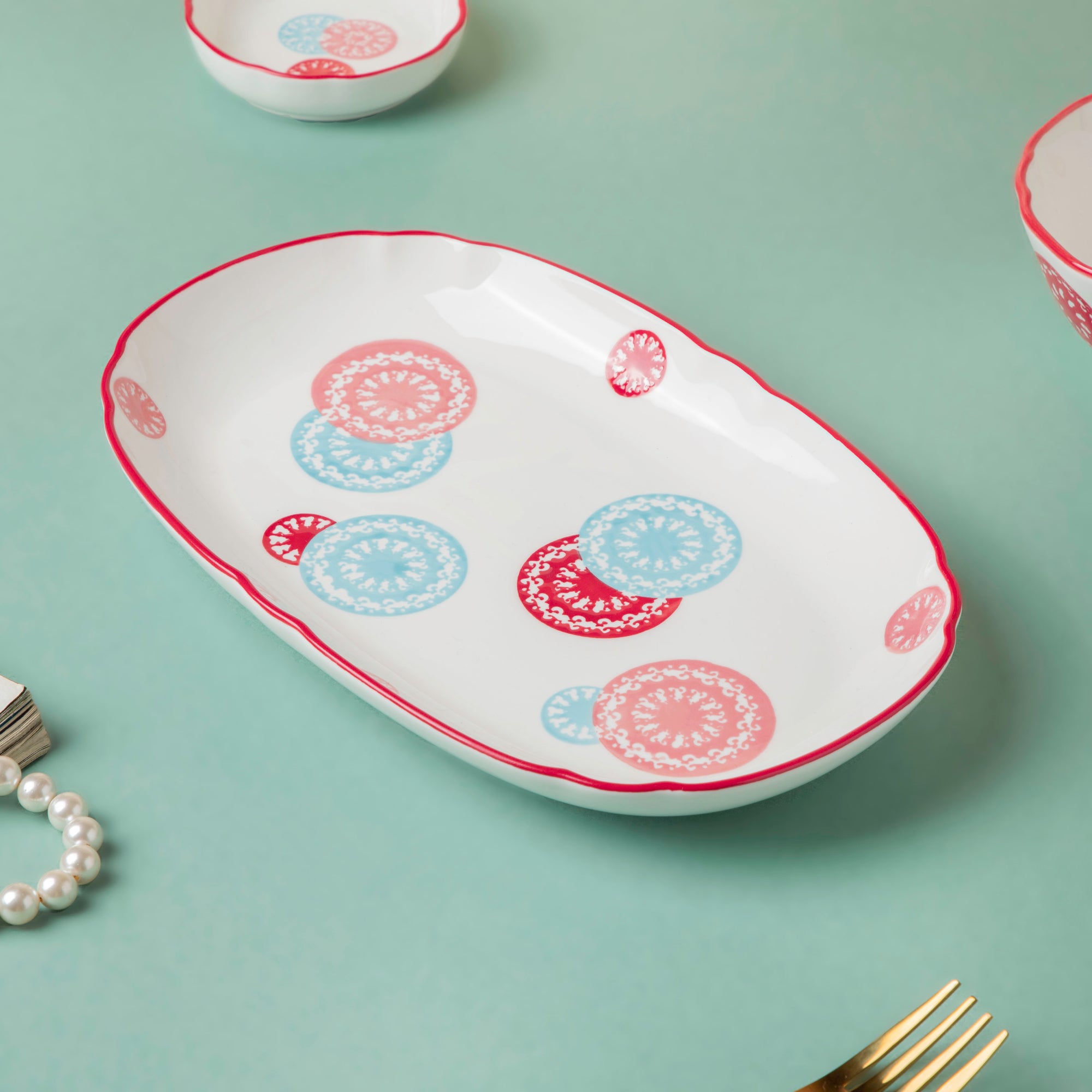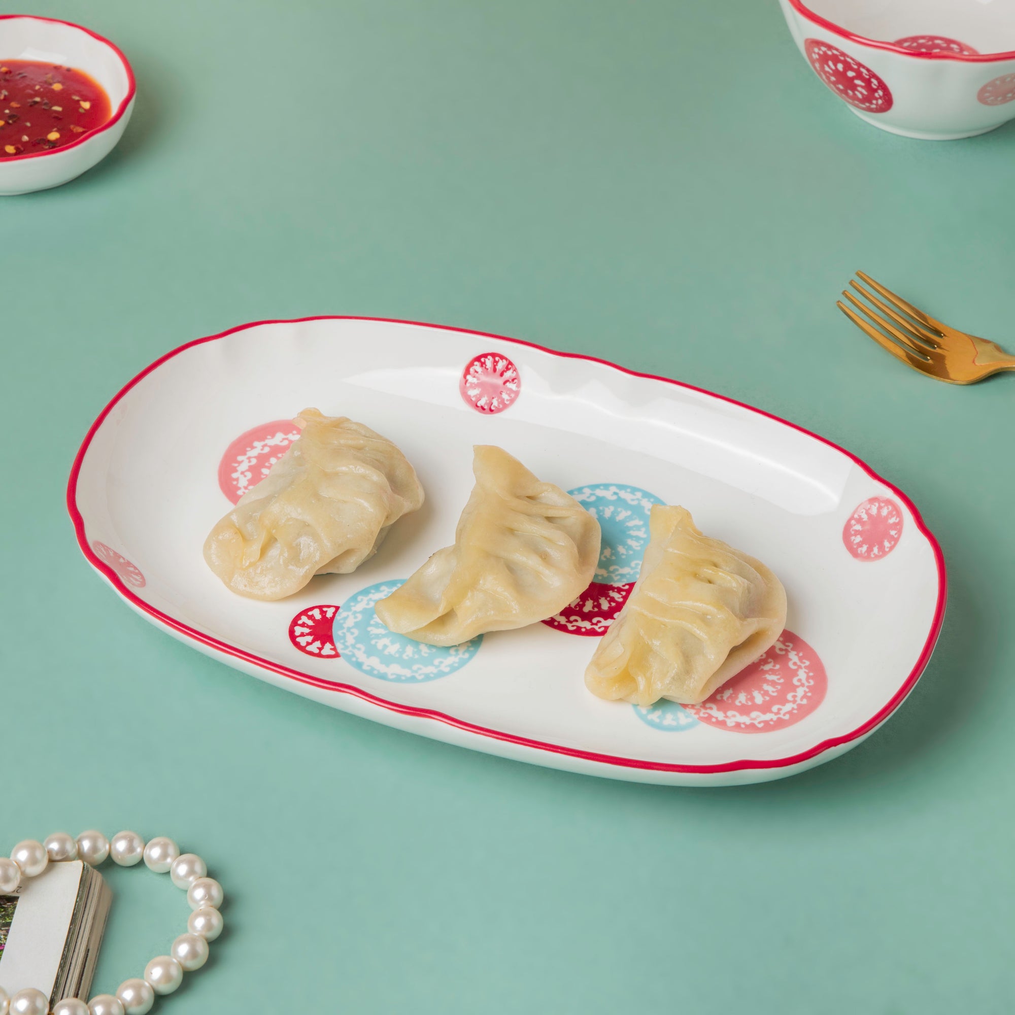 At small events, the red-rimmed platter with unique, lotus stem motifs and a glossy white exterior is excellent for presenting desserts, chocolates, cookies, satays, and more. The ceramic platter has a distinctive form that will excite interest at any dinner party. The platter's innovative curvature adds to it a modern aesthetic appeal. The white patterned platter is simple to reheat food and serve it straight from the oven. The platter can also serve as a cheeseboard. After each usage, the ceramic plate can be cleaned in the dishwasher, making tidying a cinch.