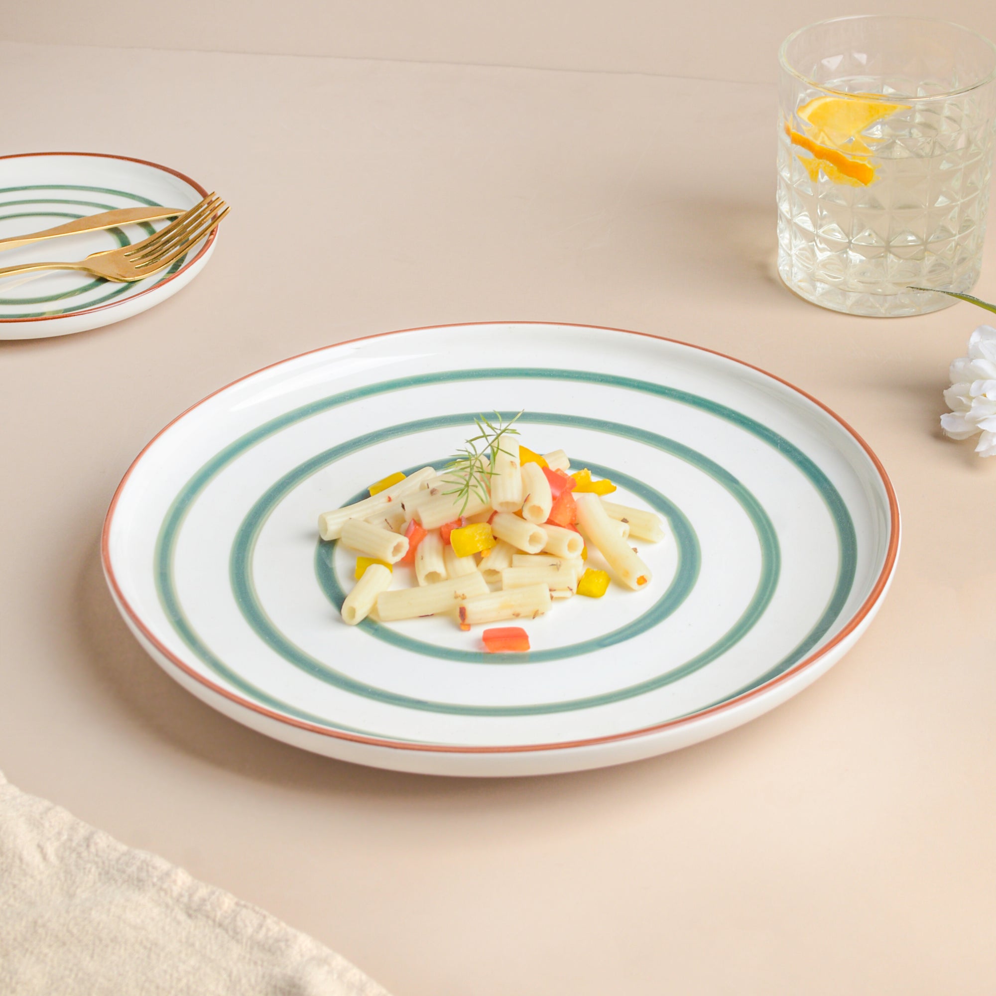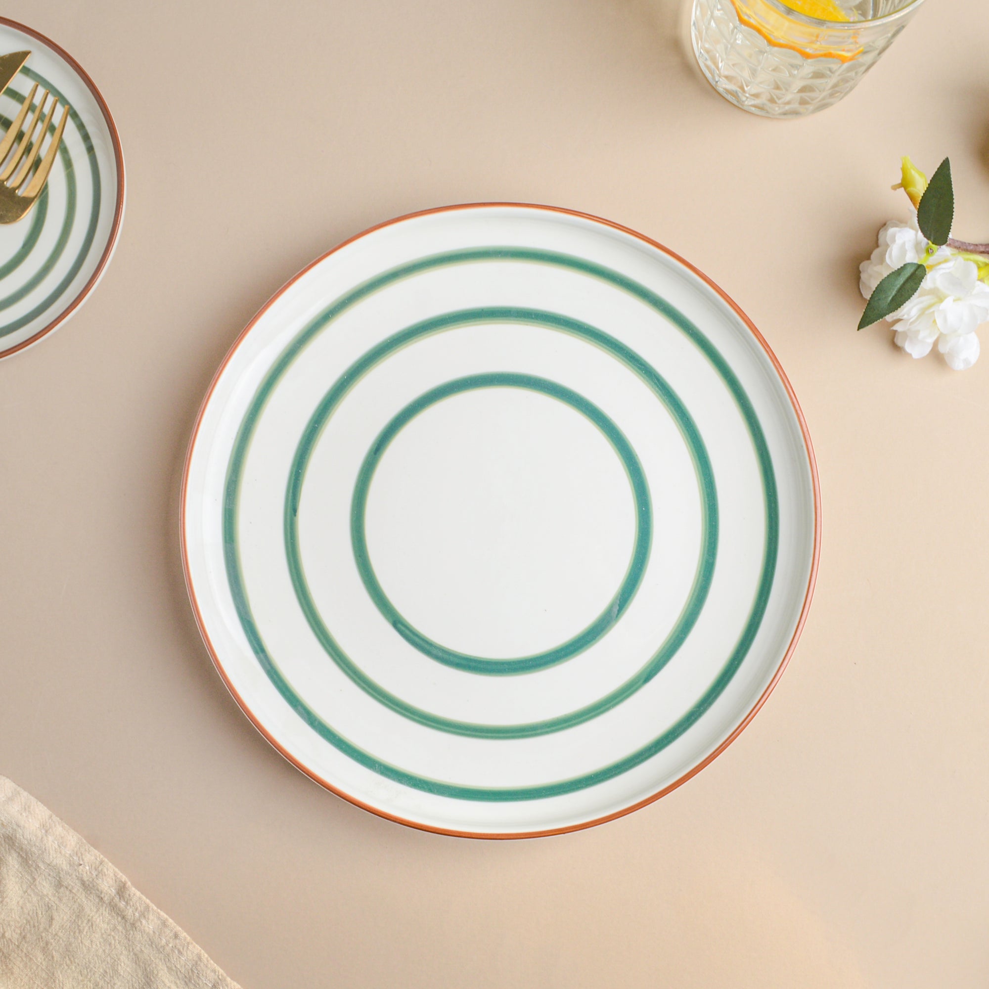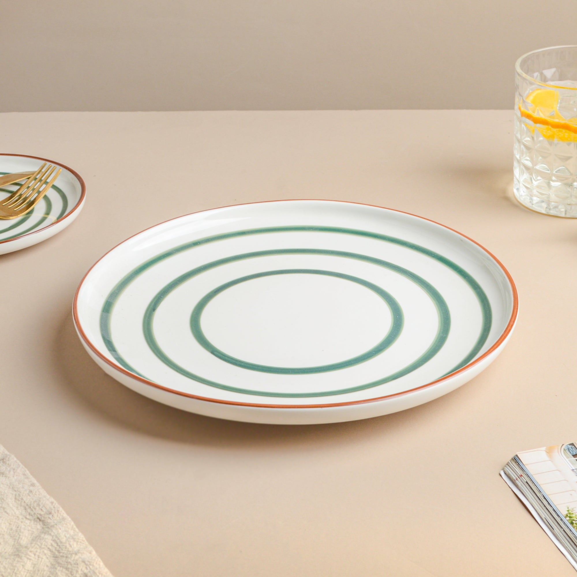 The ceramic dinner plate is ideal for serving guests in both formal and informal dinner settings. Crafted to perfection with high-quality ceramic, the plates feature sleek green circular patterns which are highlighted due to the white surface of the plate. Serve main course dishes on the ceramic plate during lunch or dinner.