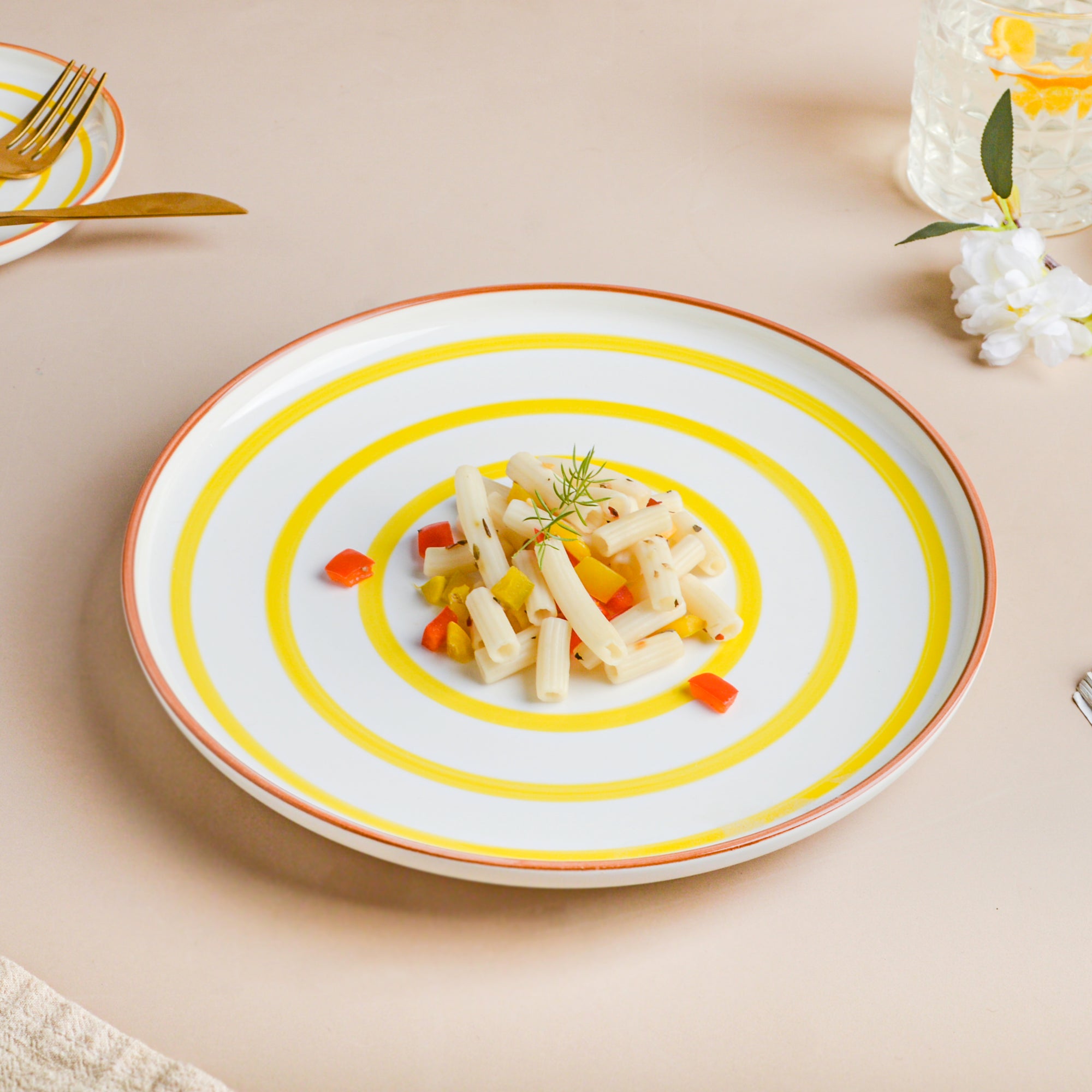 The yellow dinner plate with concentric circles will blend in easily with a modern and contemporary dinner set-up. The ceramic plate can form a complete dinner set with variants of pasta plate, snack plate, bowl, and side dish. The ceramic dinnerware exhibit elegance and can be used to serve main course meals as well as snacks at all times of the day.