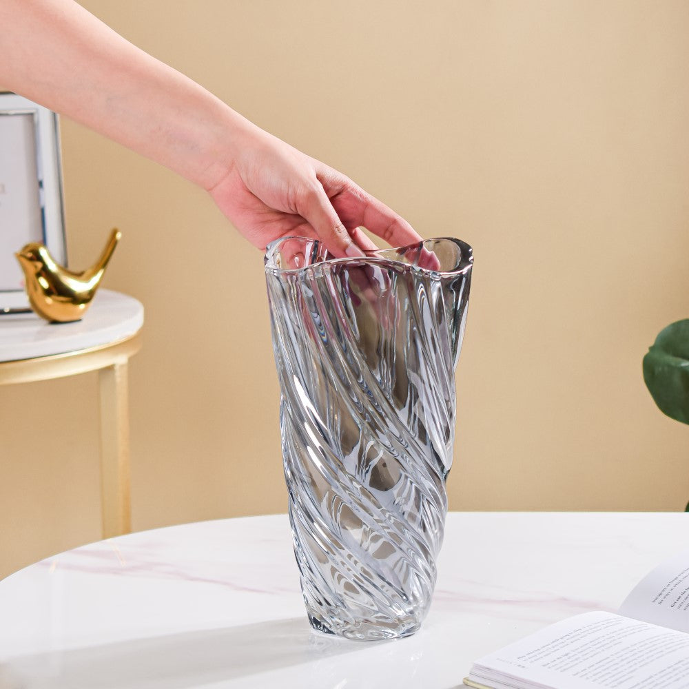 The artistic glass flower vase has a distinctive swirling form that adds a touch of elegance to home decor. The flower vase's translucent material can beautifully showcase colourful blooms, brightening up any living space. The vase's timeless design and subtle grey tint seamlessly complement any decorative style, effortlessly filling up empty spaces with a chic and stylish touch. As a classic piece, this glass vase never goes out of fashion and has become a popular choice for interior design enthusiasts and gift-givers.