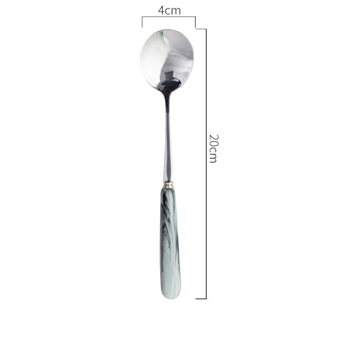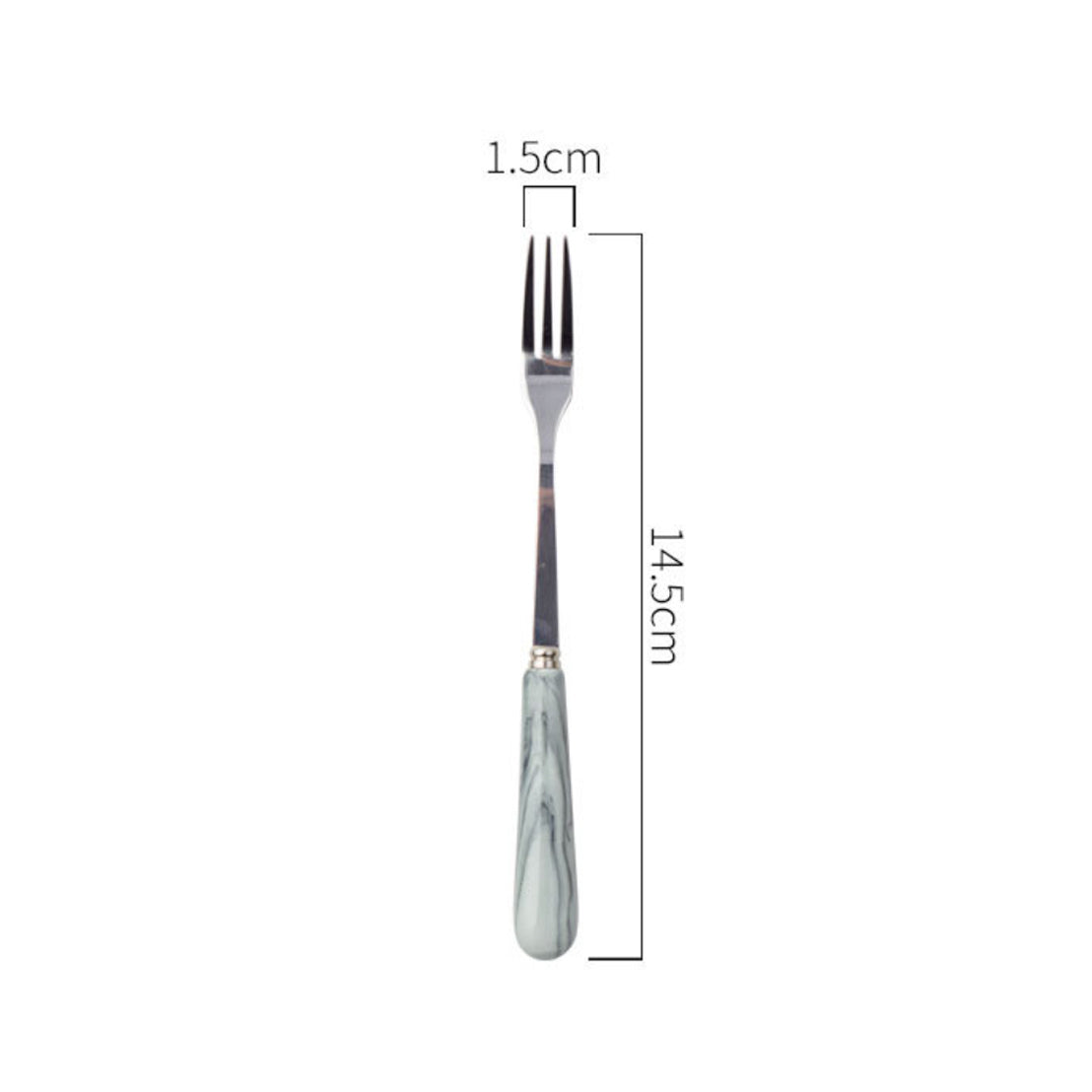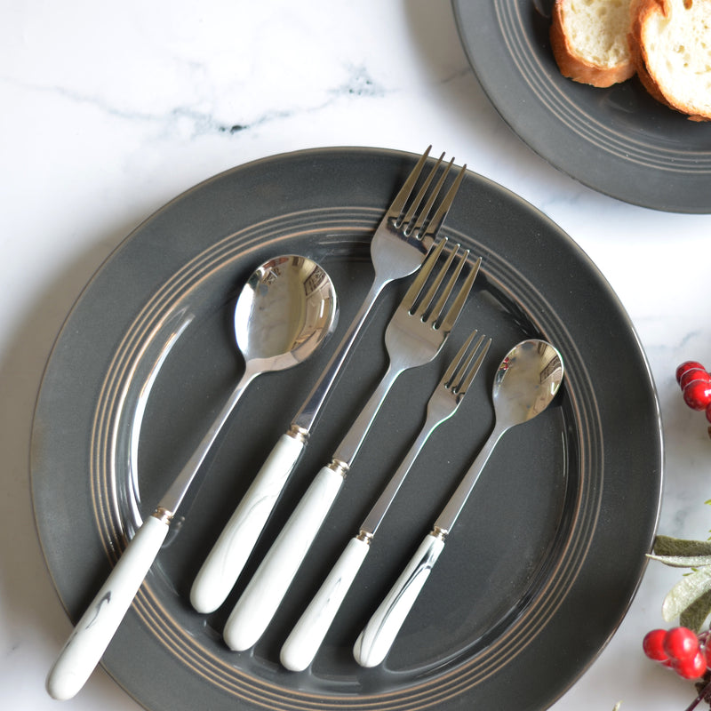 A cutlery set of 5 pieces with 2 sizes of spoons and 3 sizes of fork. The stainless spoons include a soup spoon and a dinner spoon, the stainless forks include a salad fork, start fork and a dessert fork. The grey marble finish of the handles blend in perfectly with the silver base of the cutlery set that can compliment any table serving.