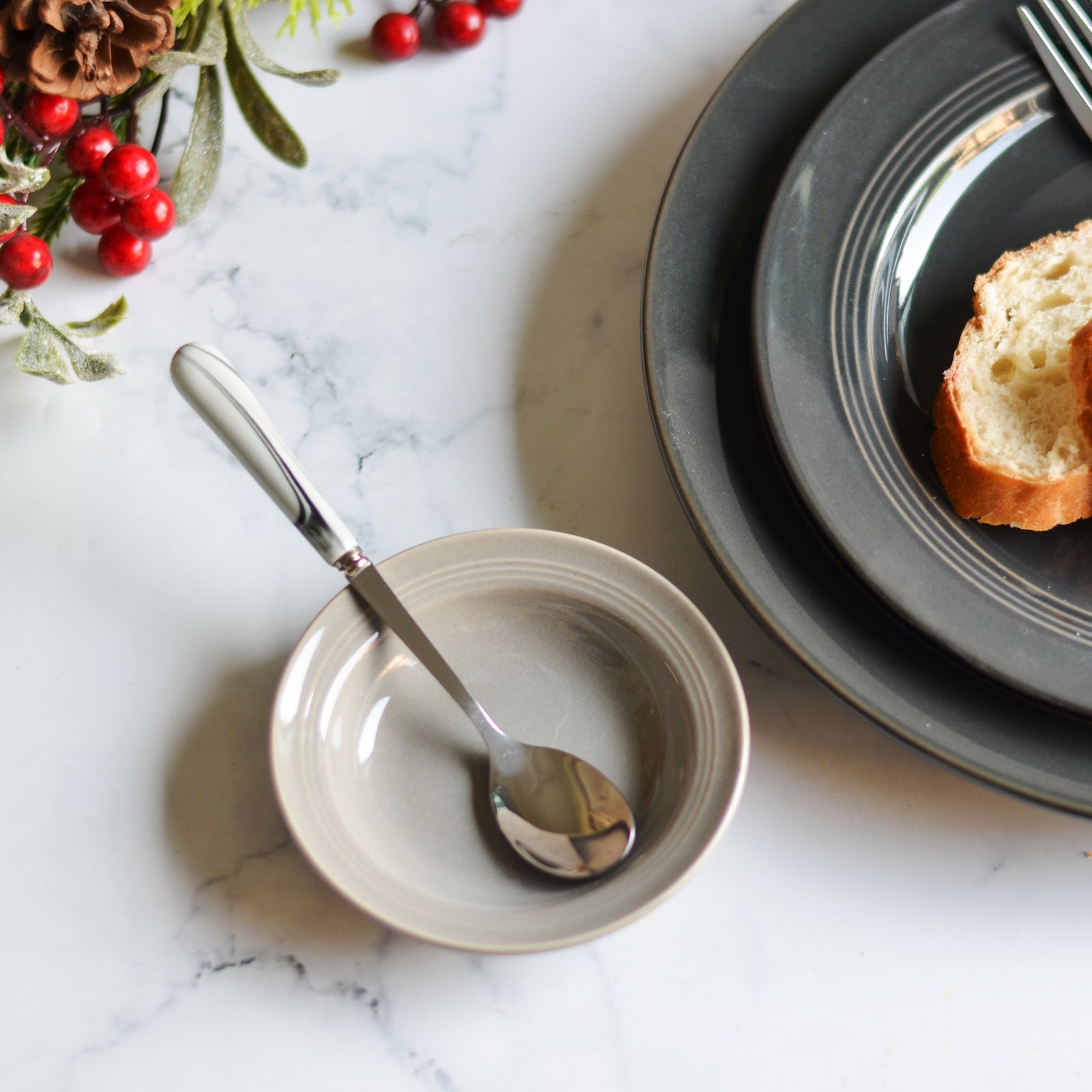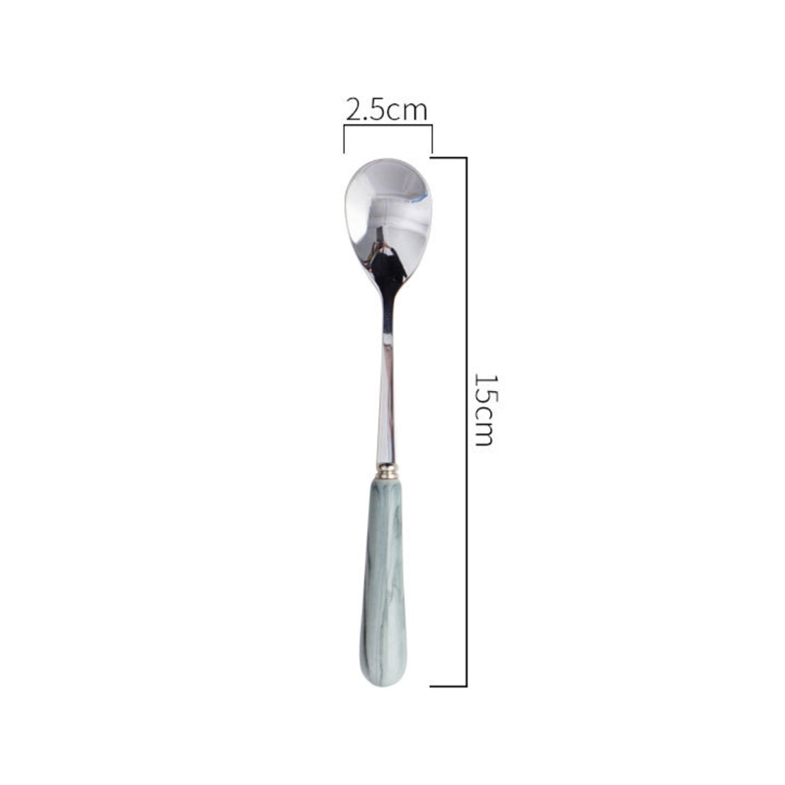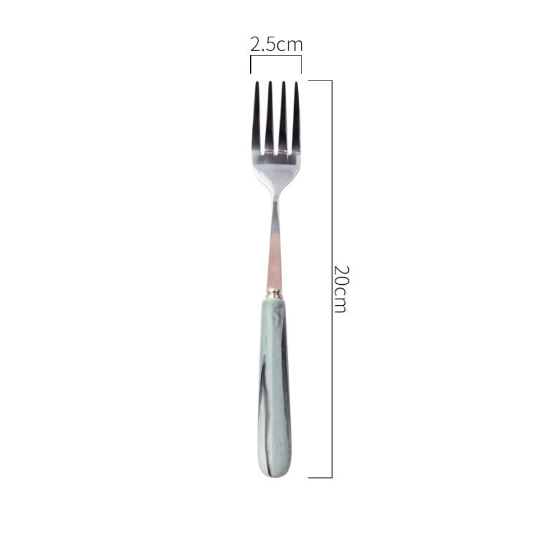 A cutlery set of 5 pieces with 2 sizes of spoons and 3 sizes of fork. The stainless spoons include a soup spoon and a dinner spoon, the stainless forks include a salad fork, start fork and a dessert fork. The grey marble finish of the handles blend in perfectly with the silver base of the cutlery set that can compliment any table serving.