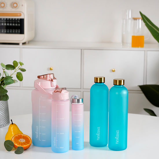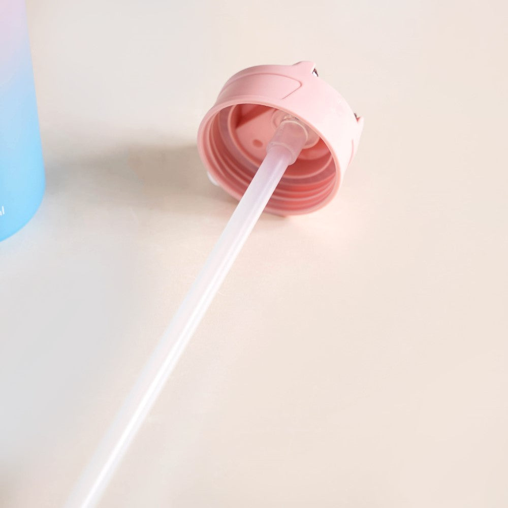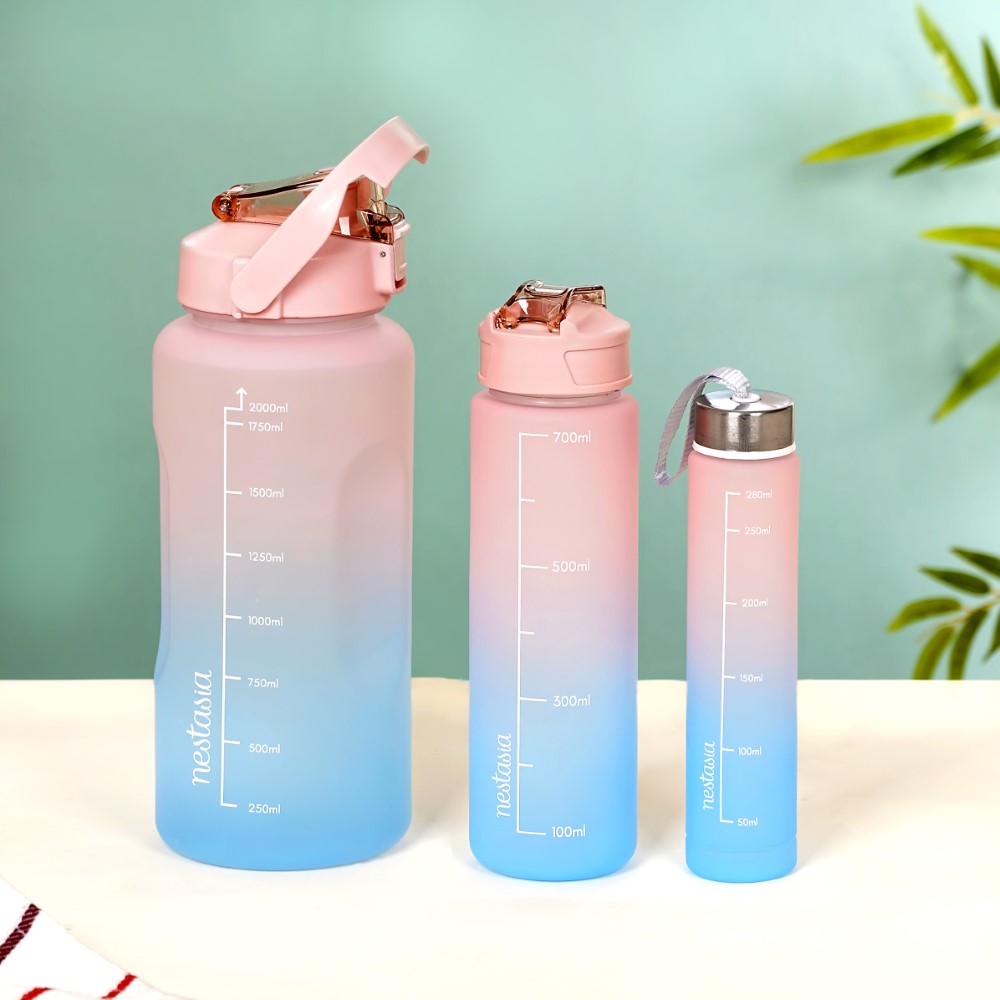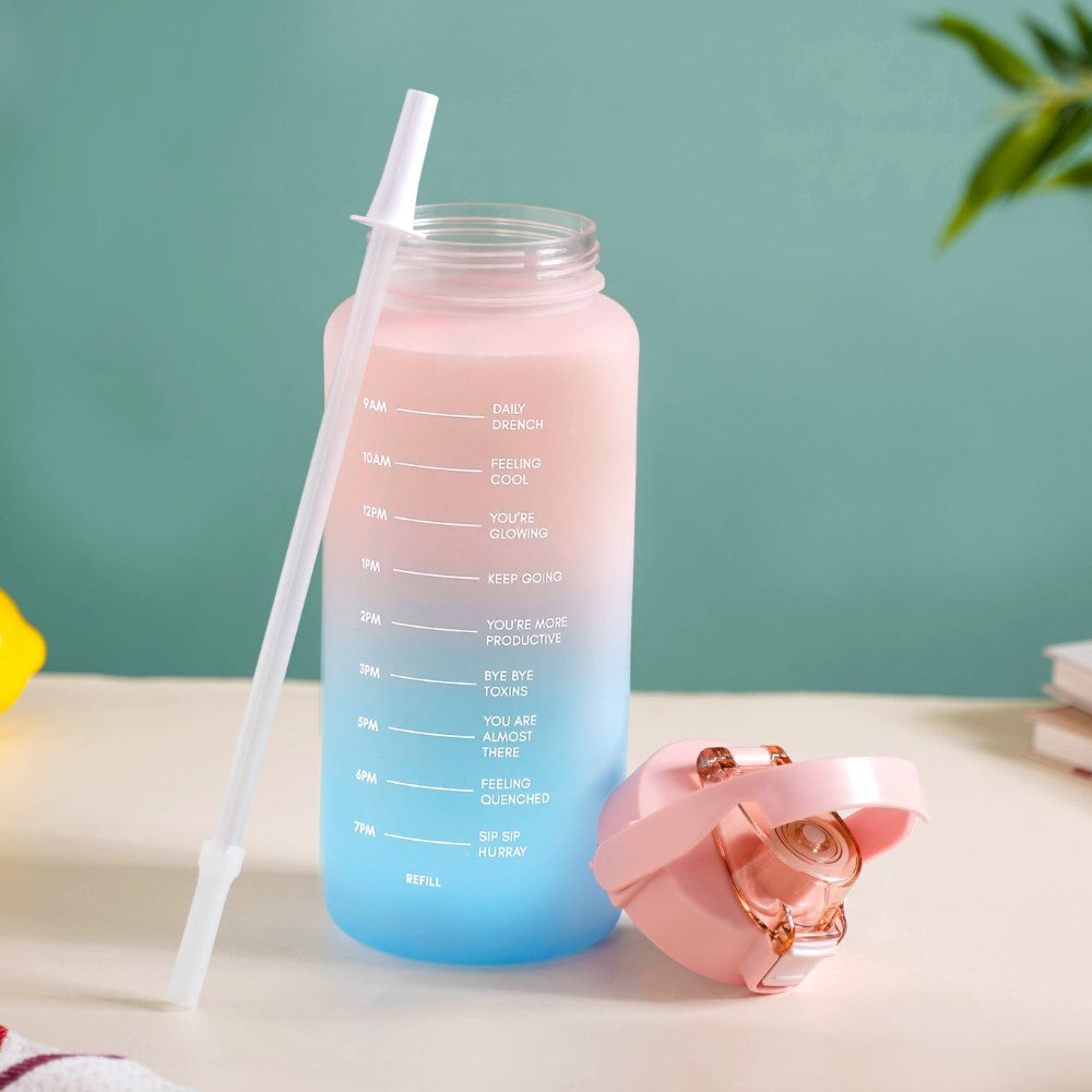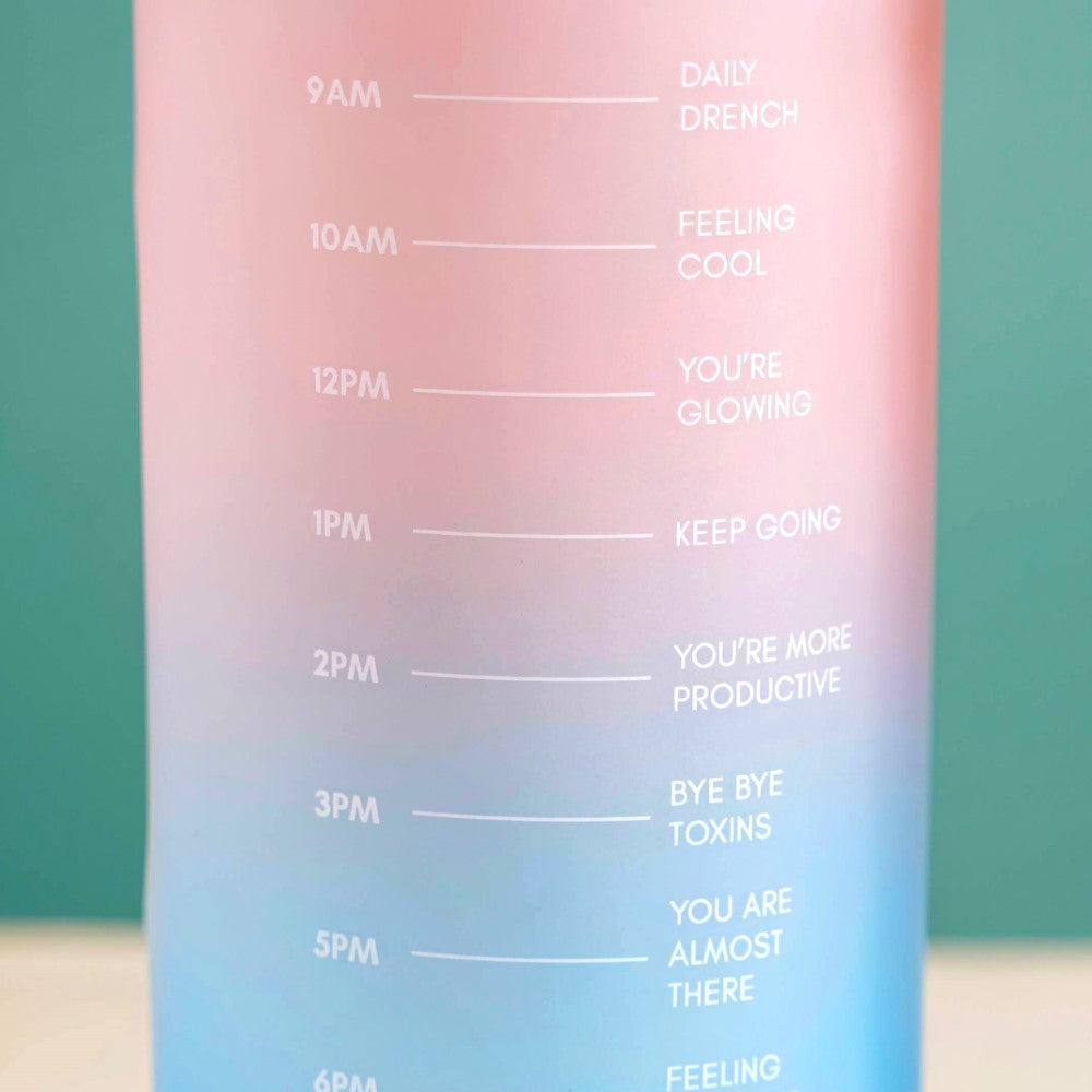 Revitalize your hydration habits with our set of 3 water bottles in captivating pink and blue gradient colours. These bottles combine style and function, featuring inspiring quotes and handy time markers to help you monitor your daily water intake effortlessly. Perfect for workouts, appetite control, or daily wellness, their leak-proof, dustproof design, complete with a secure lock, silicone sealing ring, and spring-loaded dust cap, guarantees a mess-free experience. Crafted from BPA-free, food-grade plastic, these bottles are safe, lightweight, and durable for any adventure, from hiking to yoga.