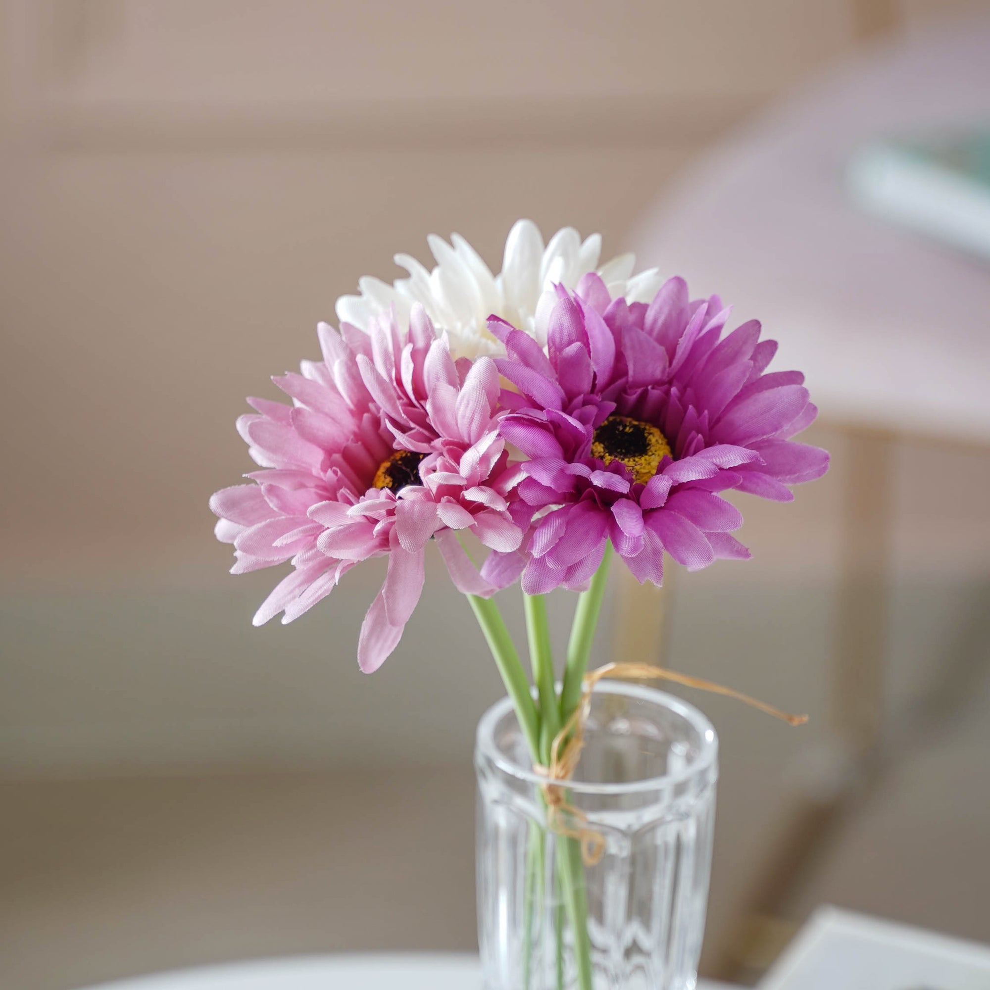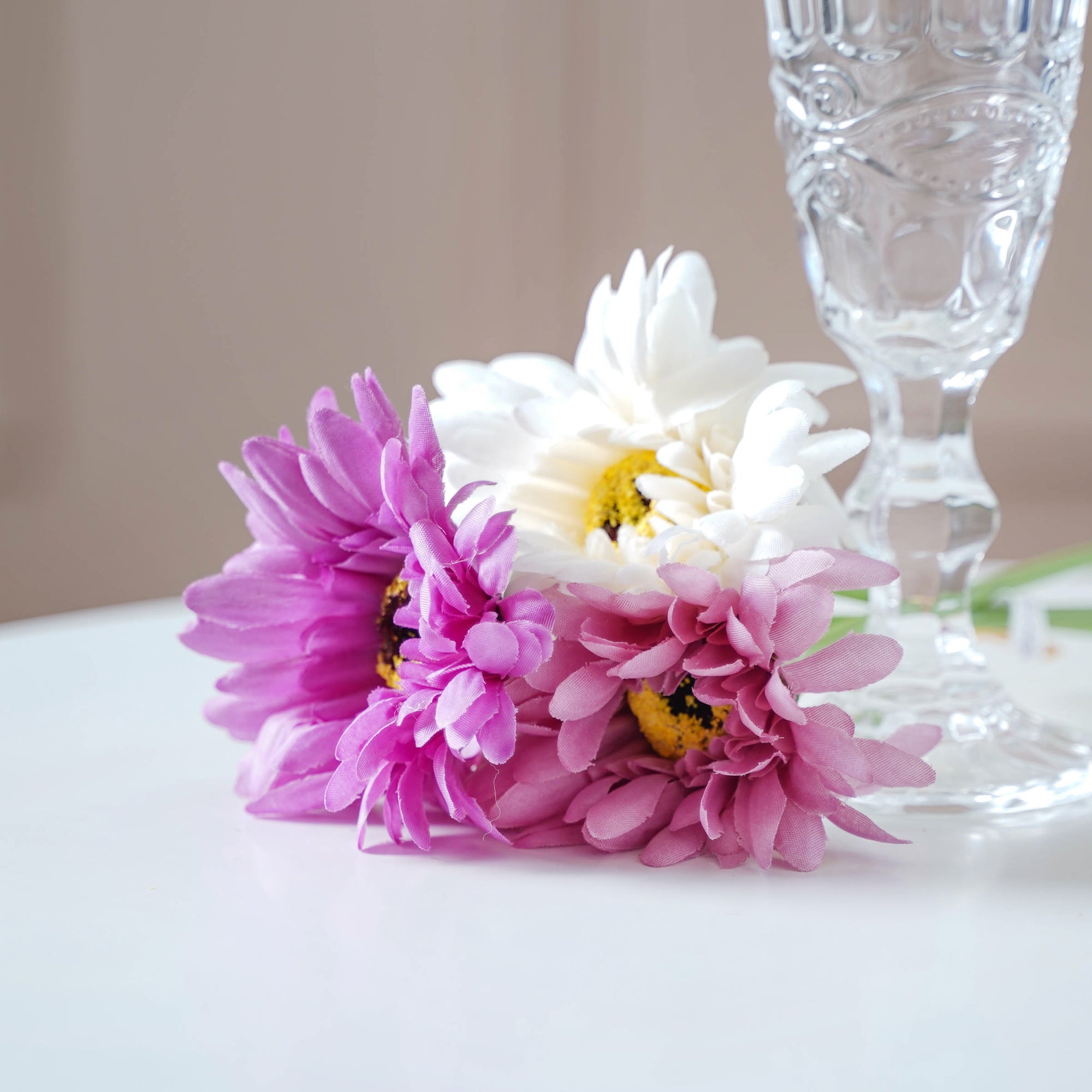 Faux blossoms bring the beauty of spring into the home all year round. The gerbera stem, rising tall on a green stem, appears realistically delicate. The faux gerbera stem, with its well-defined pollen center, is the most realistic kind available for purchase. The gerbera flower represents innocence, purity, and beauty. The blooms' most notable feature is the bright, luminous hues of the petals, which symbolize energy and rejuvenation. The use of colors encourages youthfulness and excitement, which spreads positivity and happiness throughout the home.