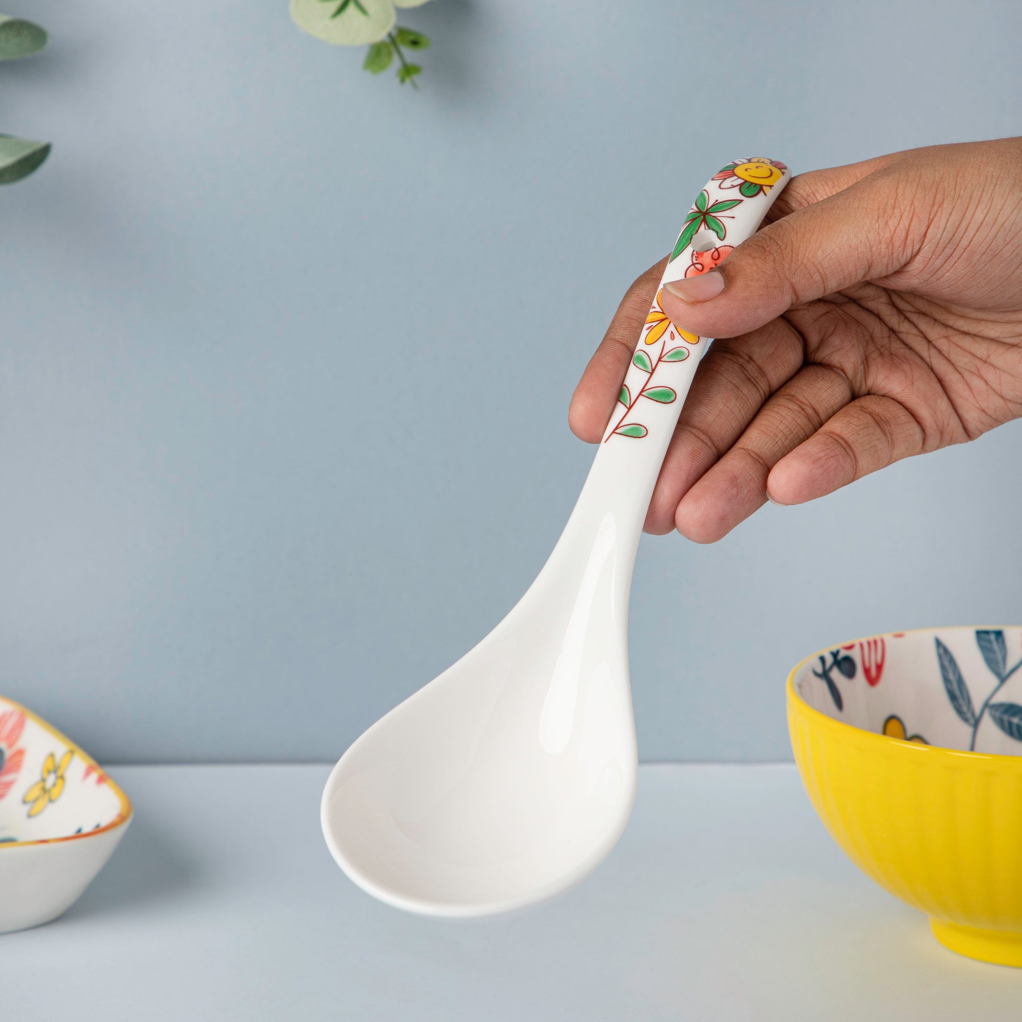The white serving spoon from the Aurora collection with the floral pattern on the rear end is a sophisticated yet fun addition to the tableware collection. The neutral color of the serving spoon makes it stand out on any dinner or snack table. Use the serving spoon to serve hot soup, gravy, or rice to family and friends, and pair it with bowls from the collection that have a similar pattern. The ceramic spoon has a broad bowl and a gently rounded tip, making it easy to serve food with ease. Furthermore, the spoon's larger bowl accommodates a substantial amount of food. As a result, the spoons can be used on a daily basis to prepare routine meals.
