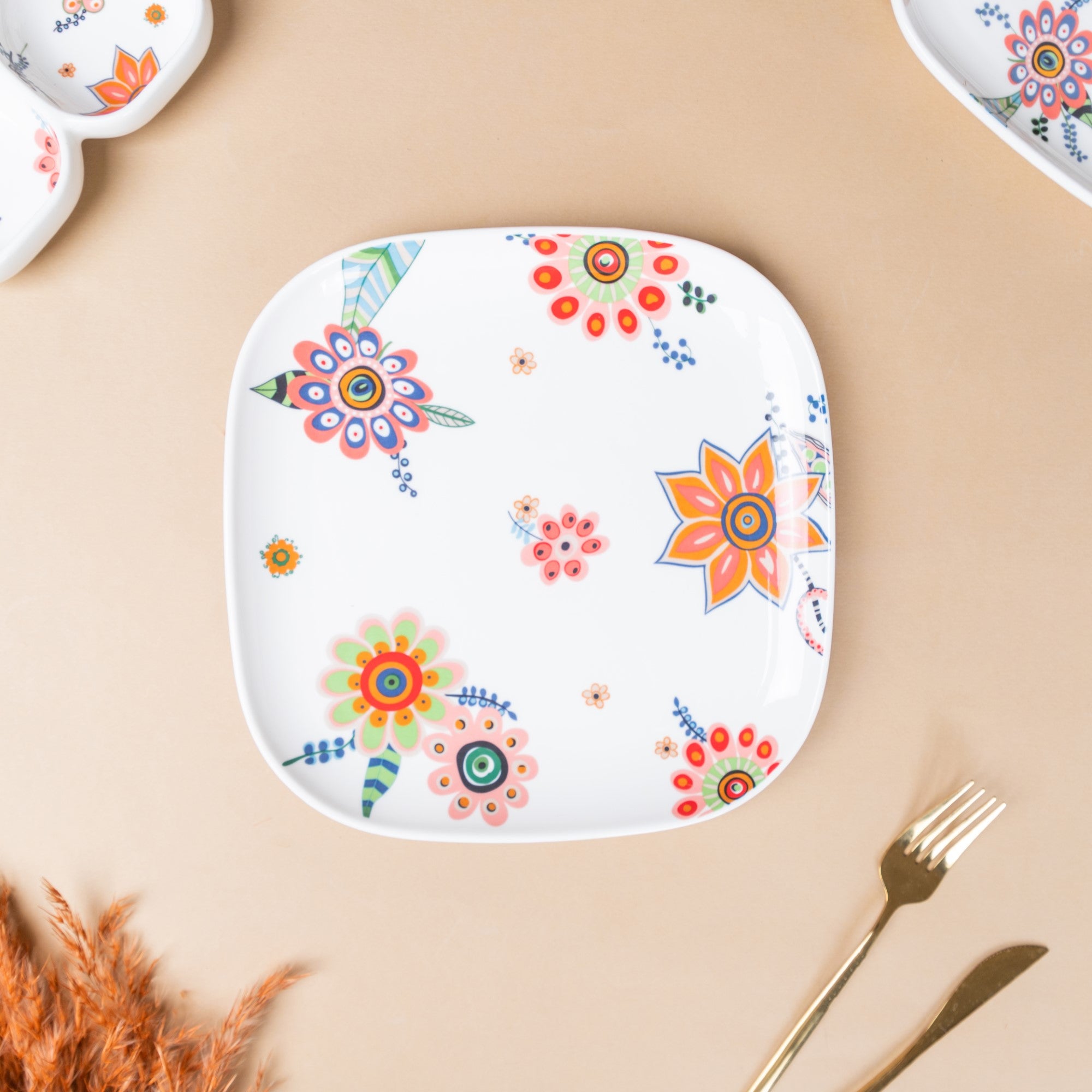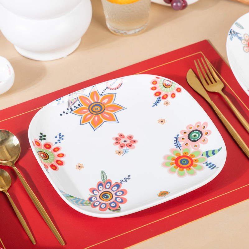 The dinner plate with bright florals lends a festive charm to the dining table setting. It is a square shaped dinner plate with rounded edges made of ceramic. The dinner plate forms a part of the Floret Collection of dinnerware that can customised as per need.