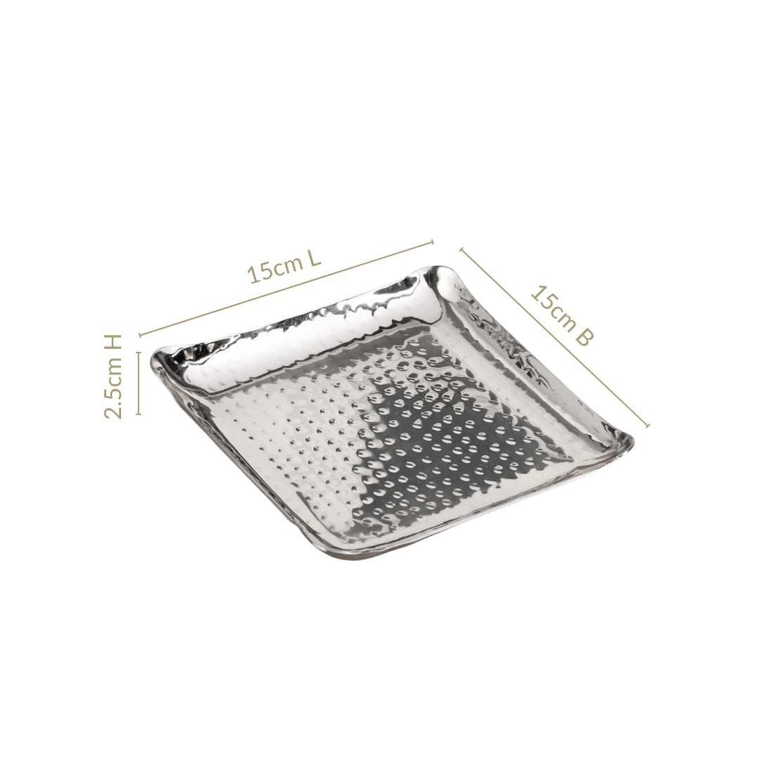 Design: The square hammered platter is crafted from premium-quality stainless steel that ensures strength and resilience. Its reflective mirror-polished surface adds brightness to the table, while the subtle hammered detailing gives it a handcrafted appeal. The platter features slightly raised edges to secure food and a smooth inner base for easy serving. Compact and lightweight, it is stackable for convenient storage. The modern design pairs sleek aesthetics with artisanal texture to create a piece that is both functional and decorative.