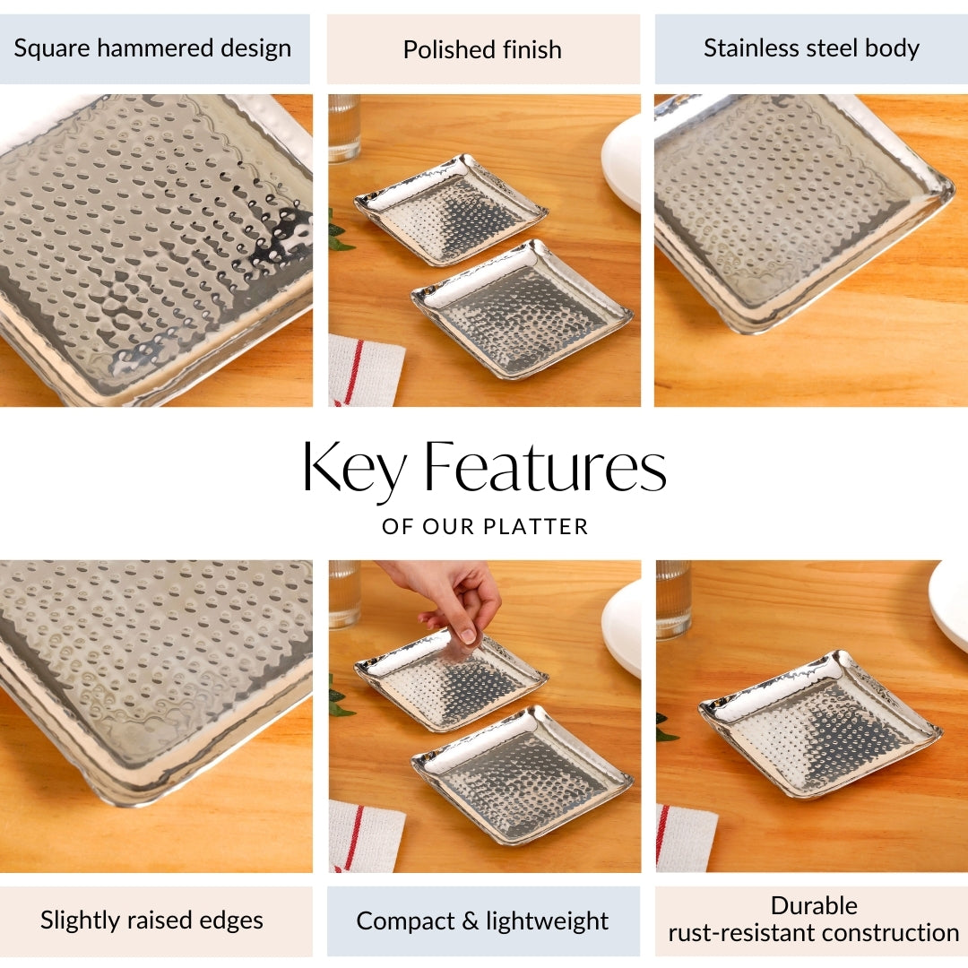 Benefits: Crafted from stainless steel, the platter resists rust and retains its shine even with frequent use. Its square shape with raised edges keeps food in place while allowing effortless serving. The set is designed to be nestable, with each piece fitting neatly inside the other for easy, space-saving storage. The hammered detailing lends a handcrafted charm, making the platter both a durable everyday essential and an elegant choice for gatherings.