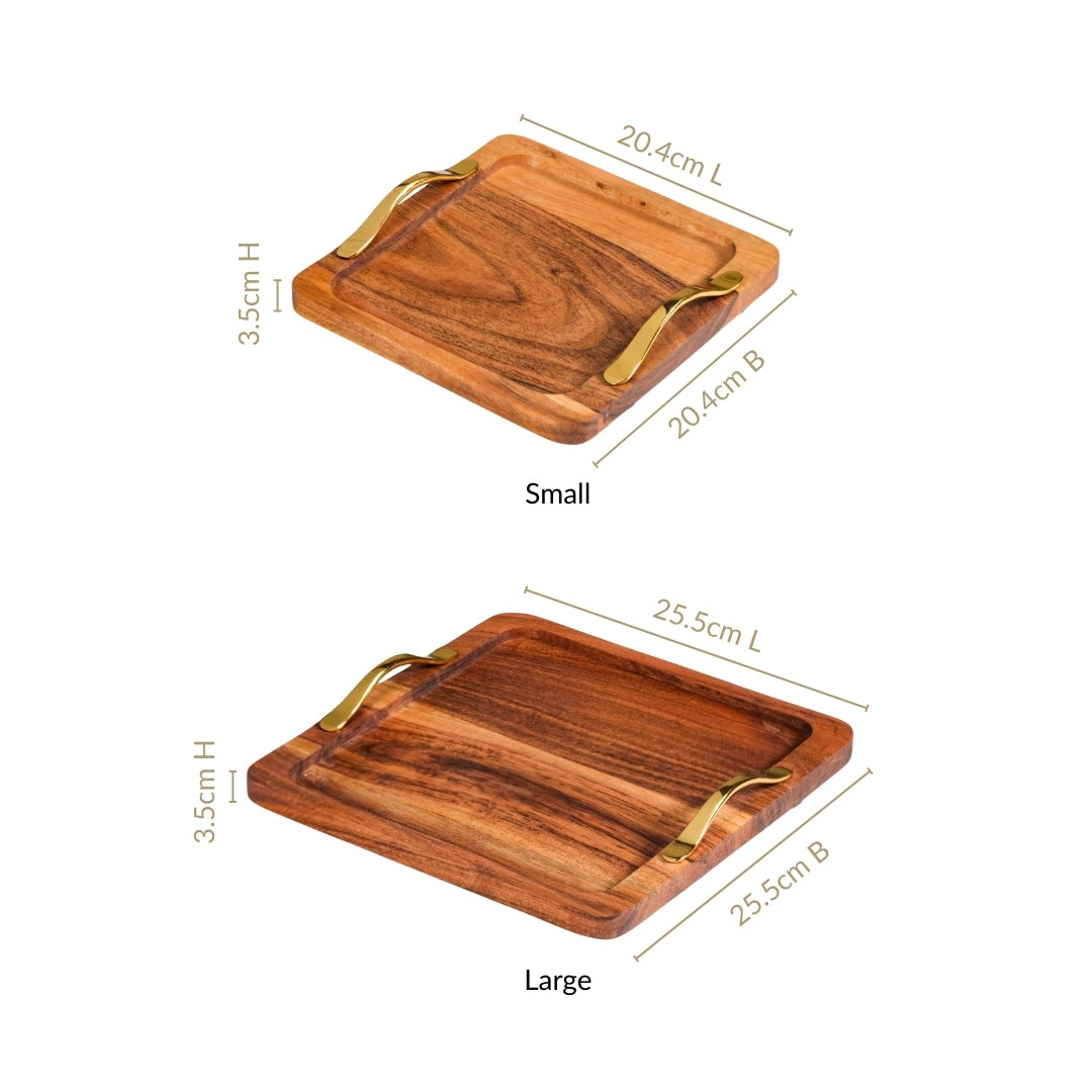 Design: Handcrafted from premium acacia wood, this square serving tray set of 2 highlights the natural grains and knots of the wood. The rich brown surface pairs beautifully with gleaming golden handles for a luxe finish. Slightly raised edges frame the trays, adding function by keeping items secure. Their clean, square silhouette makes them versatile for serving and styling. Available in two different sizes, the trays nest neatly when not in use. Made from 100% acacia wood, use a damp cloth to wipe and let it air dry for long-lasting use.