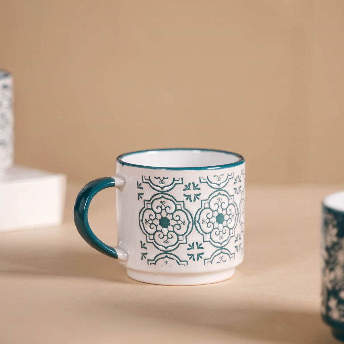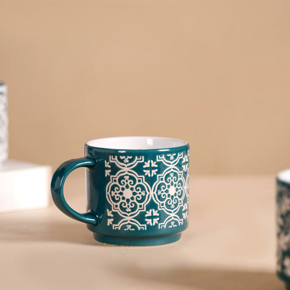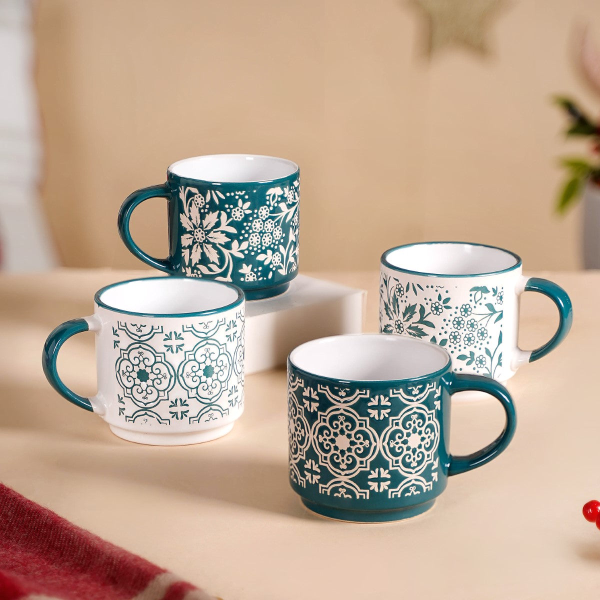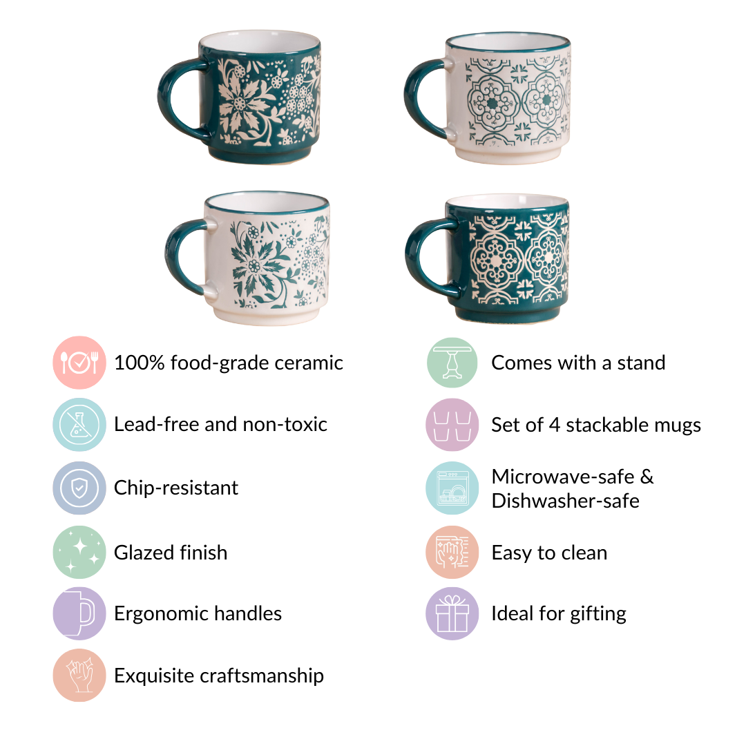 Introducing our floral relief stackable coffee mugs set of 4 in dark green and white – the epitome of style and practicality. This exquisite set boasts a unique pairing of dark green and white mugs, with two pairs featuring contrasting floral designs. Crafted from premium ceramic, each mug showcases impeccable creativity and craftsmanship. For tidy storage, we've included a convenient stand. These mugs are built to endure, being chip-resistant, microwave-safe, and dishwasher-safe. With a comfortable non-slip grip and a design, your coffee moments will always be mess-free and upgraded.