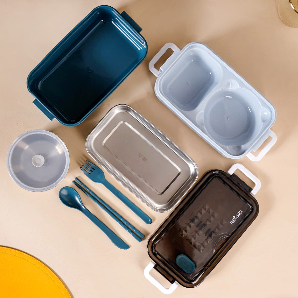 The top lid of the lunch box features a clever innovation - a built-in mobile holder. This addition allows you to enjoy a hands-free lunch break, as you can conveniently place your mobile device in the holder. Whether you're watching videos or catching up on emails, the mobile holder ensures that your device remains accessible.