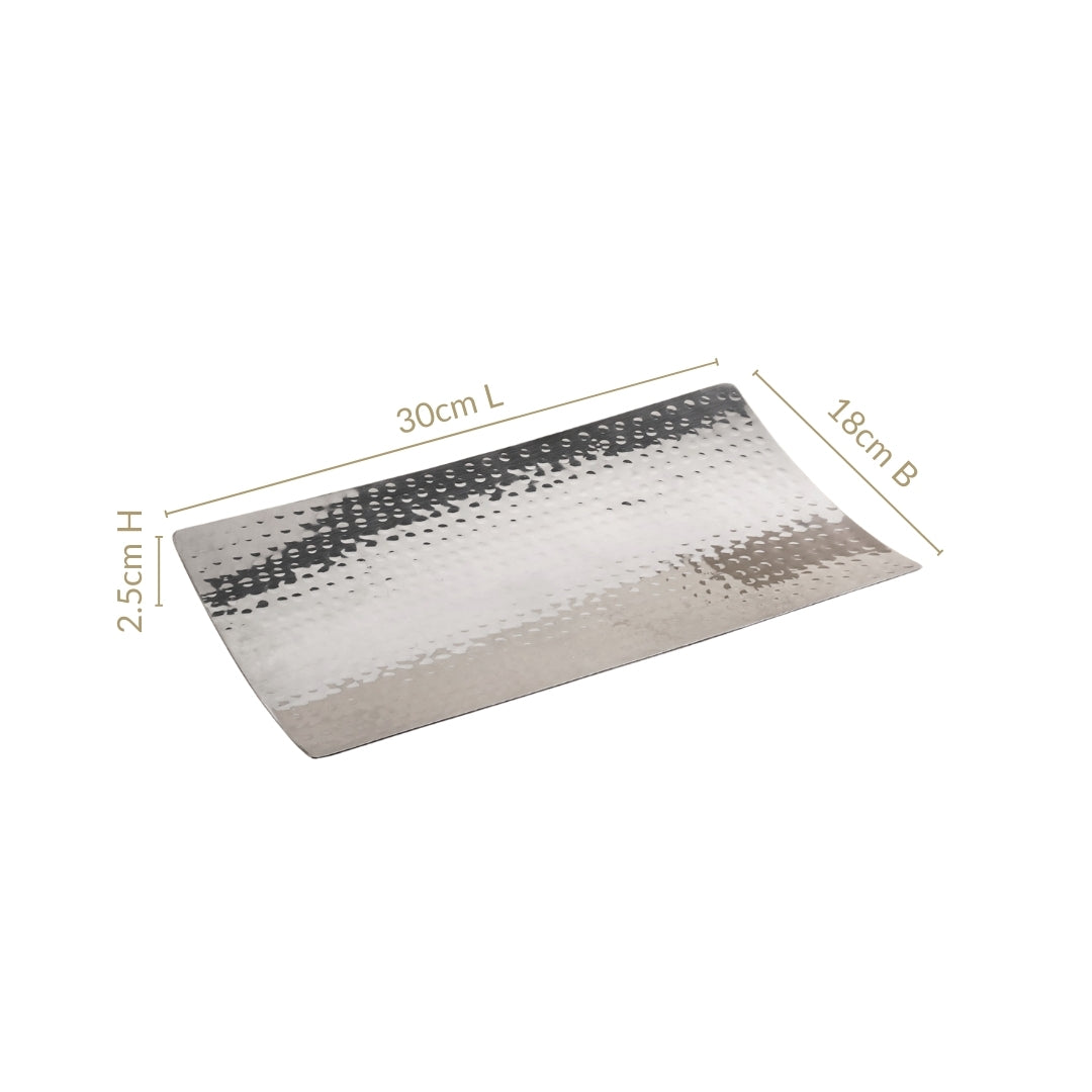Benefits: The stainless steel body ensures durability and easy upkeep while retaining its polished shine. The rectangular shape provides generous space for appetisers, desserts and breads. The hammered finish with raised ball stands enhances stability and gives the platter a refined, practical design for versatile use. Resistant to rust, scratches and corrosion, the platter is built to remain durable and maintain its reflective finish over time.