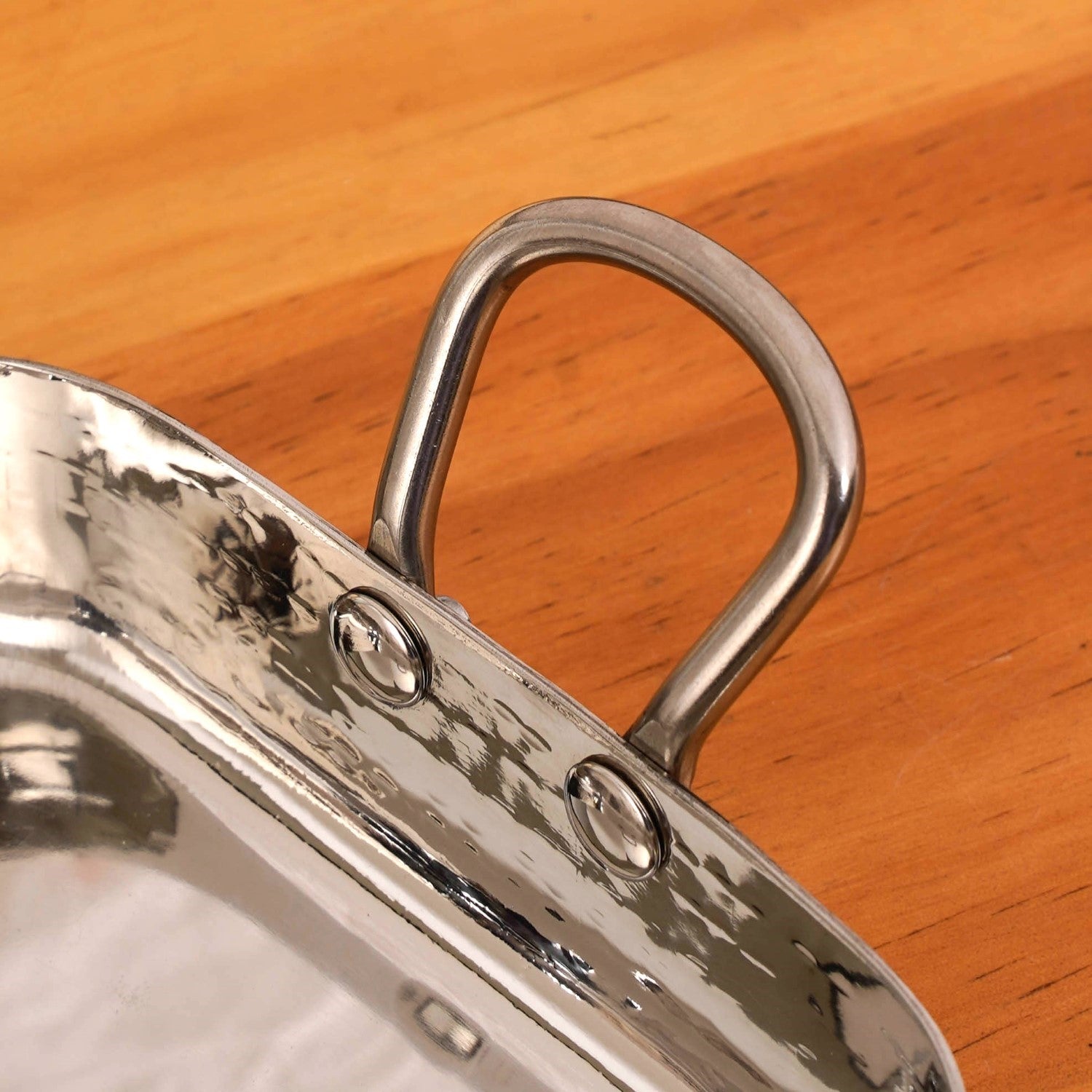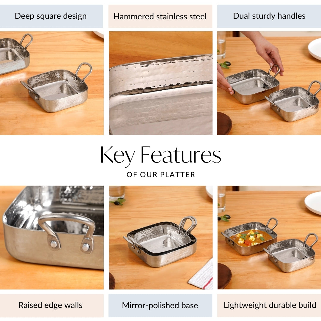 Design: This set of 2 includes square hammered stainless steel deep serving pans, each designed with a hand-beaten texture that glimmers under light. The reflective, mirror-polished interiors contrast beautifully with the hammered exteriors, while the deep walls and raised edges allow for generous, spill-free servings. Firmly attached looped handles ensure easy grip and handling, while the balanced, lightweight build makes each pan convenient to place and carry.
