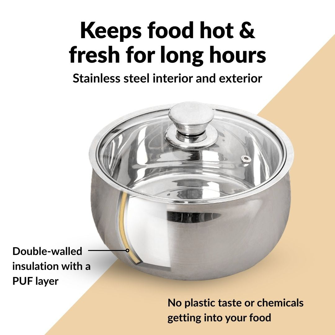 Design: The casserole features a rounded belly steel body paired with a transparent glass lid for a clear top view. A polished mirror finish exterior creates a clean look, while the deep curved storage shape forms a spacious interior. Thick, durable steel walls combine with a wide, sturdy rim edge for structure. The smooth food-grade interior maintains the purity of the contents. An integrated steam vent hole sits on the lid, finished with an easy-grip lid knob and a generous capacity suited for daily storage.