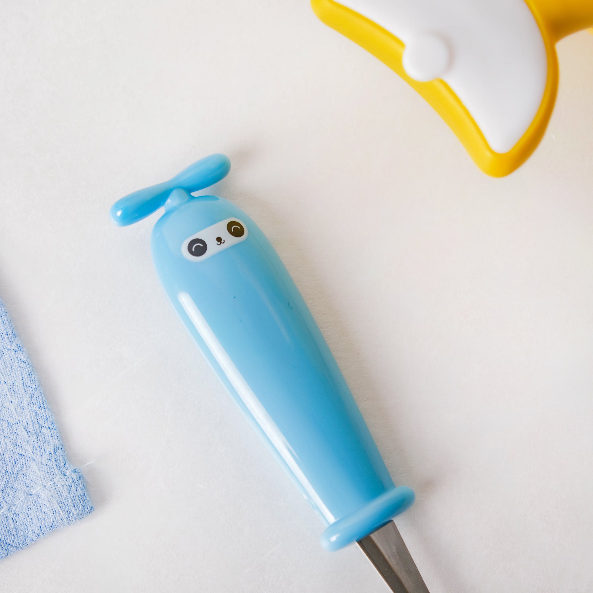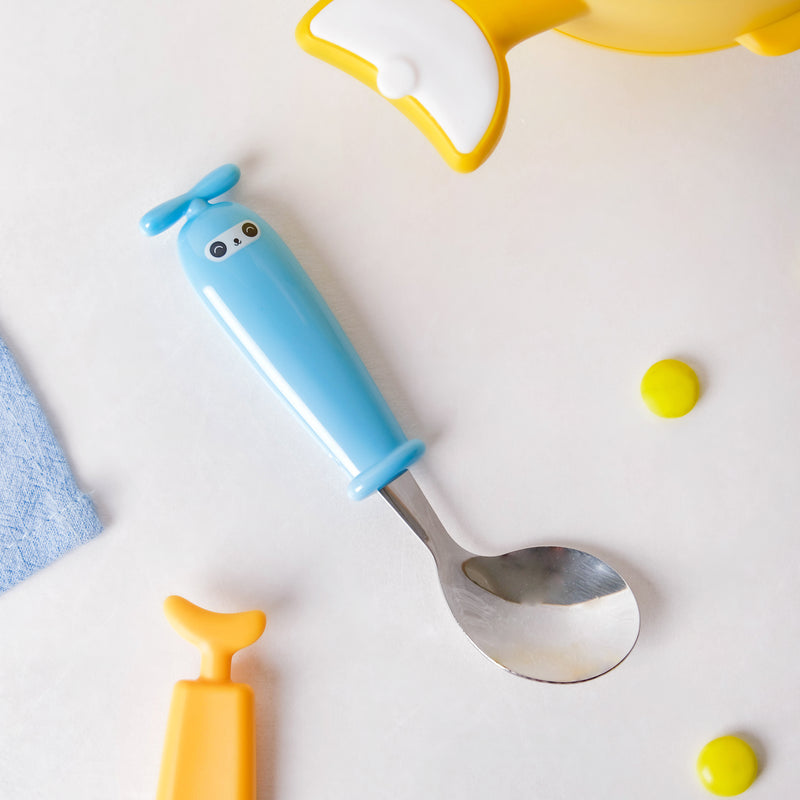 The vibrant blue stainless steel spoon with two little eyes is ideal for kids to enjoy a fun and frolic snack time. The broad handle of the spoon is designed to fit in the kid's tiny hands and to improve grip. One can have mashed food, rice, soup, stew, steamed veggies, porridge, and a lot more with this kid's spoon.