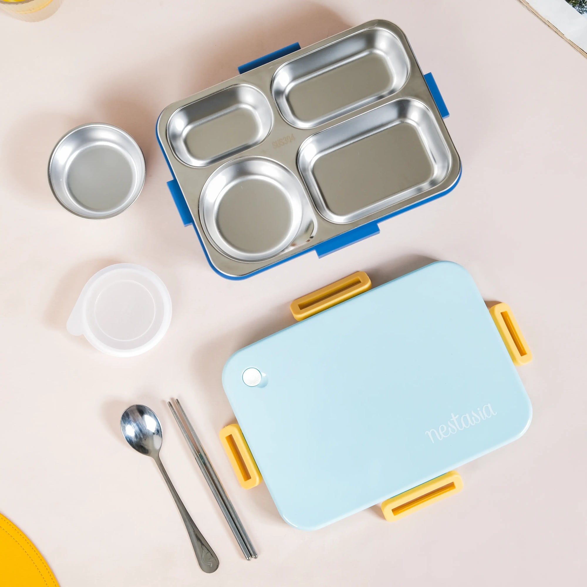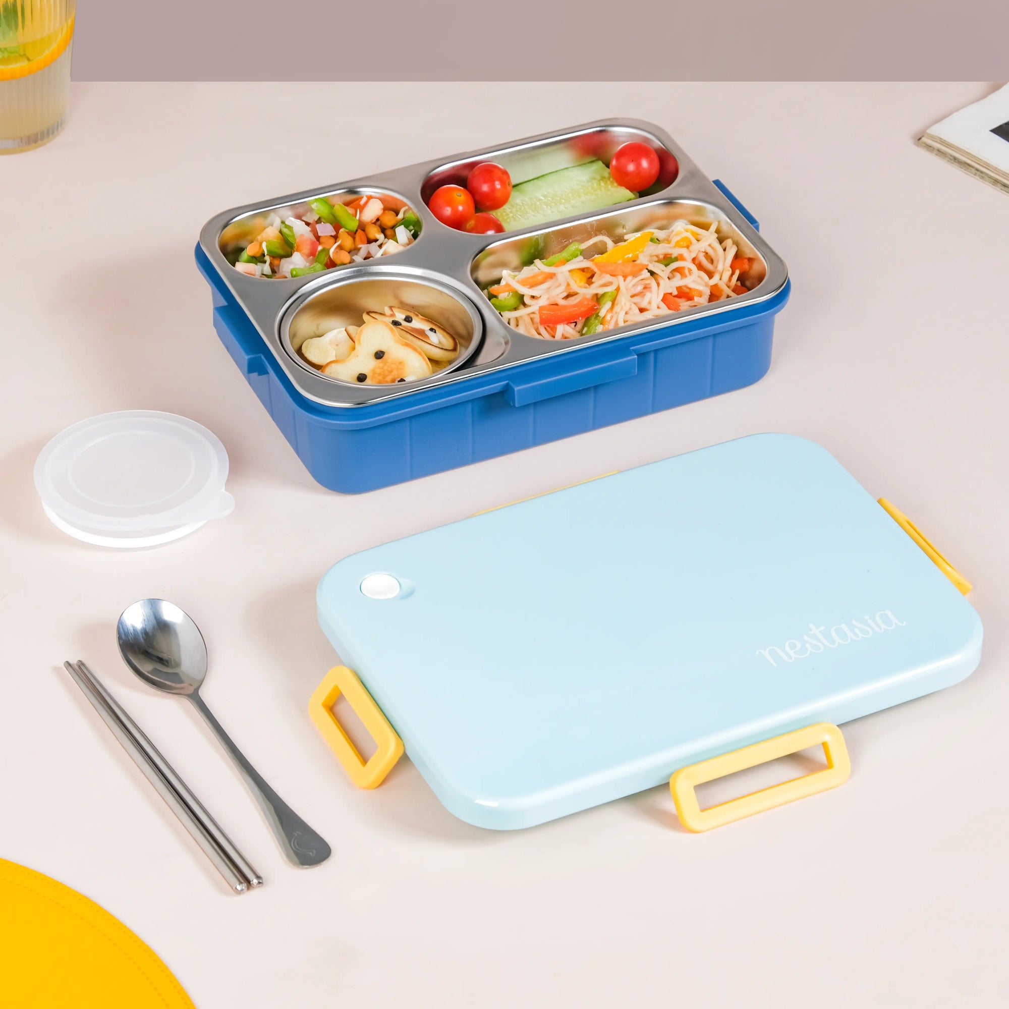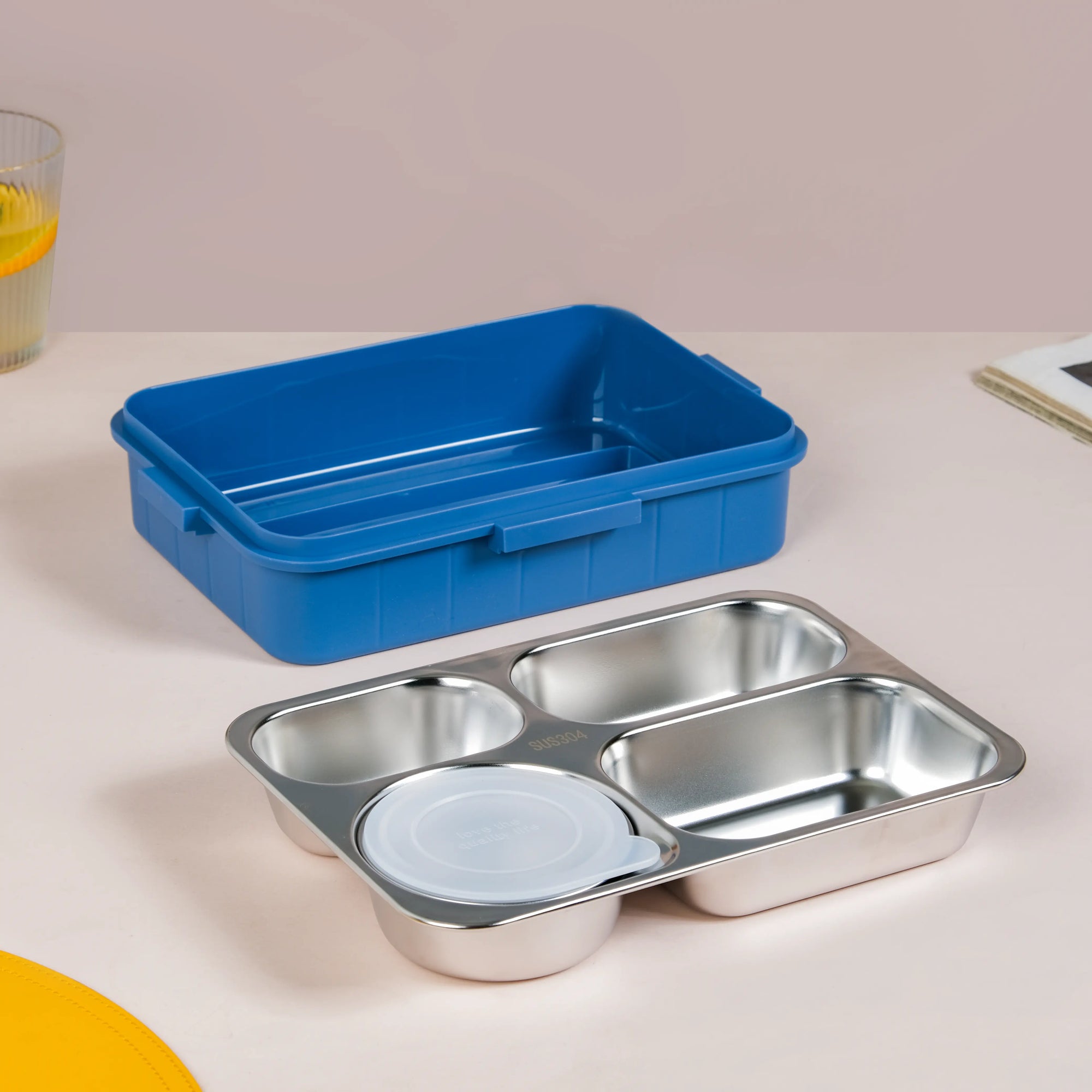 Revolutionise your lunch routine with our stainless steel lunch box, the perfect blend of style, safety, and versatility. Crafted from top-tier 304-grade stainless steel, this lunch box offers unparalleled durability and hygiene. Featuring four compartments, a removable stainless steel bowl with an airtight lid, and a detachable upper tray, it ensures your meals stay fresh and organised. The airtight PVC lid, secured with clip locks on all sides and a removable silicone gasket, guarantees superb freshness. Complete with a stainless steel spoon, chopsticks, and a steam release vent, it's your ideal food companion.