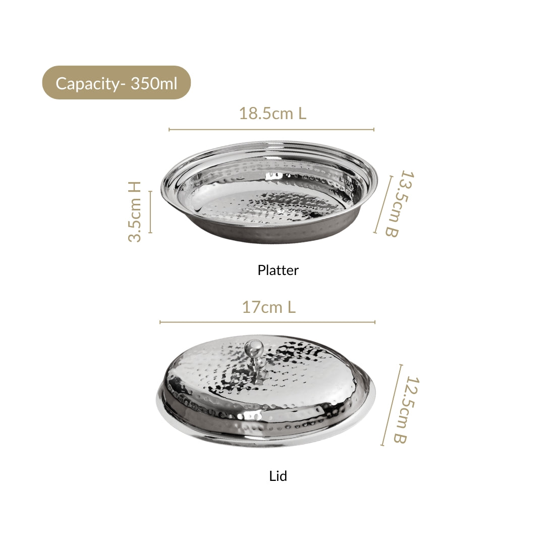 Benefits: More than just stylish, this hammered stainless steel serving dish is designed for practicality. The lid helps retain warmth and freshness, making it ideal for serving Indian curries, snacks, or even sweets. Its stainless steel build ensures durability, resisting scratches, stains, and rust for long-lasting use. The oval shape provides generous space while remaining compact enough for easy placement on dining tables or buffets. Lightweight yet strong, it’s easy to carry, serve, and clean.