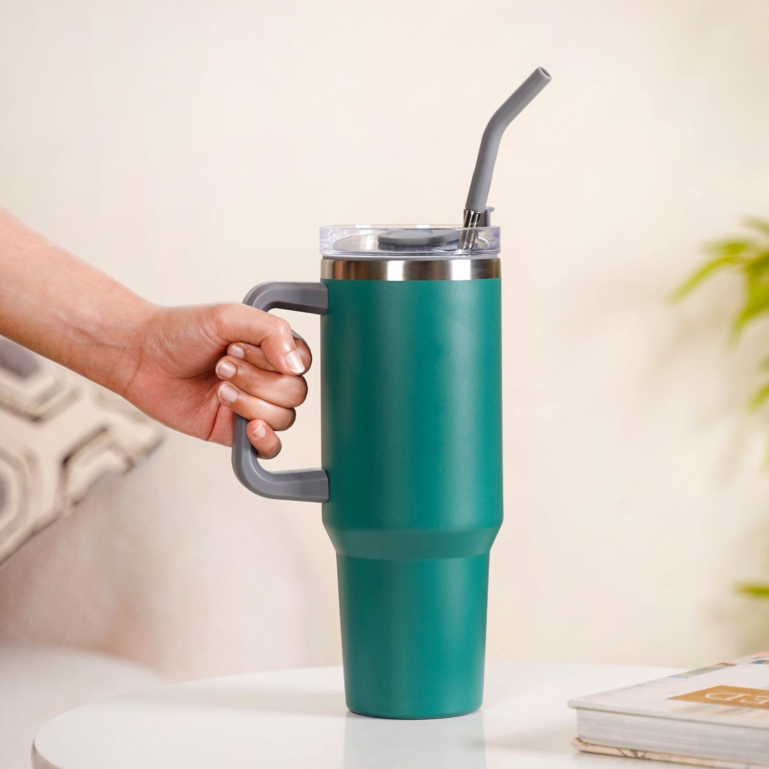 Design: The sleek teal water bottle features a smooth powder-coated matte finish for a modern look and easy grip. It includes an ergonomic handle for effortless portability, along with a leakproof top lid that has space to insert a straw for comfortable sipping. The gym water bottle comes with a set of accessories - 1 PP straw, 1 metal straw, 1 silicone straw head, and a straw cleaner - providing versatile drinking options for any situation.