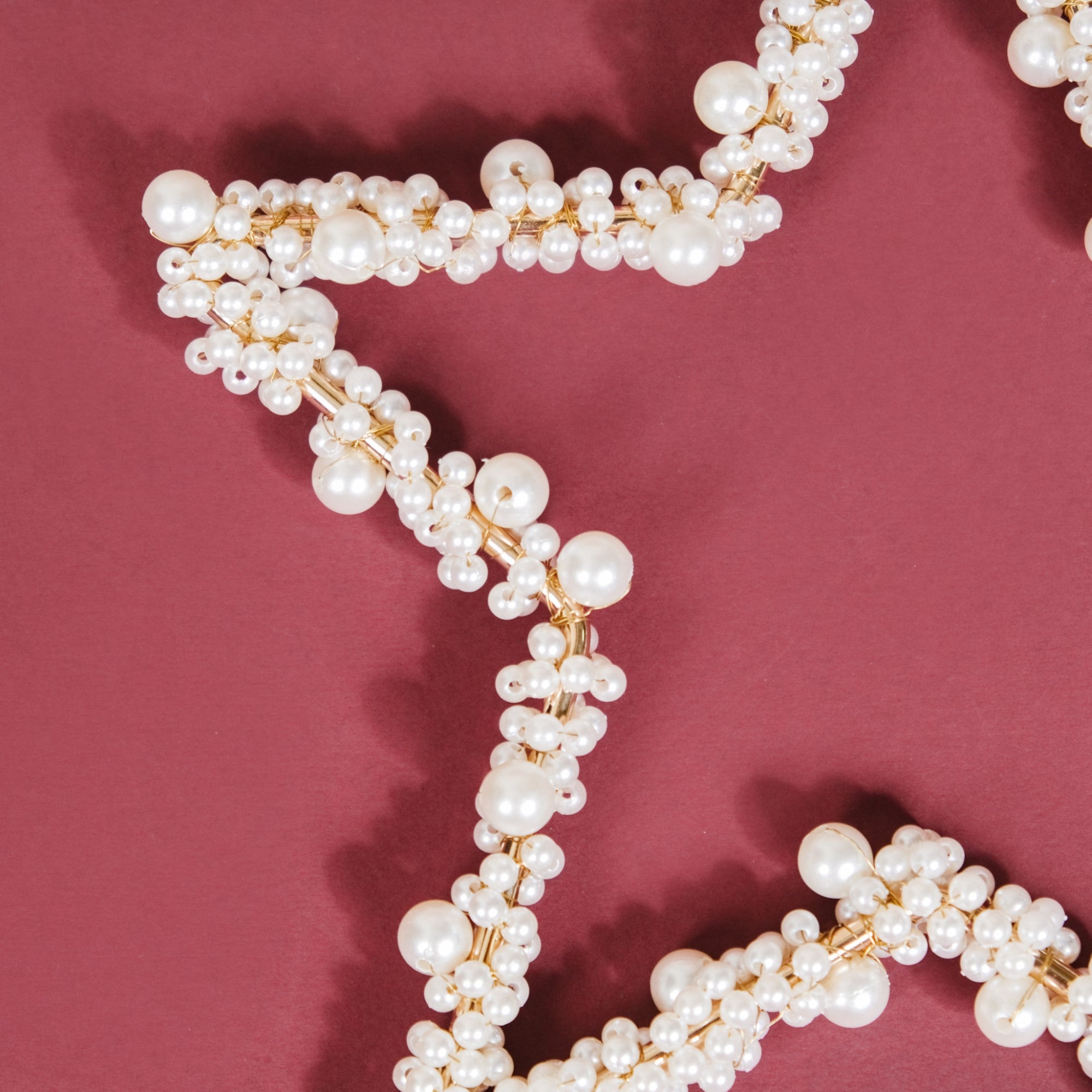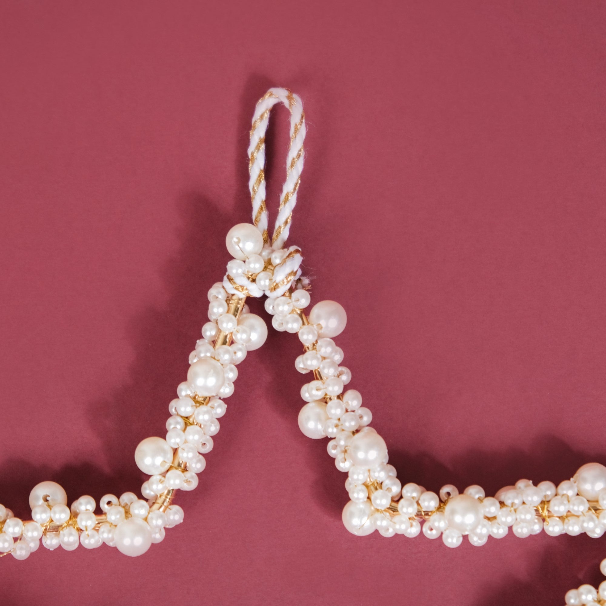 The star-shaped Christmas wreath is meticulously crafted with a sturdy metal frame as its foundation, ensuring durability and longevity for years to come. The luxurious silver pearls, meticulously arranged, are held in place by coils of durable gold string, adding a touch of opulence to its overall charm.