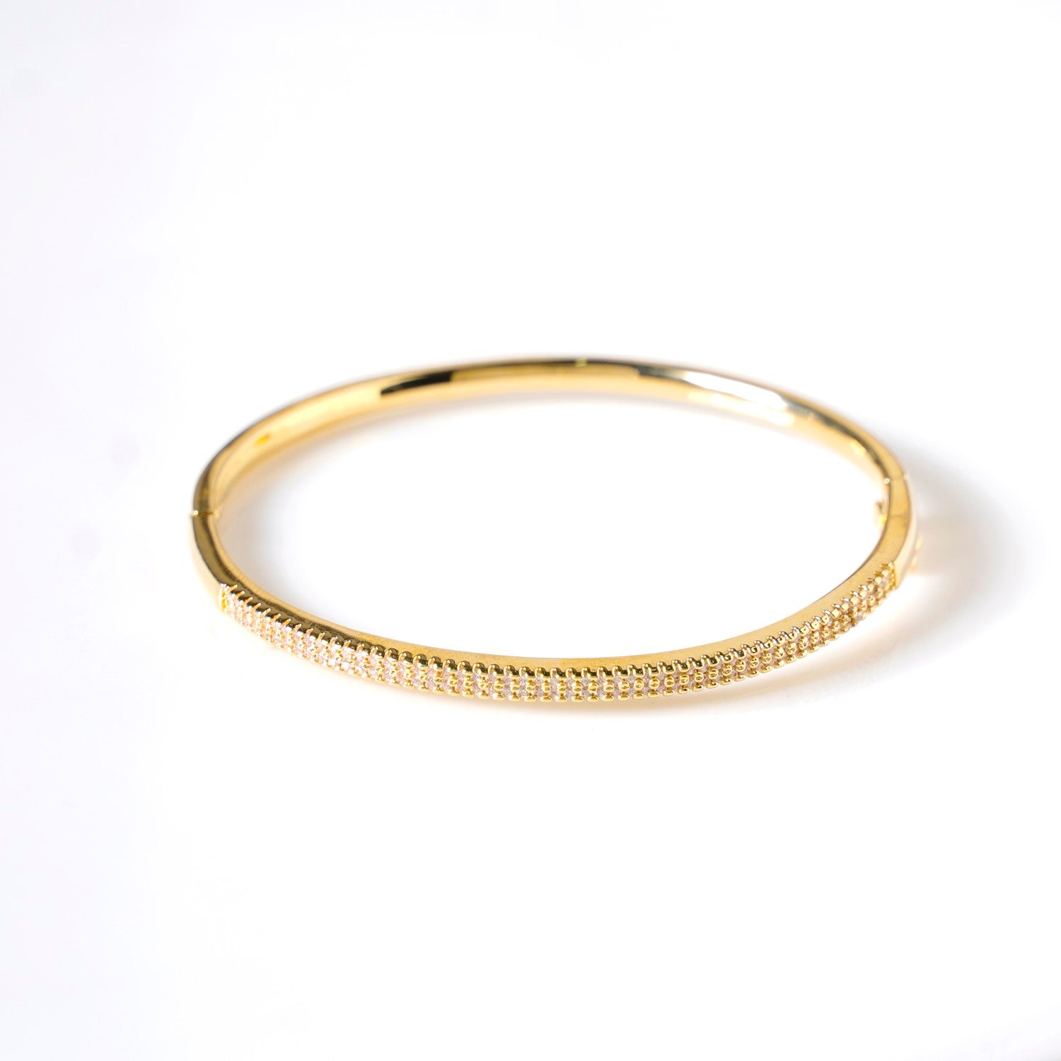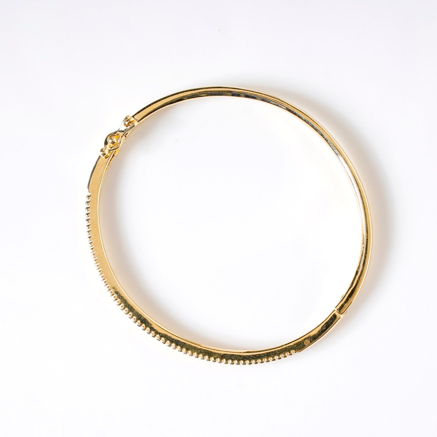 This gold-toned bracelet is pure radiance wrapped around your finger. A stunning array of shimmering, crusted stones graces the front, creating a mesmerising play of light with every movement. Bold yet refined, this piece strikes the perfect balance between timeless elegance and modern charm. Whether you're elevating a casual look or adding the final touch to a glamorous outfit, this bracelet is your go-to for effortless sophistication with a golden glow.