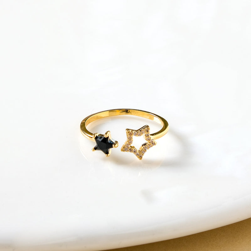 A cosmic masterpiece of shimmer and sophistication, this silver bypass ring is designed to enchant with its celestial charm. The sleek silver band elegantly twists around the finger, creating a fluid and modern silhouette. One end is adorned with a luminous silver star-shaped stone, symbolizing brilliance and radiance. On the other, a delicate openwork star, encrusted with twinkling stones, adds a dreamy touch of sparkle. Balancing bold design with celestial grace, this ring is a statement piece for those who find beauty in the stars and elegance in every detail.