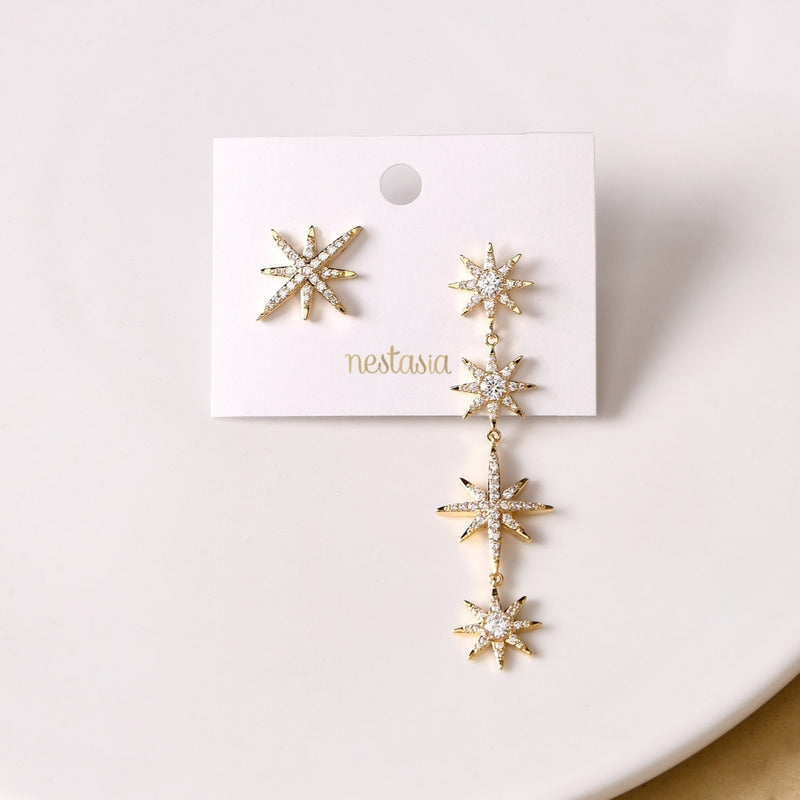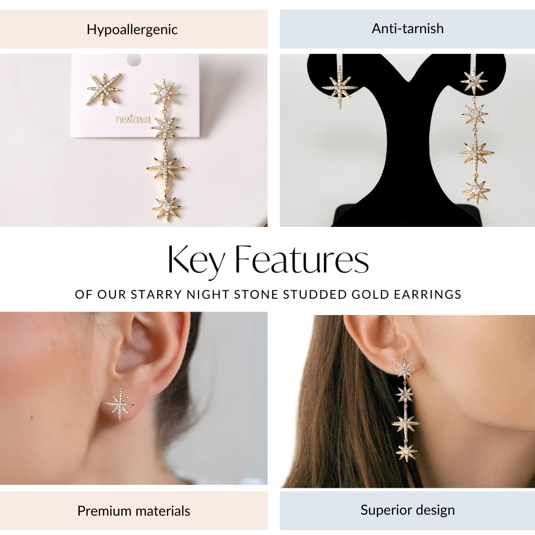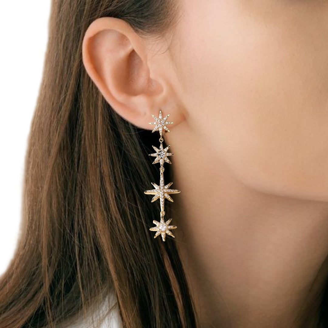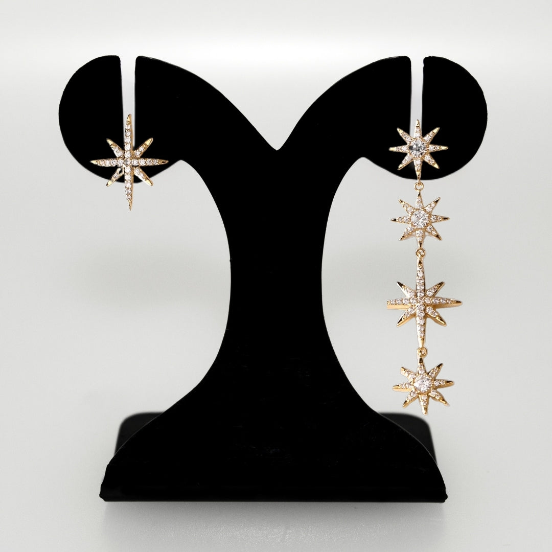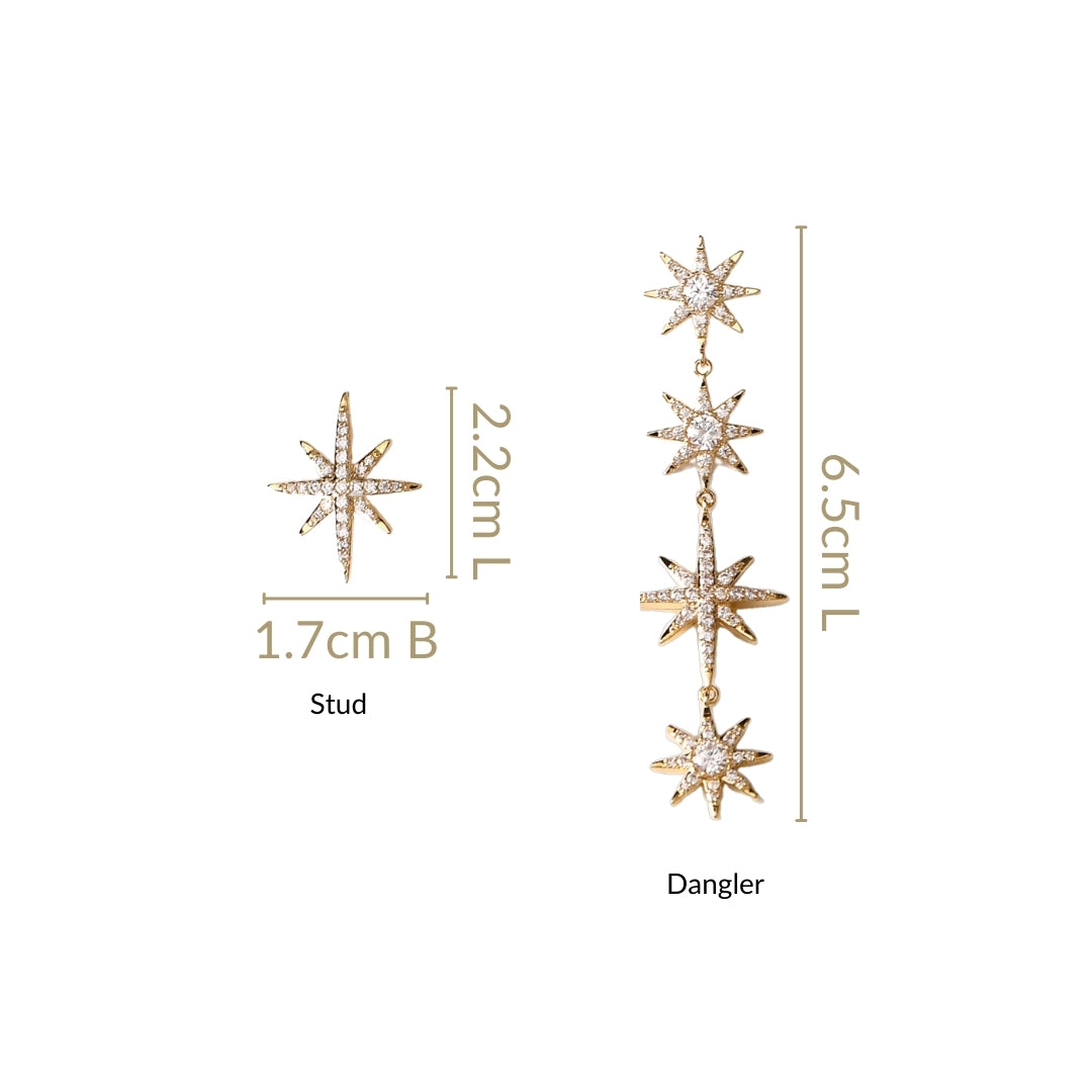 Illuminate your look with these stunning gold-toned metal earrings, featuring a unique design that combines a shimmering stud and an eye-catching dangler, shaped like a cluster of twinkling stars. Adorned with dazzling stone accents, these earrings capture the essence of a starry night sky, bringing a touch of celestial charm to any outfit. Inspired by the beauty and wonder of the cosmos, they are perfect for adding a touch of elegance to both day and evening wear. Whether you’re dressing up for a special occasion or simply want to sparkle every day, these earrings are a stellar choice!