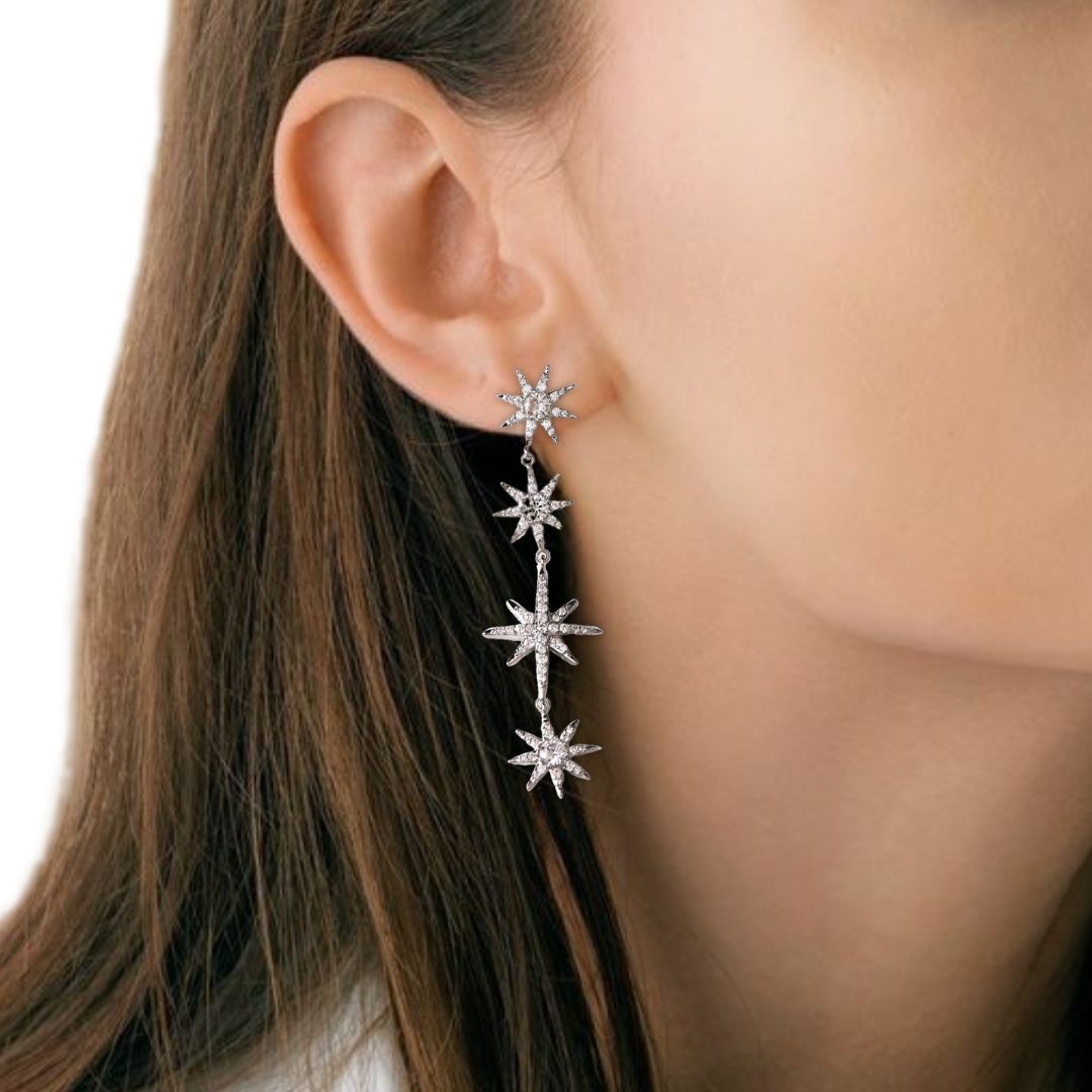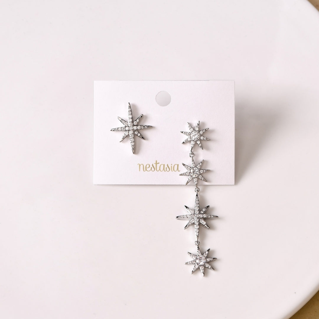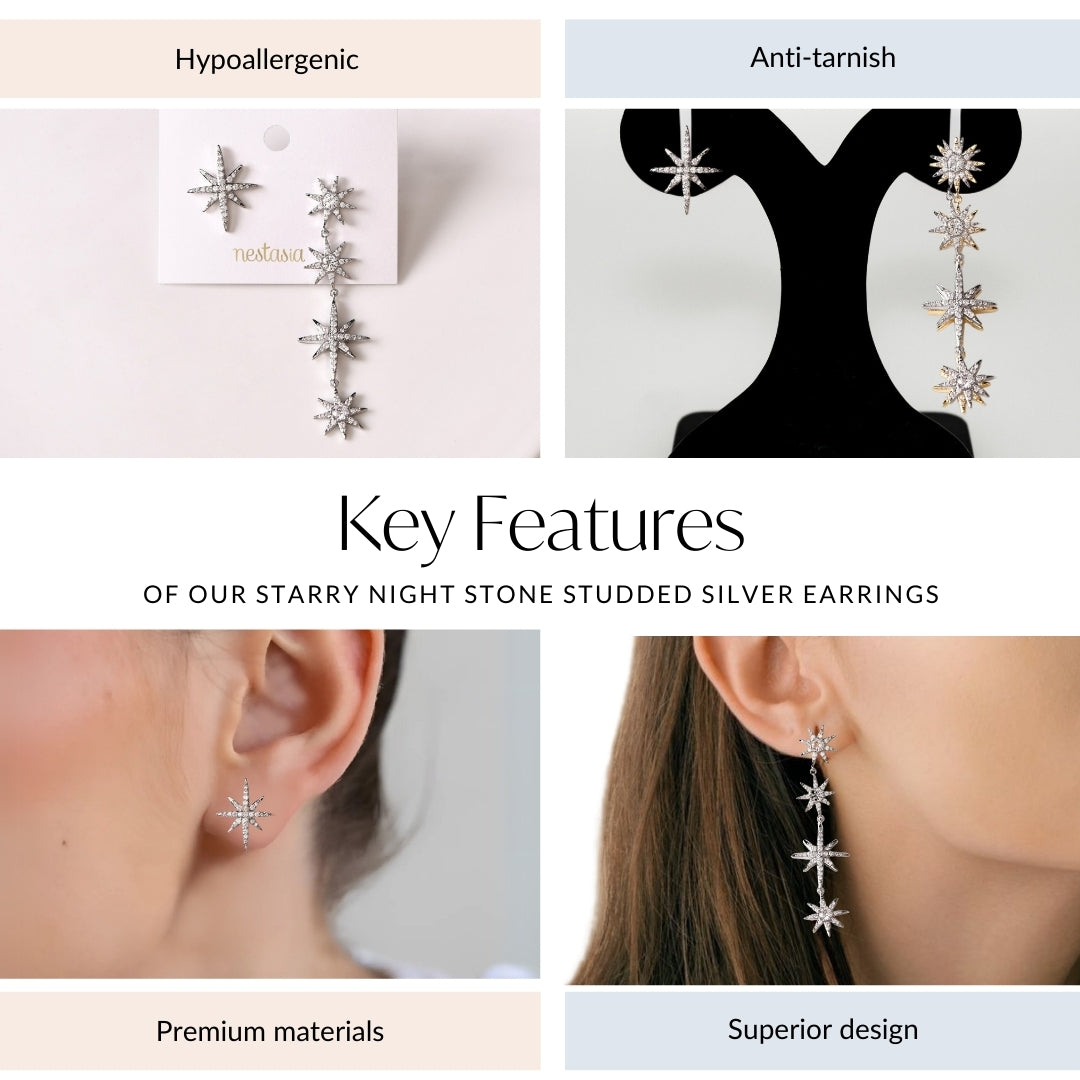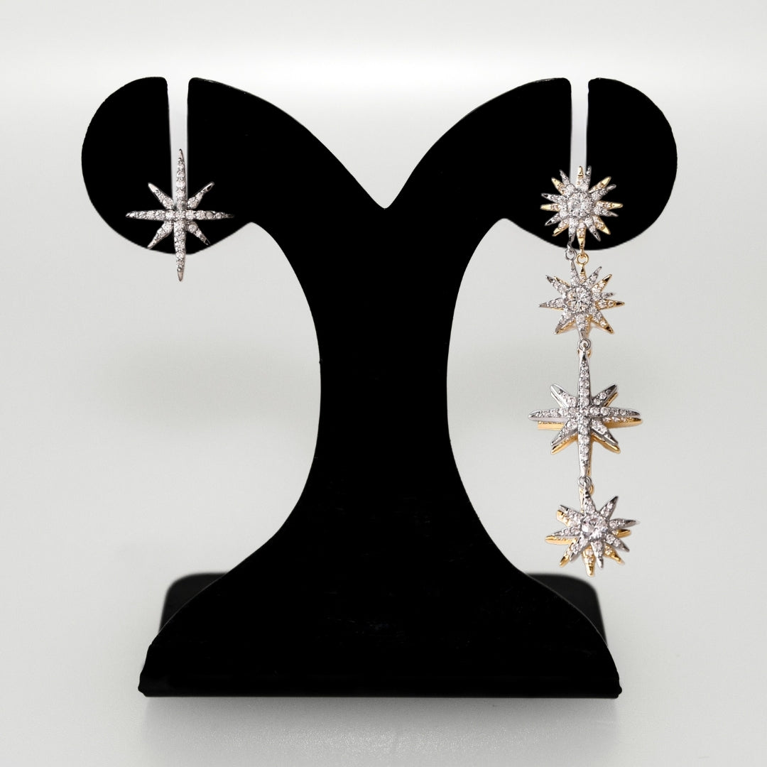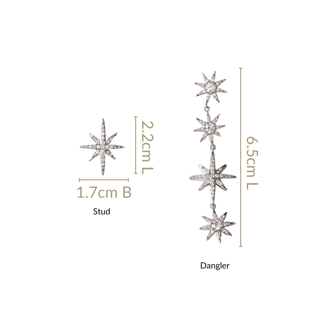 Add a touch of celestial elegance to your collection with these stunning silver-toned metal earrings. Featuring a stylish combination of a shimmering stud and a dynamic dangler, the design showcases a cluster of twinkling stars adorned with sparkling stone accents. Inspired by the beauty of the night sky, these earrings capture the enchanting essence of starlight, making them perfect for both special occasions and everyday wear. Whether you're dressing up for a night out or adding a dash of glamour to your casual look, these earrings will effortlessly elevate your glamour and charm.