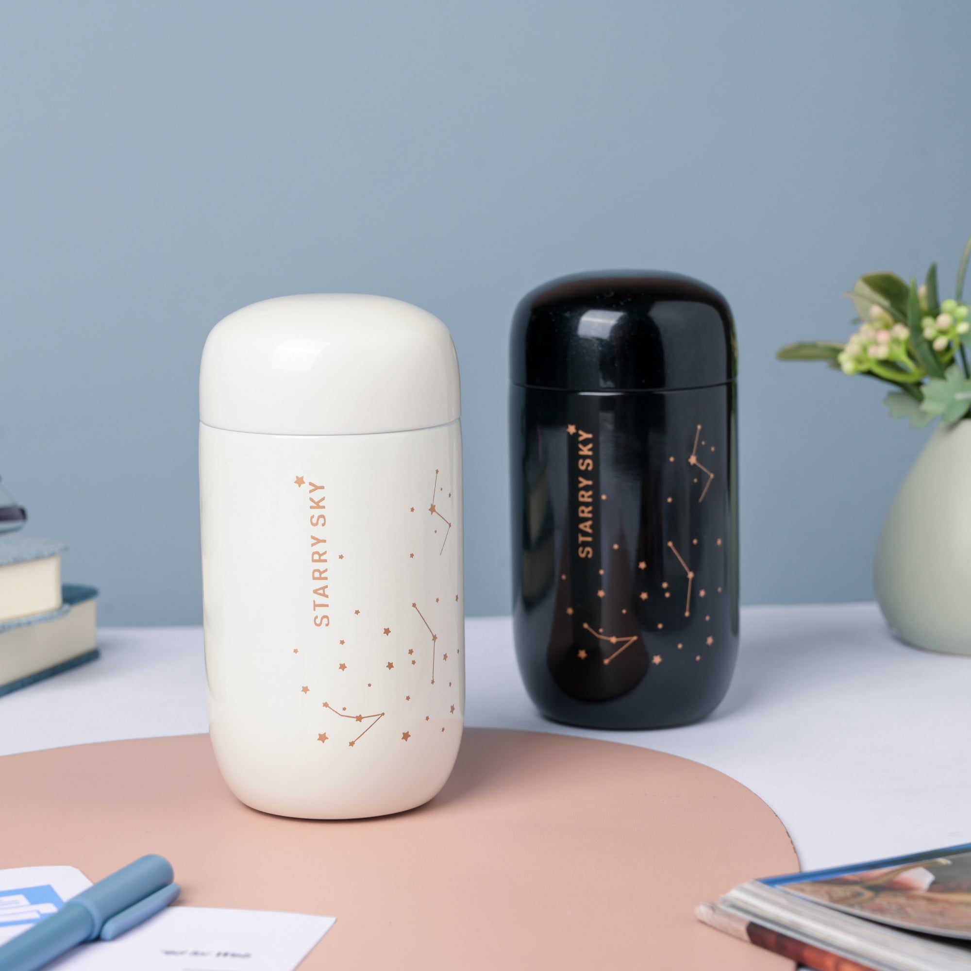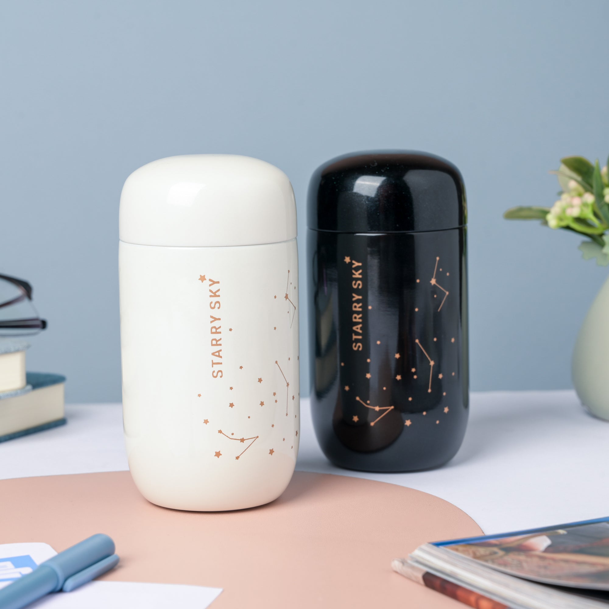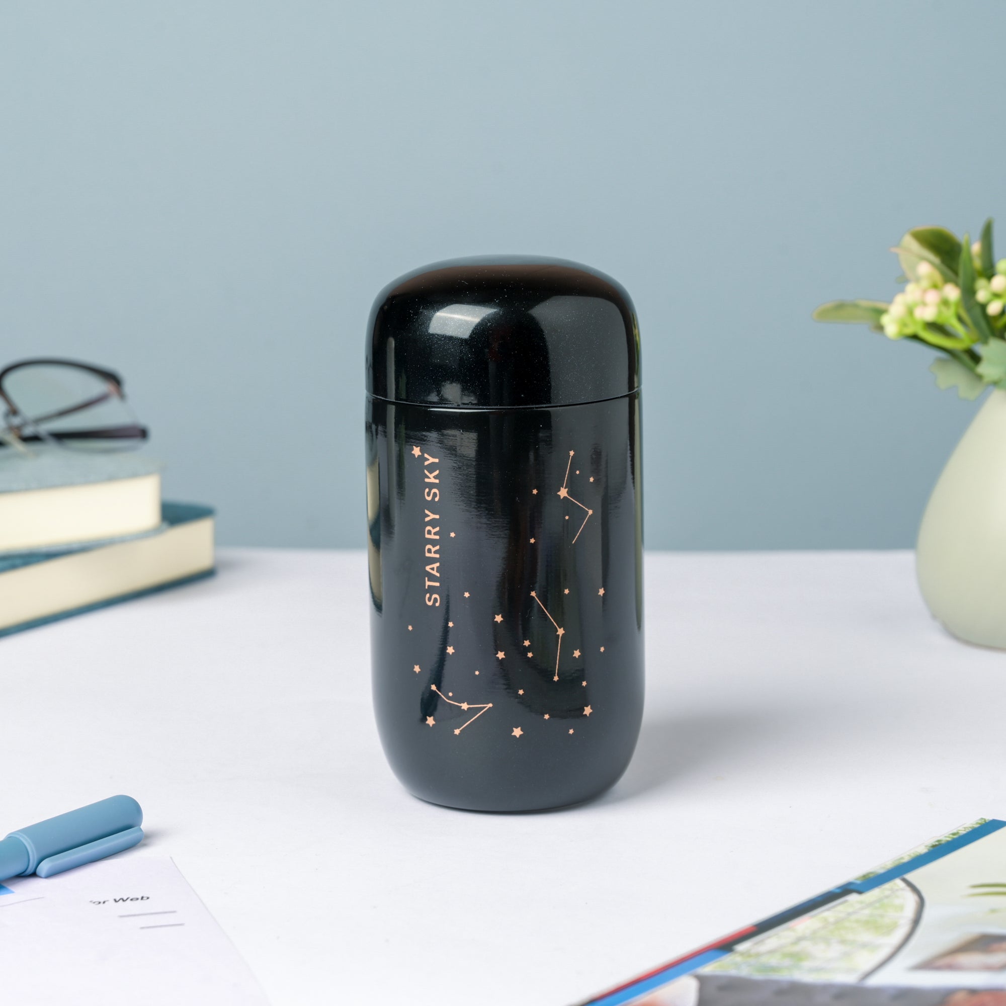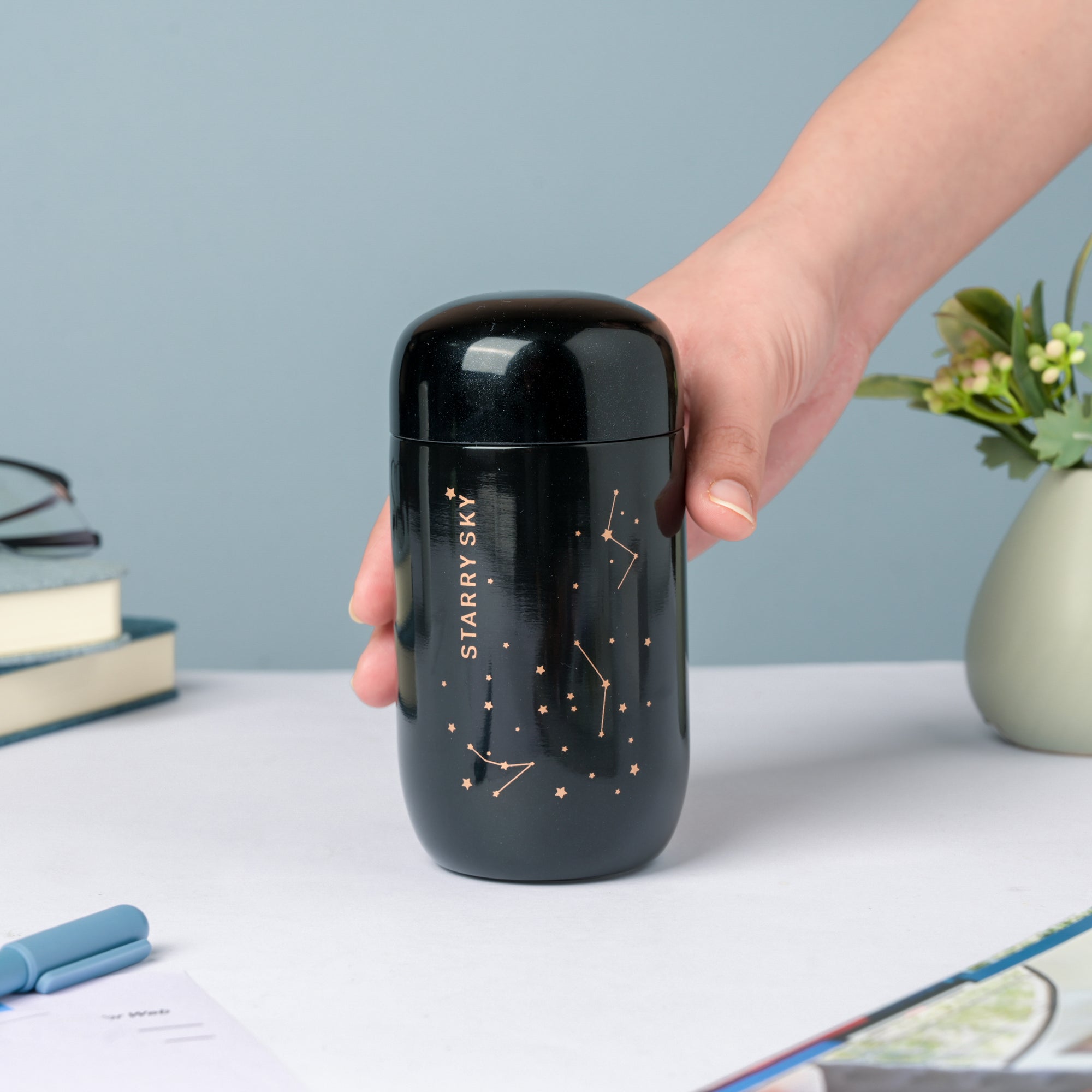 It's a blue blanket filled with wondering and unknowns. Even though we can never trace their origins accurately, we can't stop admiring the little twinkles. The mini flask is wrapped with a covet of sparkling stars on its outer surface if you look closely, and a vibrant brown-colored constellation. The flask is best for carrying your favorite flavored beverage- hot/chilled.