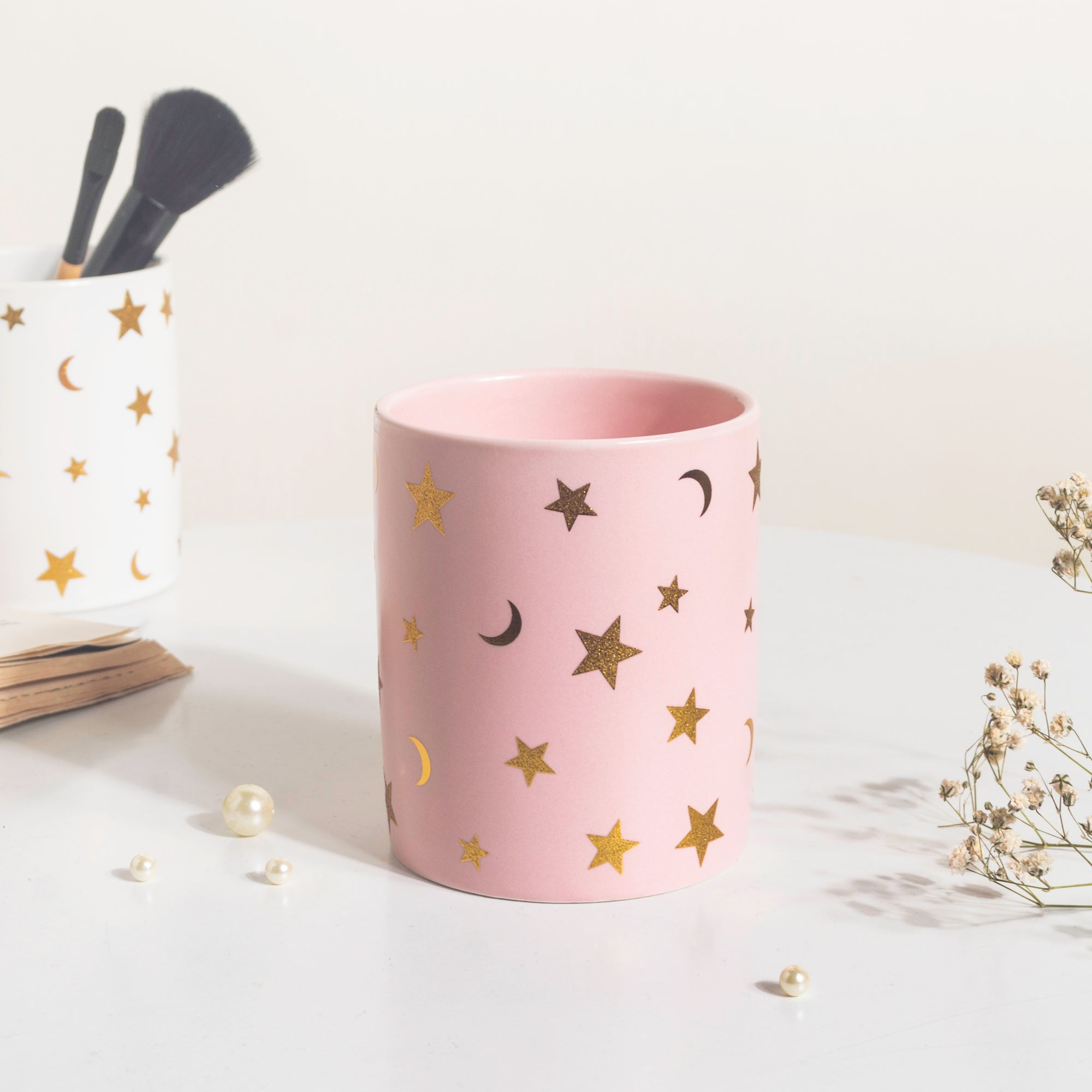 Adorned with gold stars and moons to add a quirky vibe to the surface of the ceramic organiser, it can be placed to brighten up the workstation or simply liven up a corner. The subtle pink colour of the container can also be used as a planter and will perfectly complement the bright green colours of the leaves placed in the planter. The organiser's design is a combination of a modern finish with glam patterns that is suitable for both modern and lush home interiors.