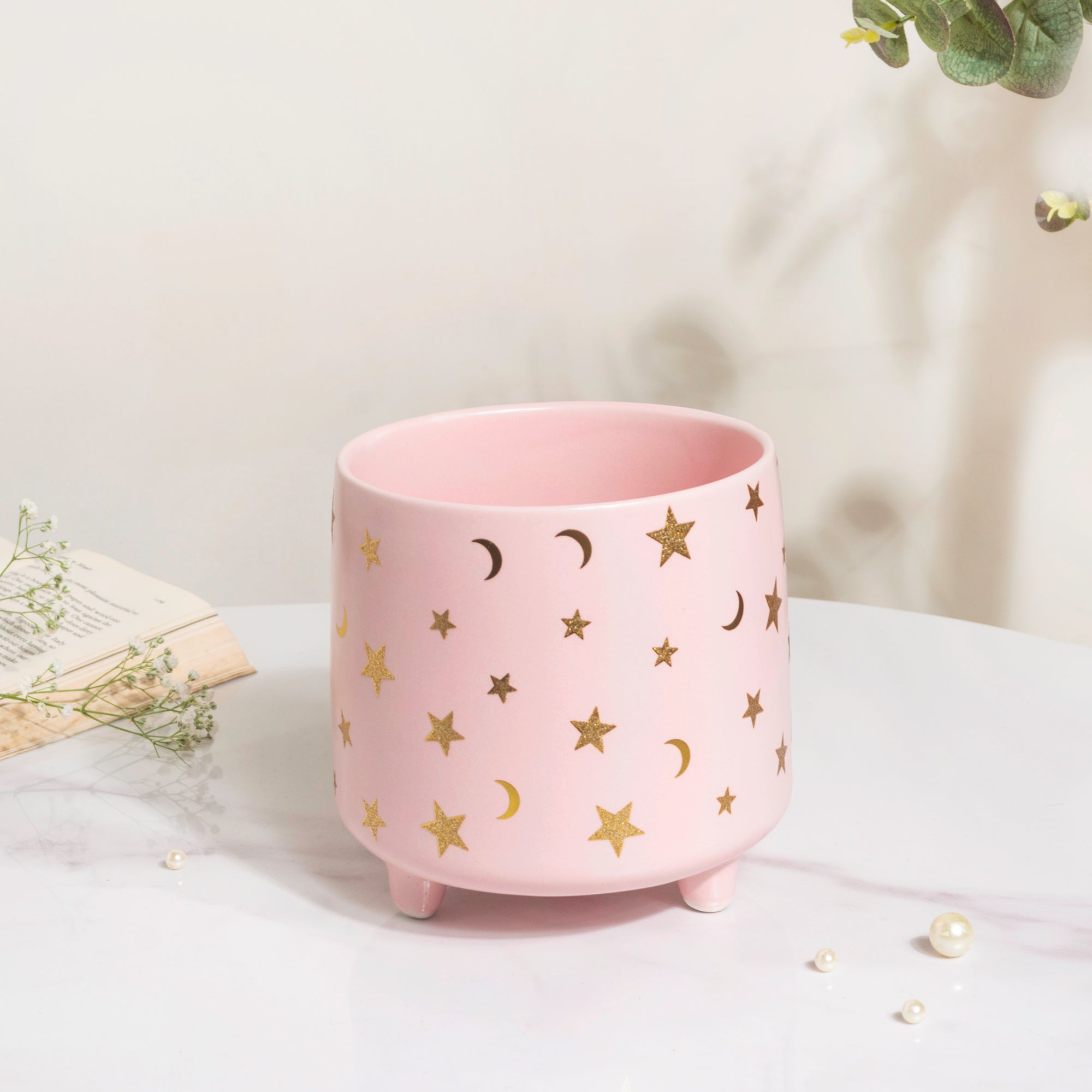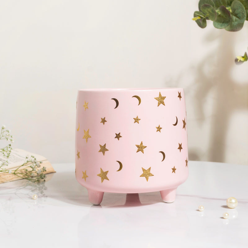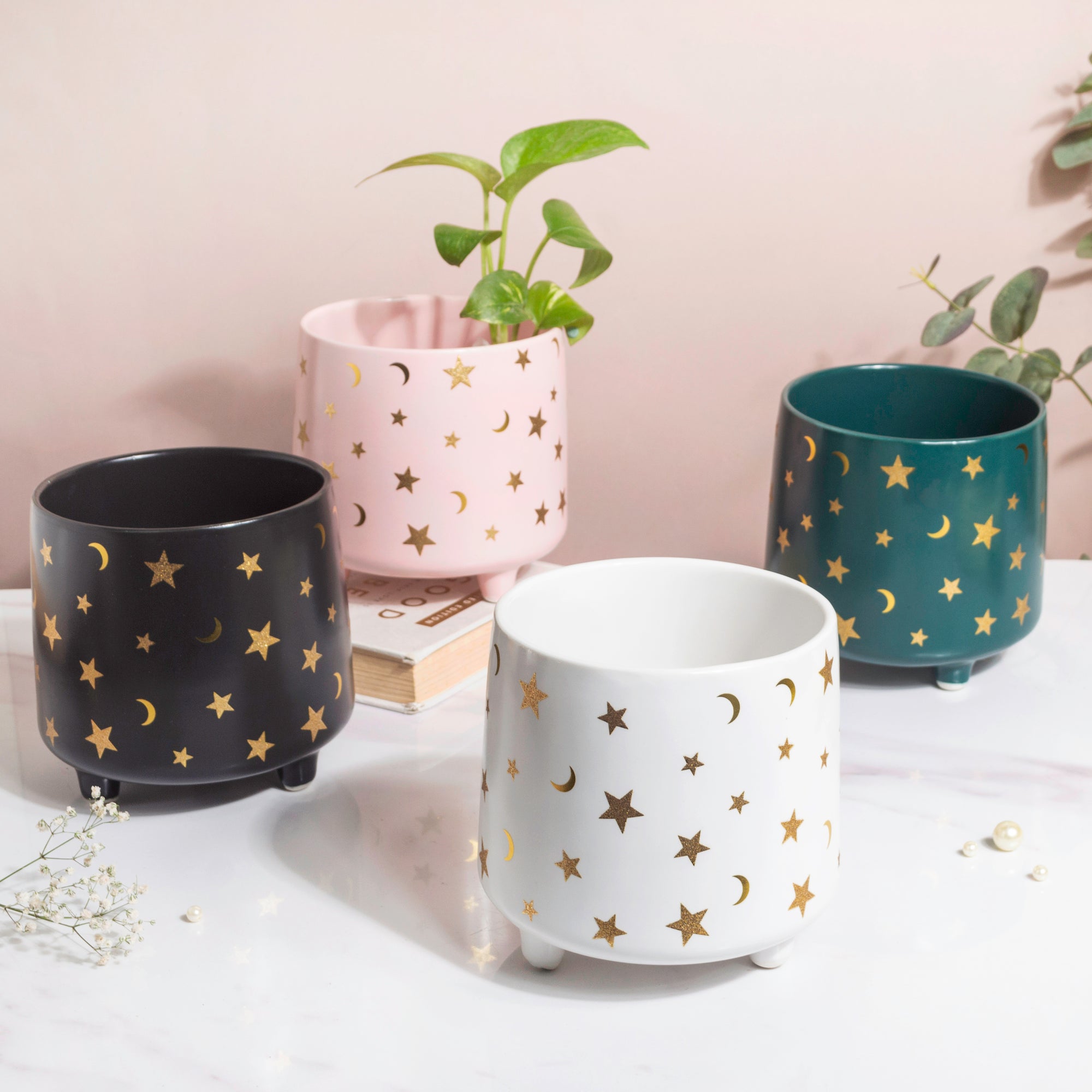 The large round ceramic pot in glazed ceramic is a must-have in every contemporary decor. Embellished with gold moons and stars, the ceramic pot with stand is a great addition to the contemporary home decor. From indoor garden to tea table- the ceramic planter is a versatile decor piece for all interiors.