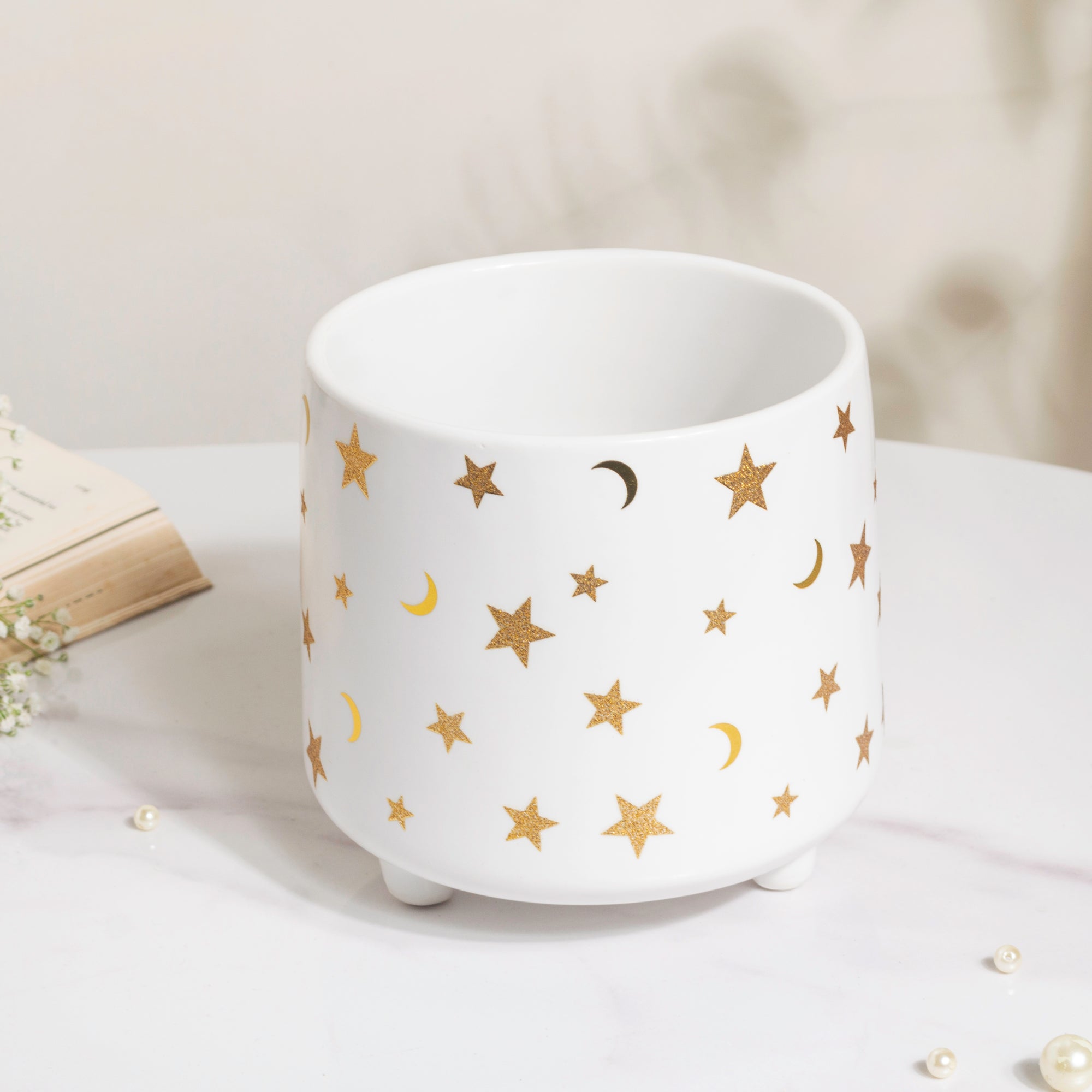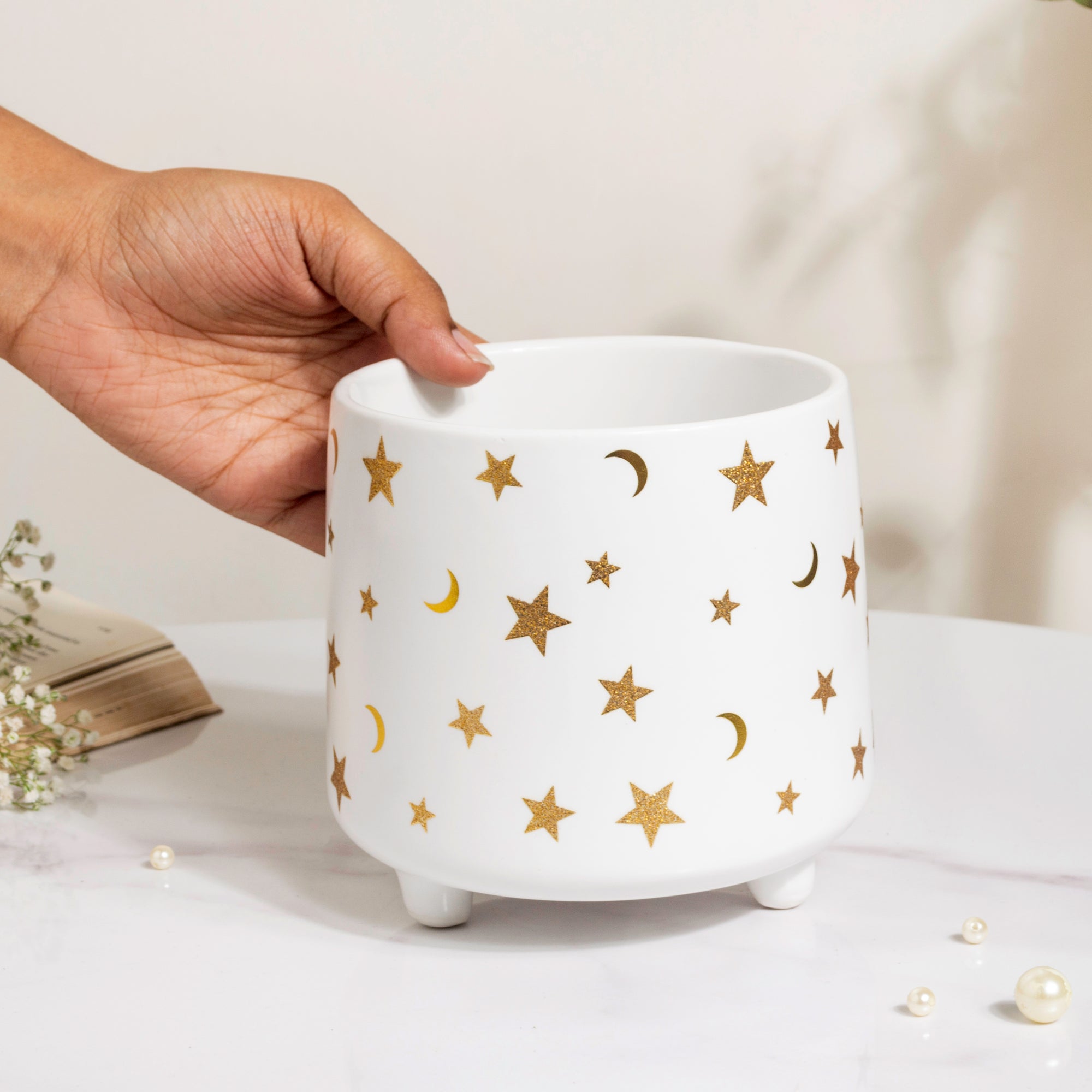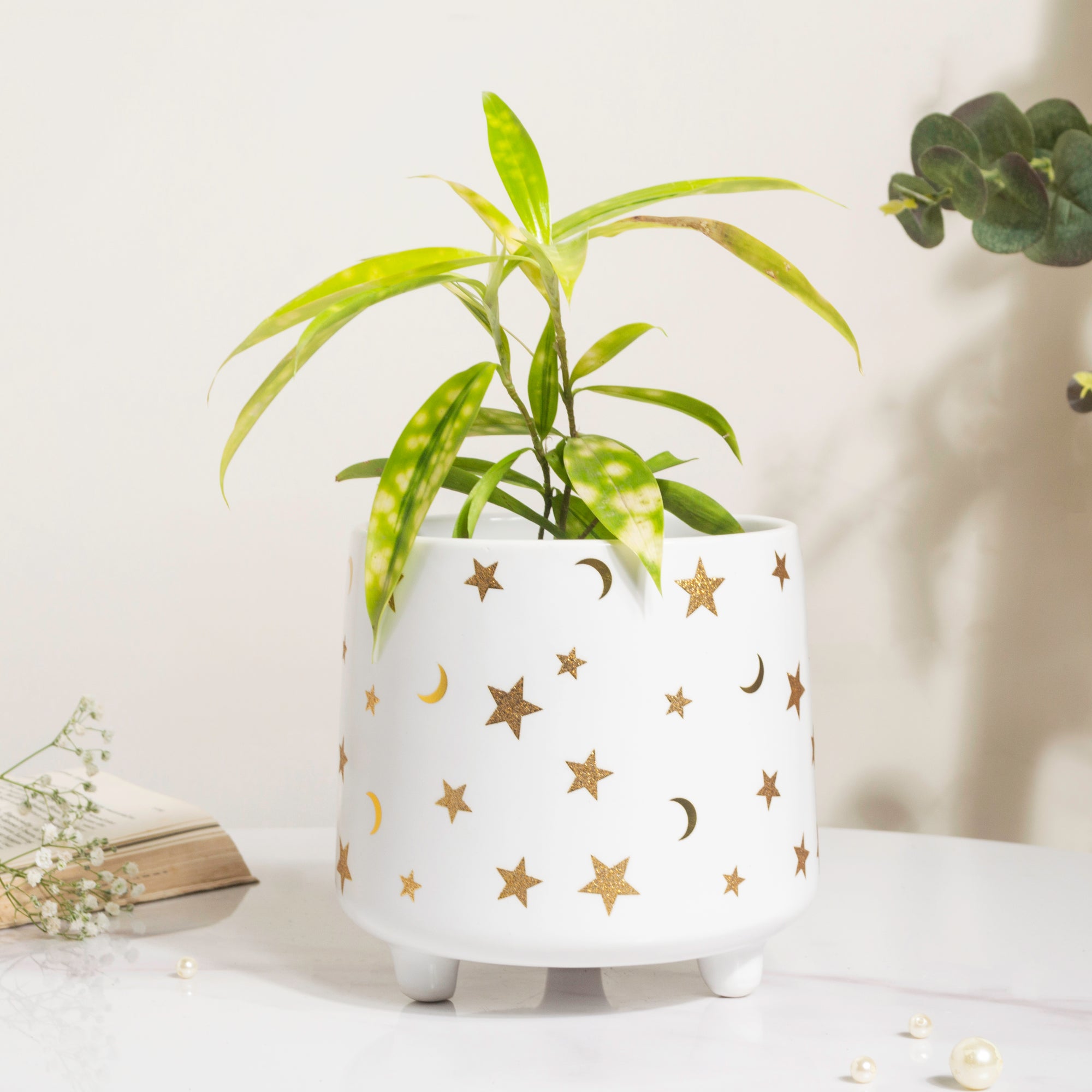 Place fresh greens into the exquisitely designed white planter to brighten up the living space. The white ceramic surface of the planter has lustrous gold patterns that brighten up the design of the planter in totality. Place the planter on a tabletop or amid the foliage of one's own personal garden for adding a luxe element. The planter does not have a drainage hole, hence, it's advisable to not pour excess water in the soil while nurturing greens.