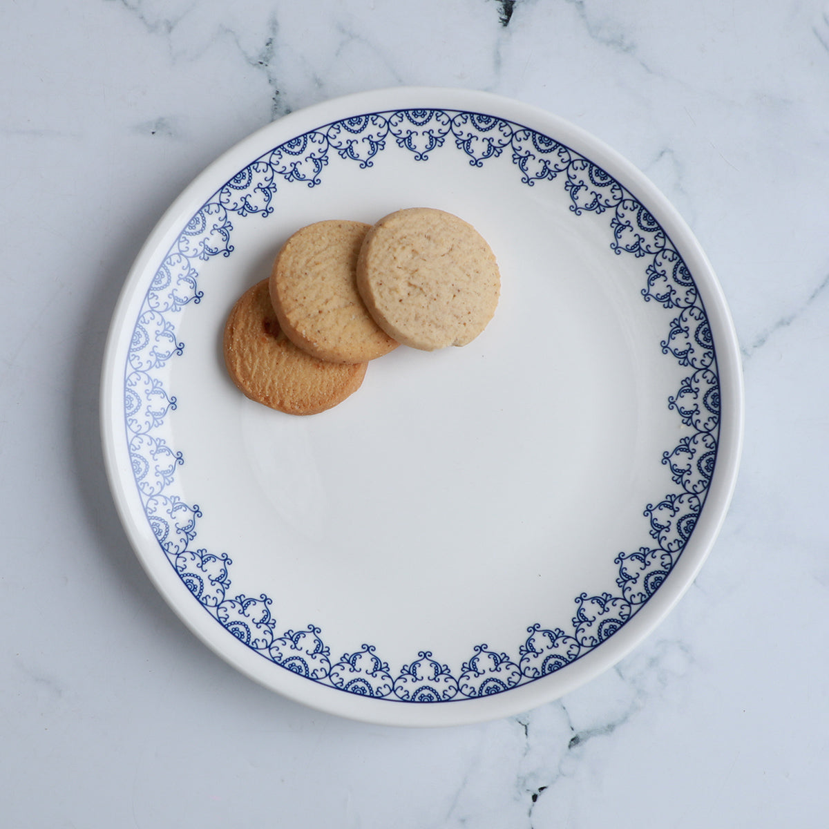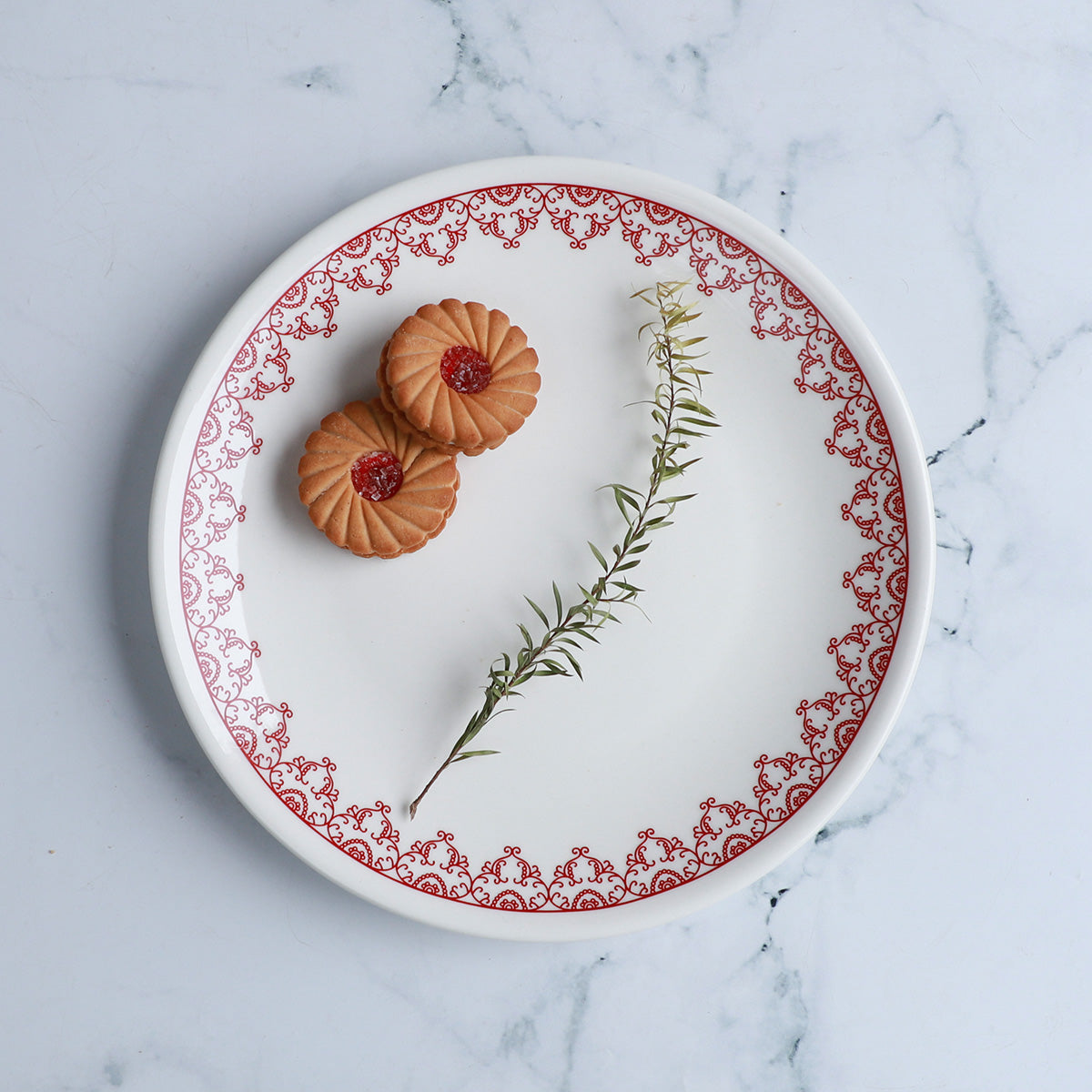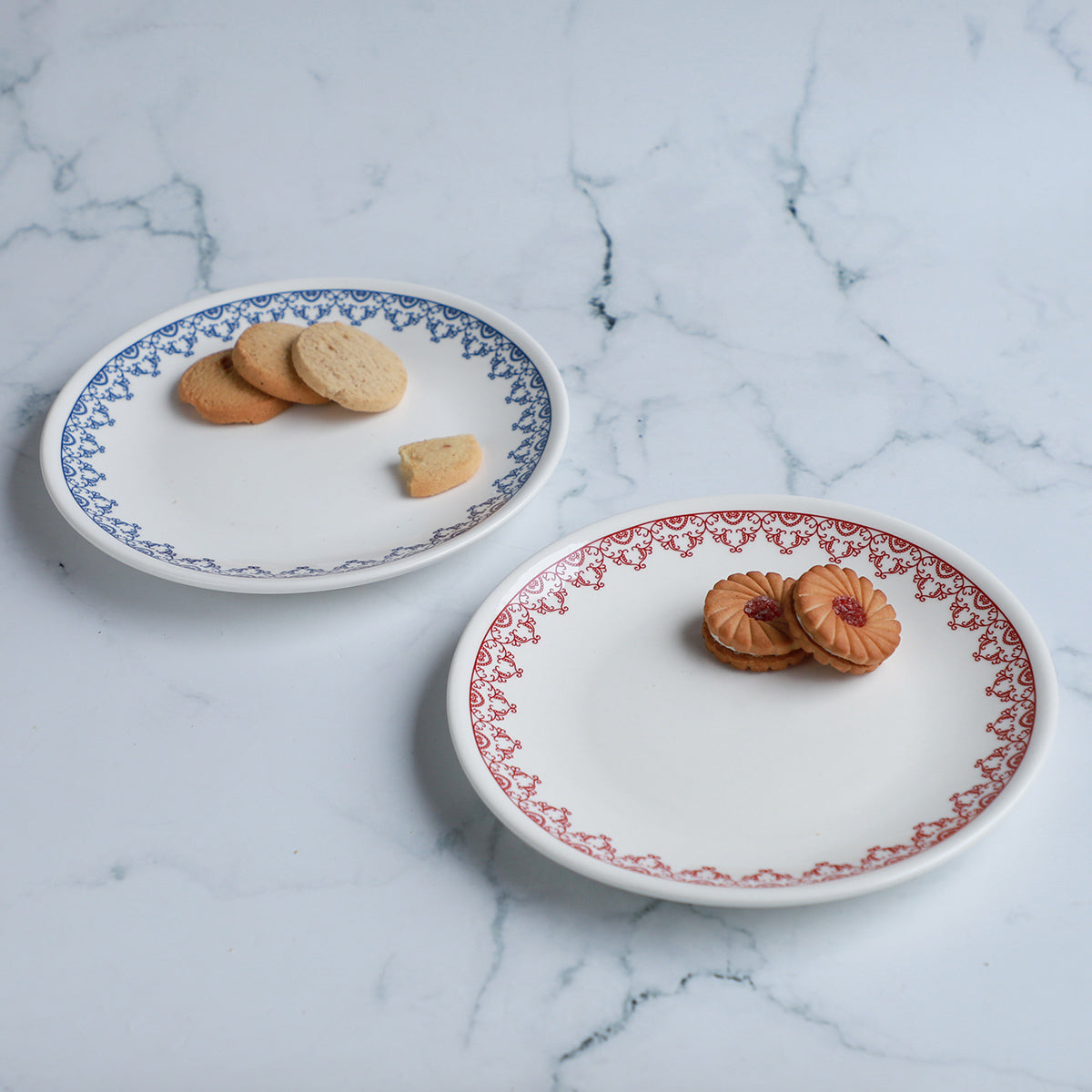 Starter plates that comes in two variants has a lace pattern at the rims. The plate can also be used as a dinner plate or a snack plate. The dessert plate can be used to serve cake slices, cupcakes, muffins, breads, fruits, and a lot more. Different variants can be clubbed together to form a dinner set.