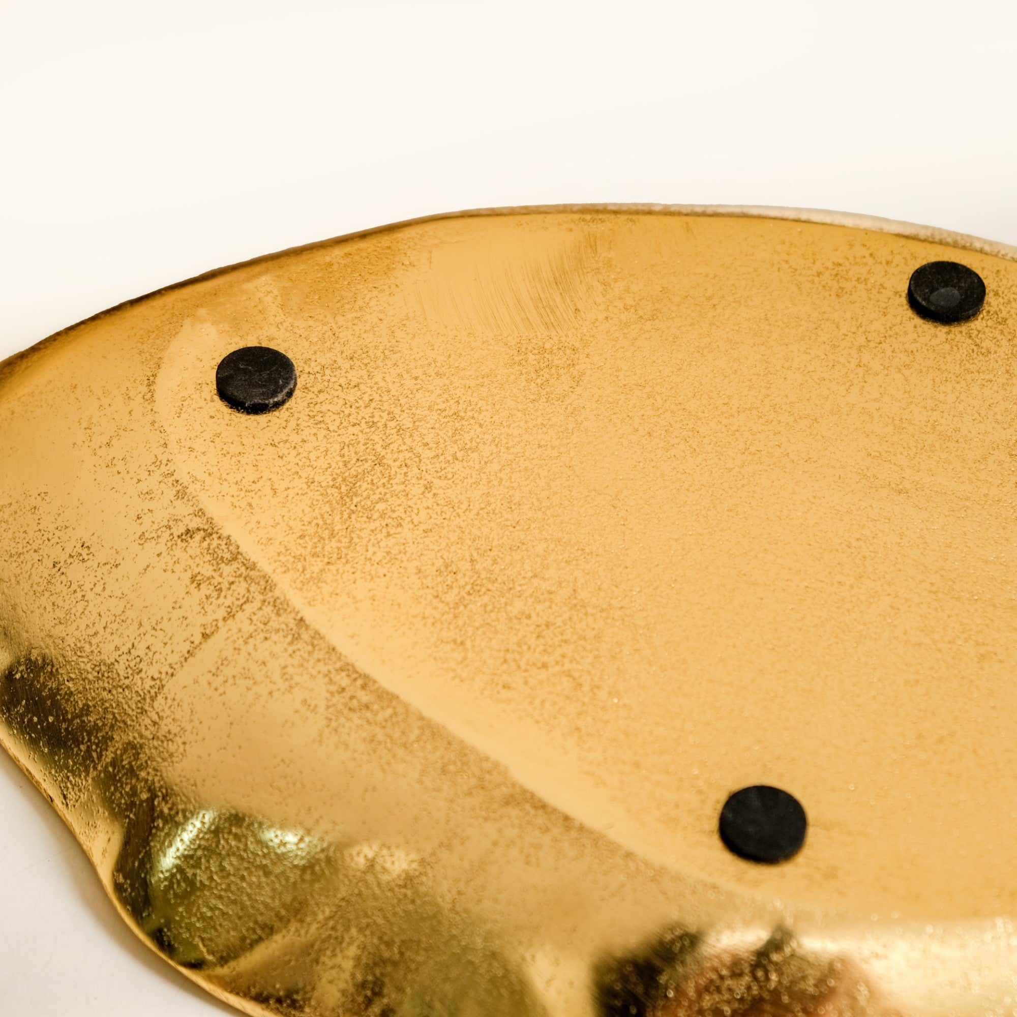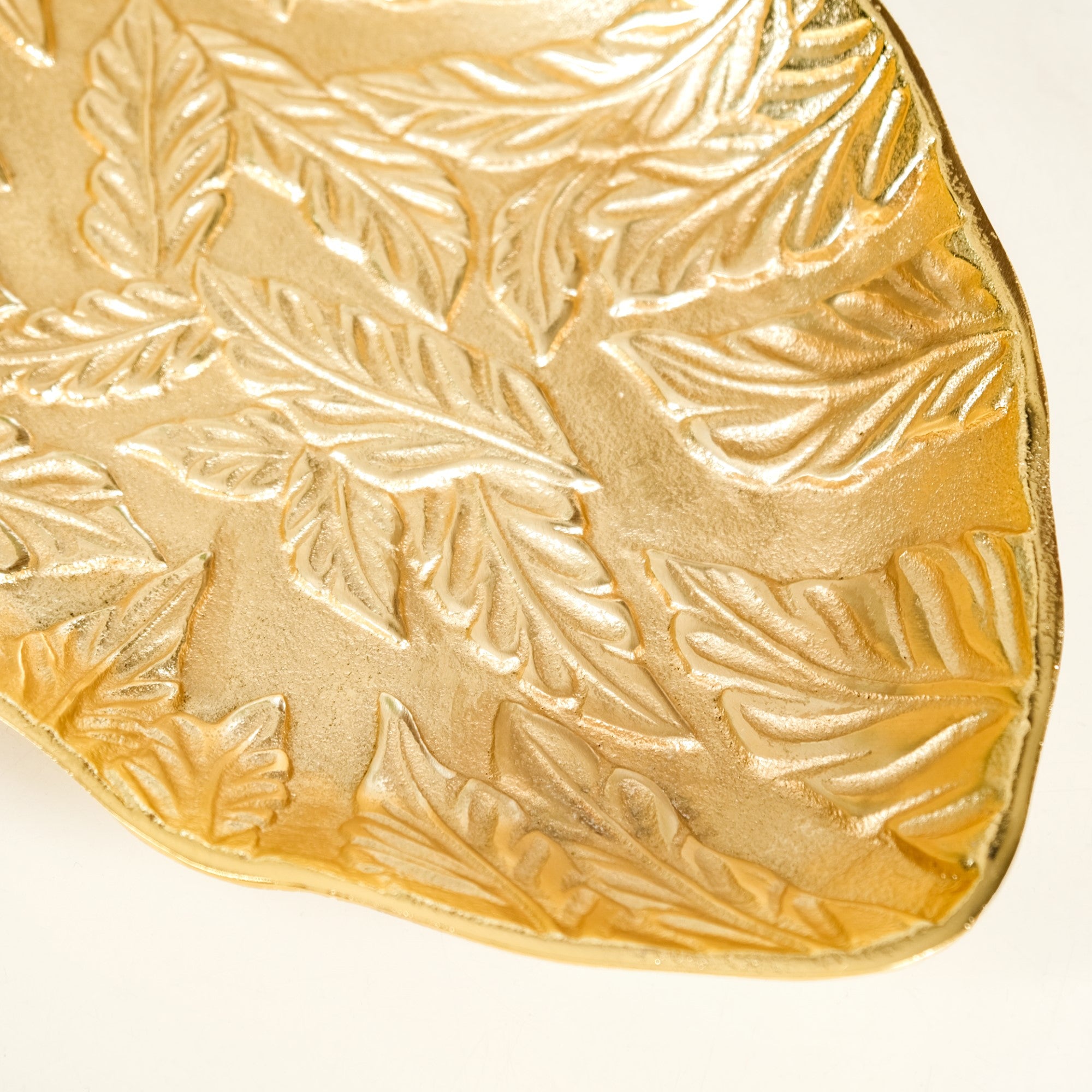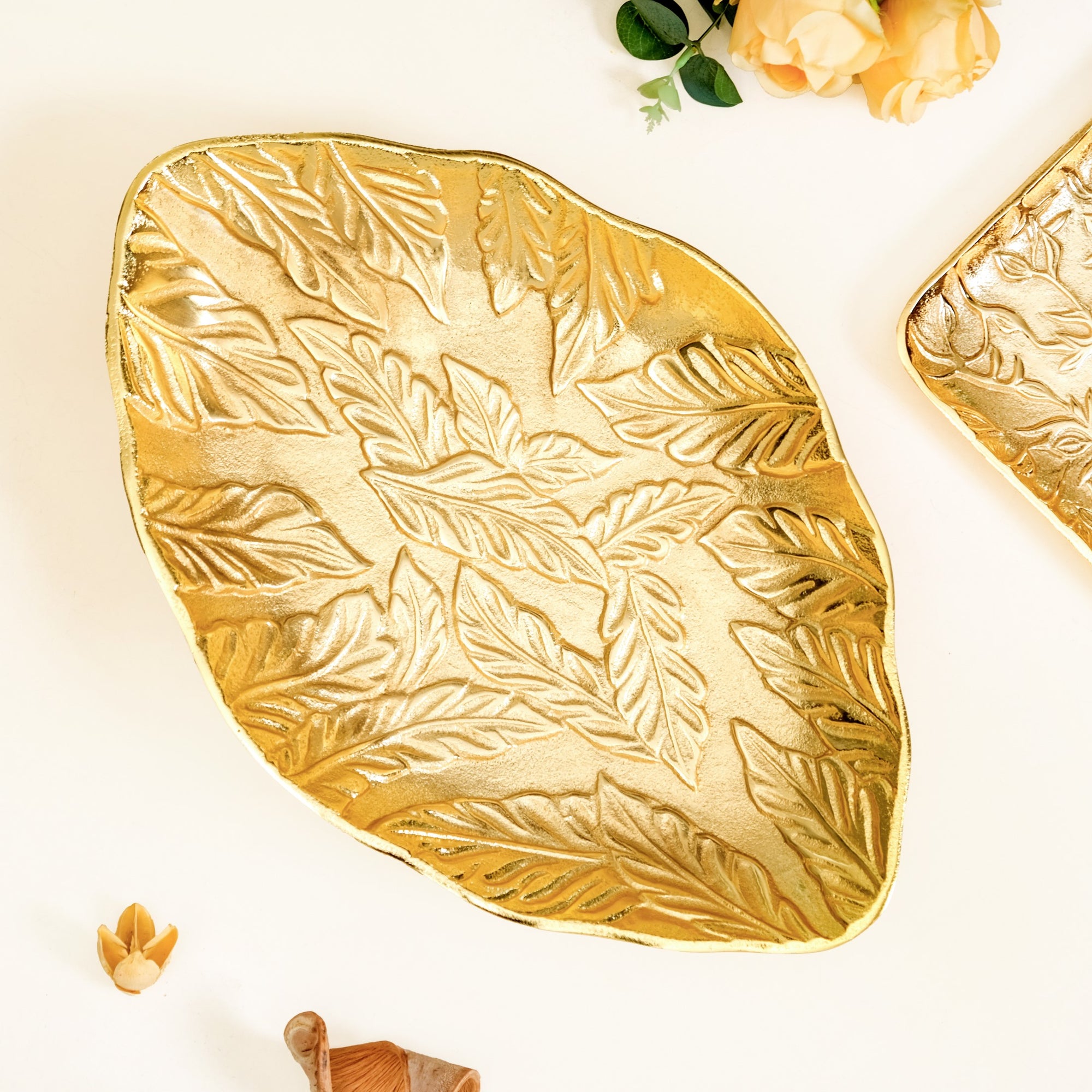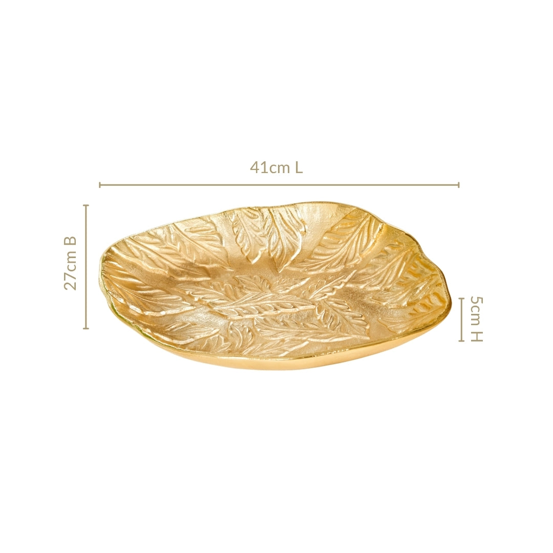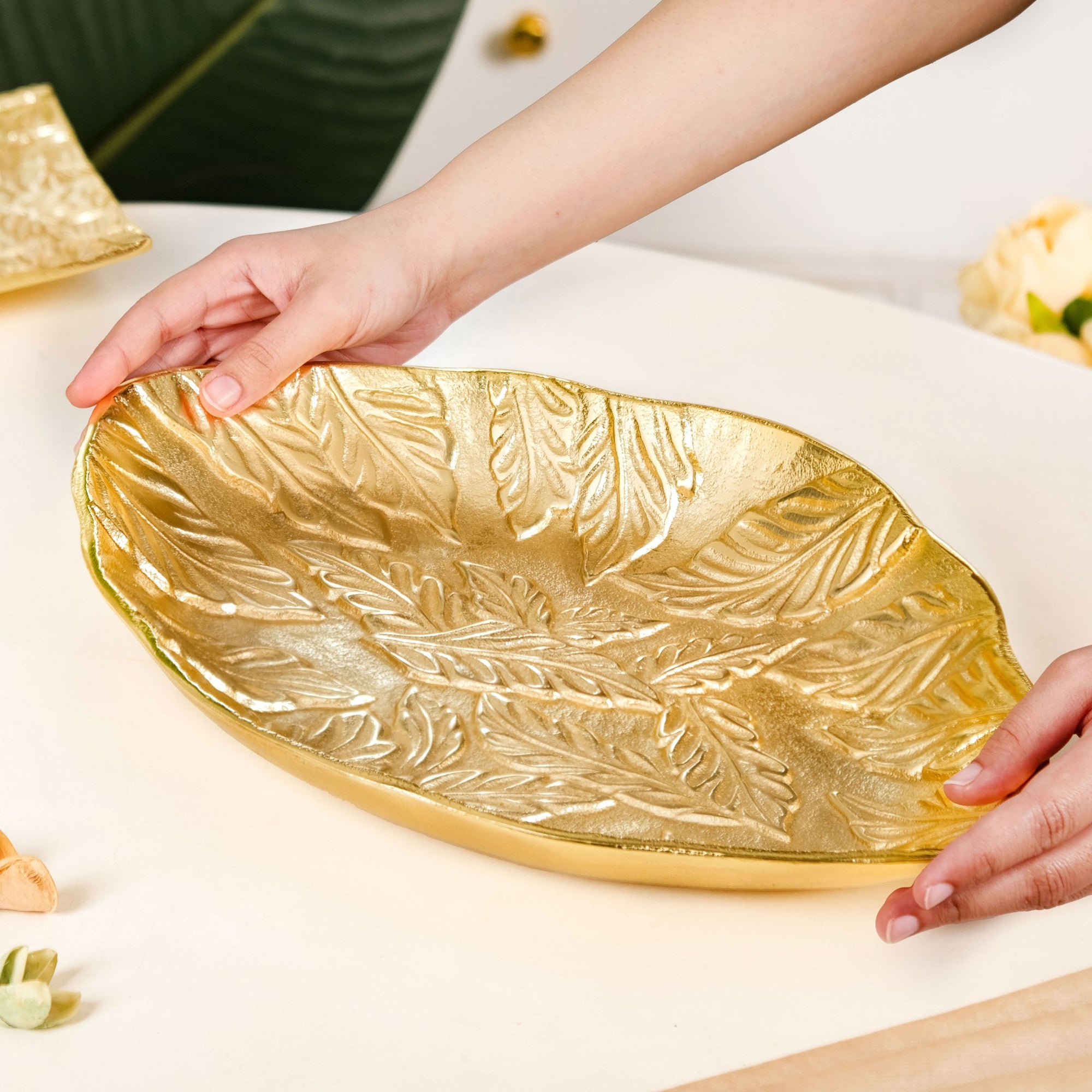 Design: Crafted in a unique oval silhouette, this decorative tray is shaped with organically uneven edges that mimic natural leaves. The surface is fully embossed with a dense leaf pattern that adds depth and a firm grip for items placed. A rectangular hollow base sits neatly underneath to lift the tray off surfaces, giving it structure and visibility. The one-piece aluminium build features a seamless flow throughout, with no joints or loose components. Designed in a matte gold finish, the tray is compact enough for console tables and sideboards, and also suitable for serving dry snacks or treats.