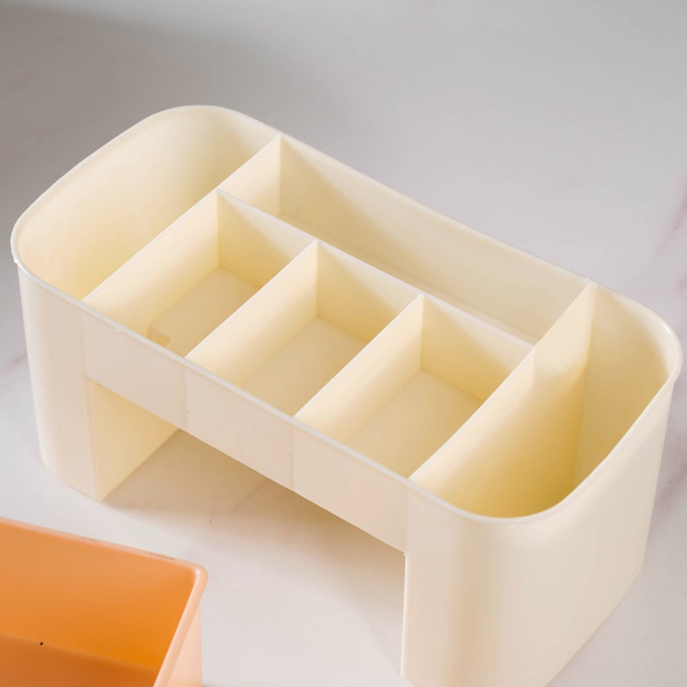 The storage box is the ultimate stationery organization solution. The pen and pencil organizer includes a drawer to keep small supplies like clips and pins organized and easily accessible. The top of the box includes a brush holder to keep your brushes in perfect condition. The sleek and stylish design of this vanity organizer is perfect for any bedroom or bathroom. The desk organiser with drawer is perfect for anyone looking to declutter their vanity/study table and make their everyday beauty routine a breeze. With this cosmetic box say goodbye to cluttered drawers and say hello to an organized and beautiful vanity/desk organizer storage box.