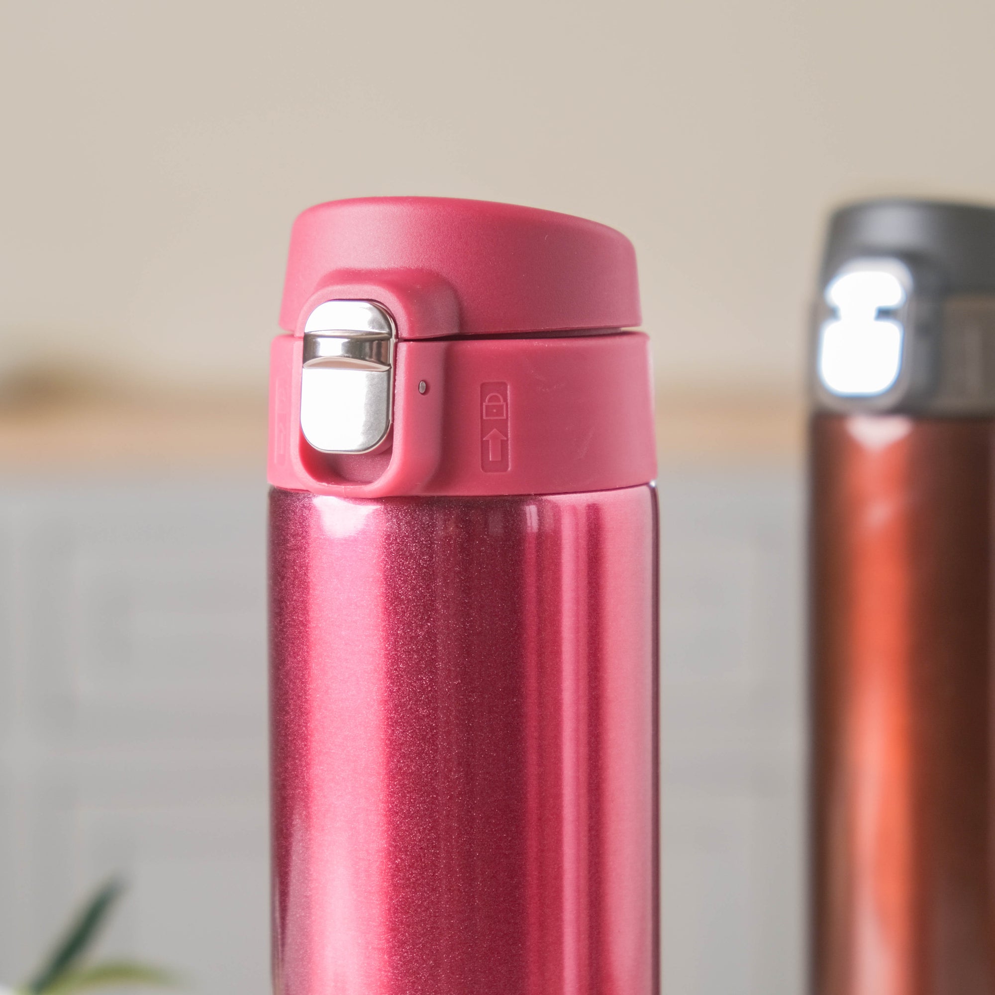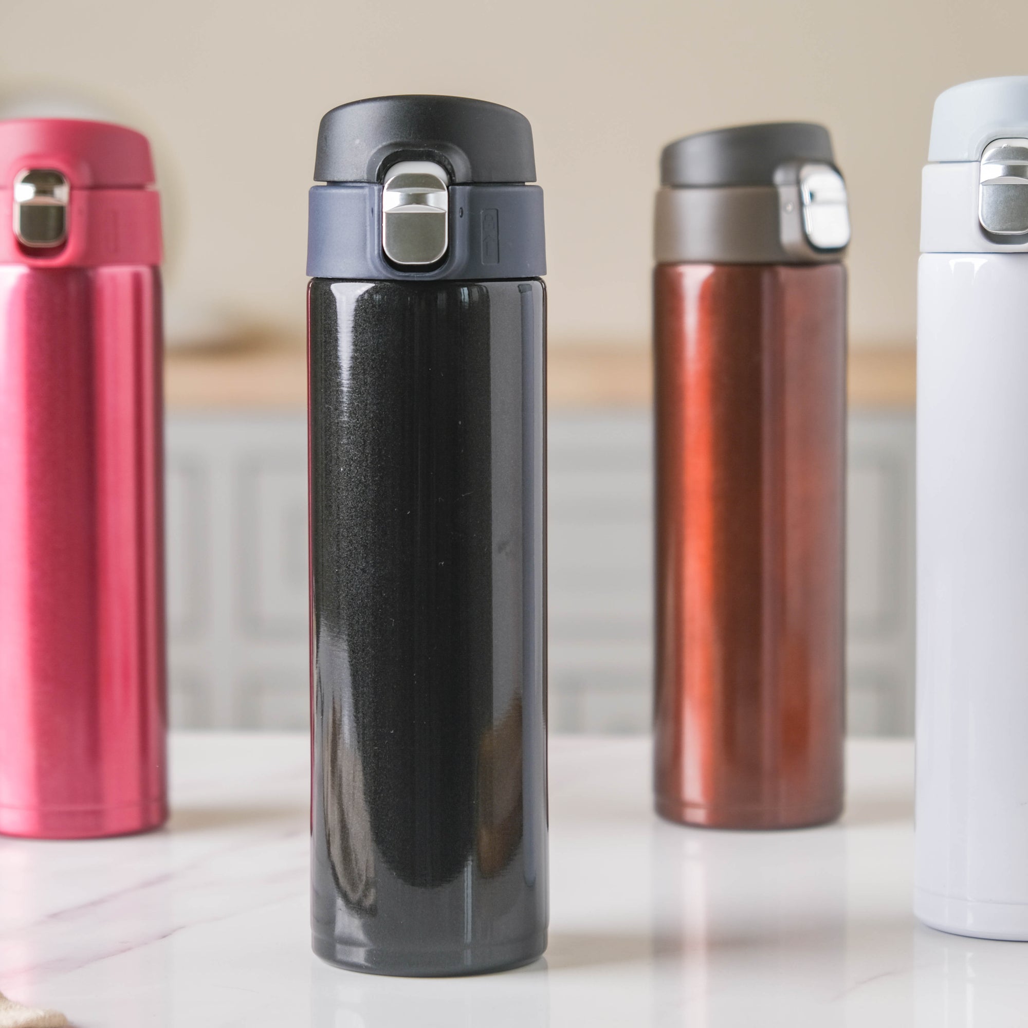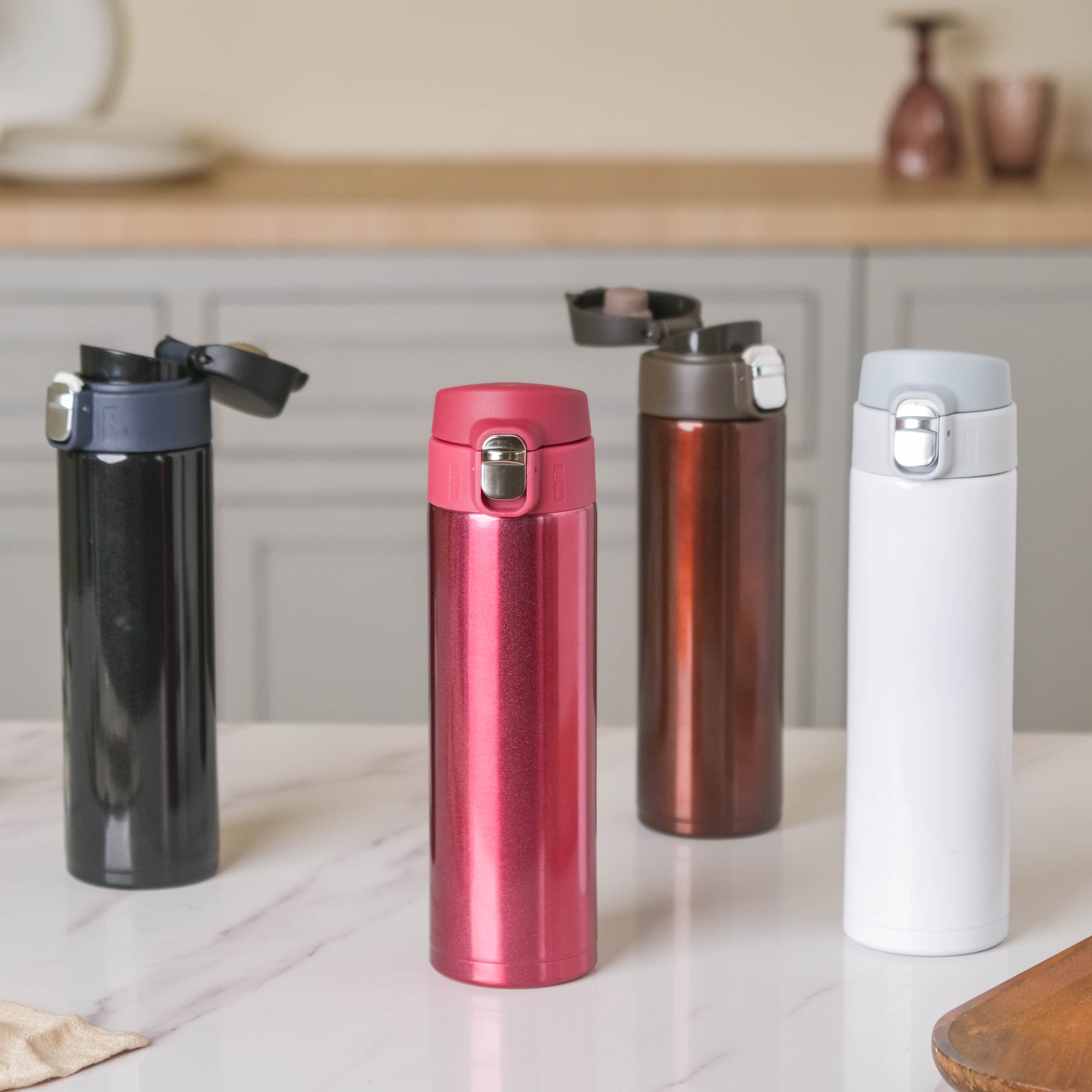 The thermos flasks in striking shades of black, red, white, and brown are ideal for keeping any beverage warm or cool for a long period of time. They are sleek and come in solid shades which makes them a top-notch choice among all.