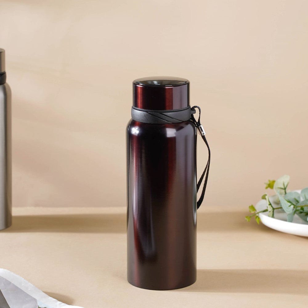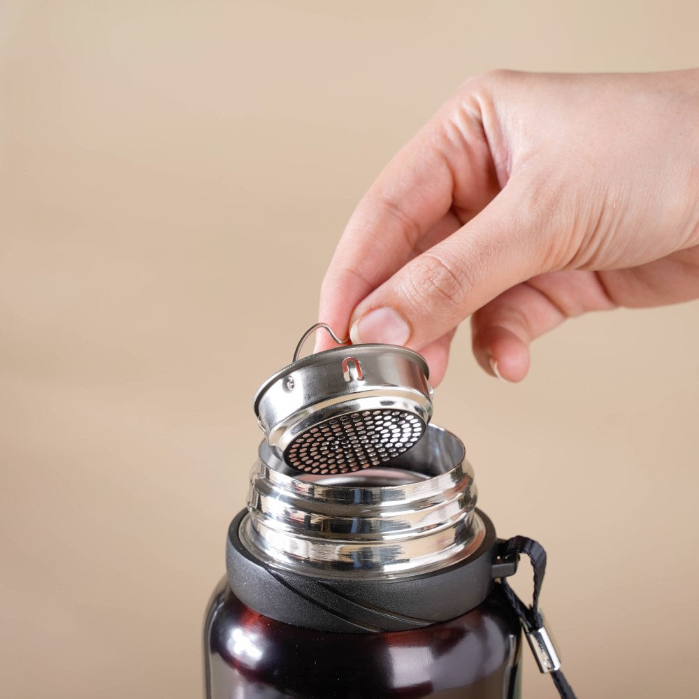 The stainless steel thermos flask features a brown tint and a smooth metallic finish. The flask can be used as a thermos water bottle, tea flask, coffee flask, or hot water flask. The thermos bottle is a vacuum flask that will keep any beverage warm or cool for a longer duration. The sleek and handy flask can be easily carried to the office or on road trips. The flask has an airtight lid and comes with a removable stainless steel strainer for herbal-infused drinks or some black tea.
