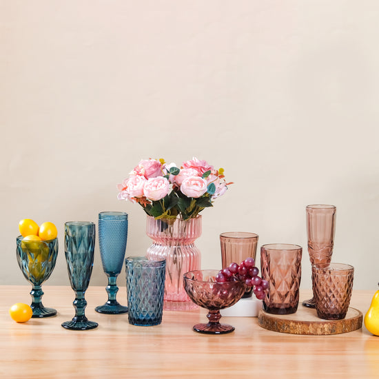 What better way to start a party than with a glass of wine? Our range of stemmed wine glasses can offer a luxe drinking experience, making the celebrations even more special. The gorgeous textured exterior and the stunning colours of our wine glasses also make them a stunning table decor item to set up a fancy dinner table spread for your guests. You can use the wine glasses at a dinner party or give them to your close friends or relatives as an anniversary or housewarming gift.