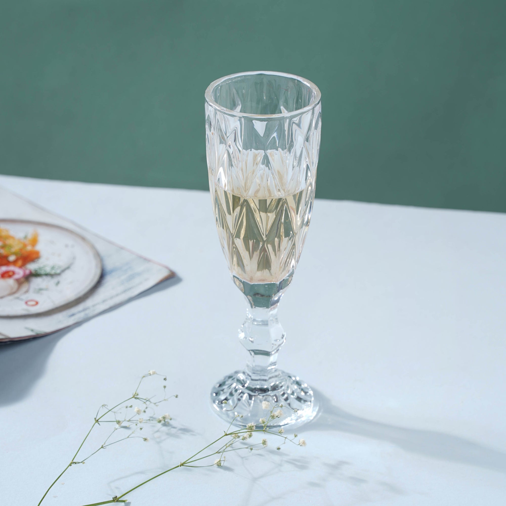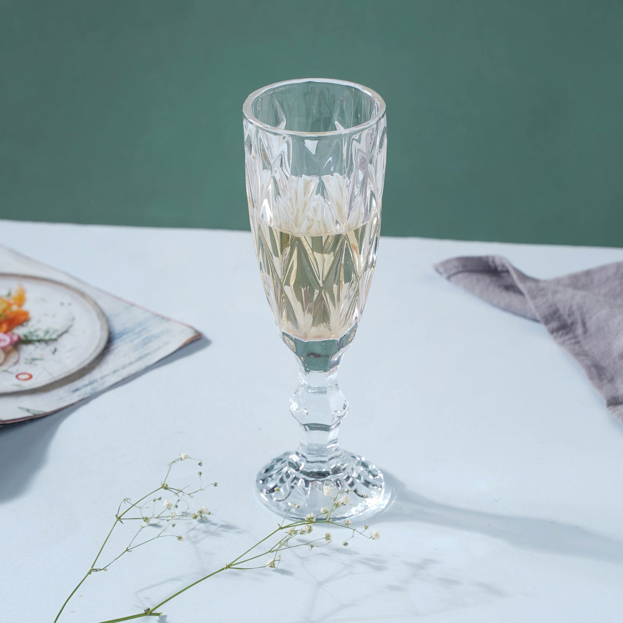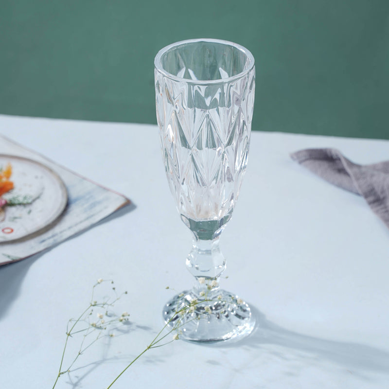 Wine/champagne is a convivial drink, and the tall glass is precisely what one needs to offer one's favorite bottle of wine/champagne to someone special. The glass allows you to swerve the drink without spilling it, preventing stains. The red wine glass, like balloon glasses, has a circular, broad bowl. The bowl's handy form enhances the drink's exposed surface area, allowing more air to interact with the liquid and smoothing out the wine's complex flavor. The embossed surface of the glass with triangular cut designs provides a luxurious touch to the whole wine/champagne tasting and drinking experience. The glass regulates the fragrance and soothes the senses as one sips on a savoring drink after a long day at work.