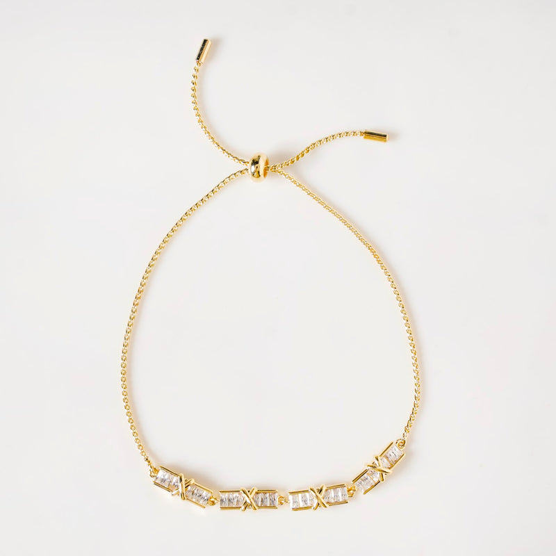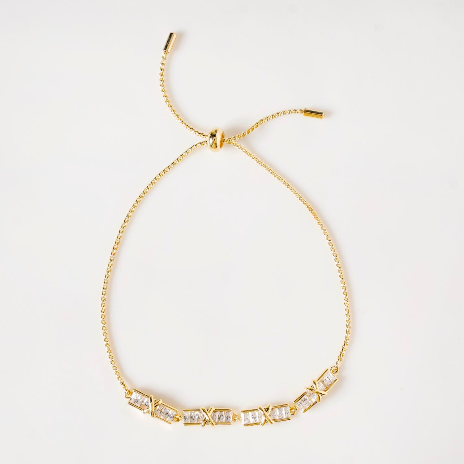 Exuding a soft, luminous elegance, this bracelet is a refined expression of grace and sophistication. Inspired by the delicate threads of fabric and the captivating brilliance of diamonds, it fuses the timeless art of textile design with the sparkling allure of precious stones. The gold-tone chain, adorned with shimmering diamantes, is framed by a meticulously crafted criss-cross metal pattern, resembling the intricate stitching of fine fabrics. A stunning piece that captures light and attention, this bracelet is a perfect blend of luxury and artistry.