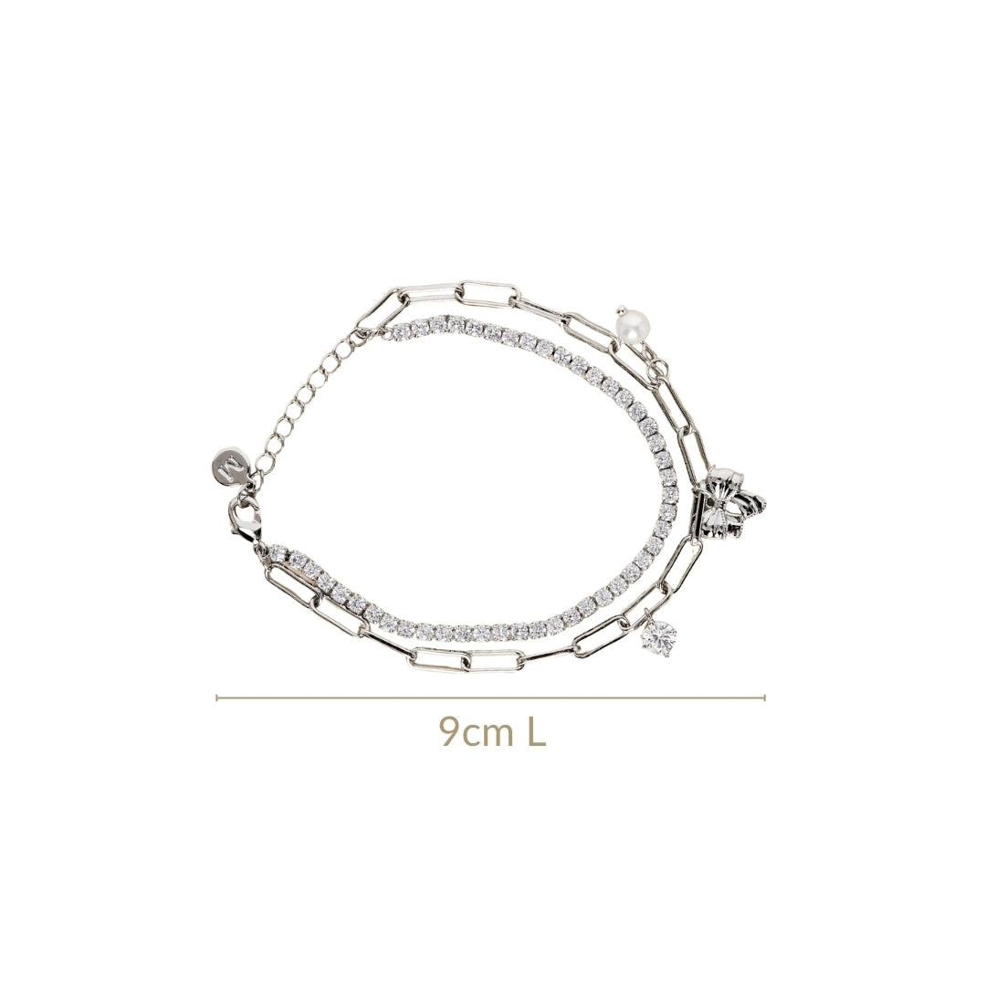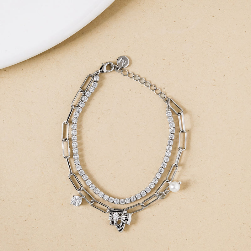 Sparkle with elegance in this silver metal chain bracelet adorned with stone-studded charms, a graceful bow, and a shimmering pearl accent. The unique design effortlessly combines sophistication with charm, creating a piece that enhances both casual and formal outfits. The bracelet’s adjustable chain with a lobster clasp ensures a secure and comfortable fit, making it perfect for daily wear or special occasions. With its timeless appeal, this charm bracelet is an ideal gift or a stunning addition to any jewellery collection, offering both style and a touch of glamour.