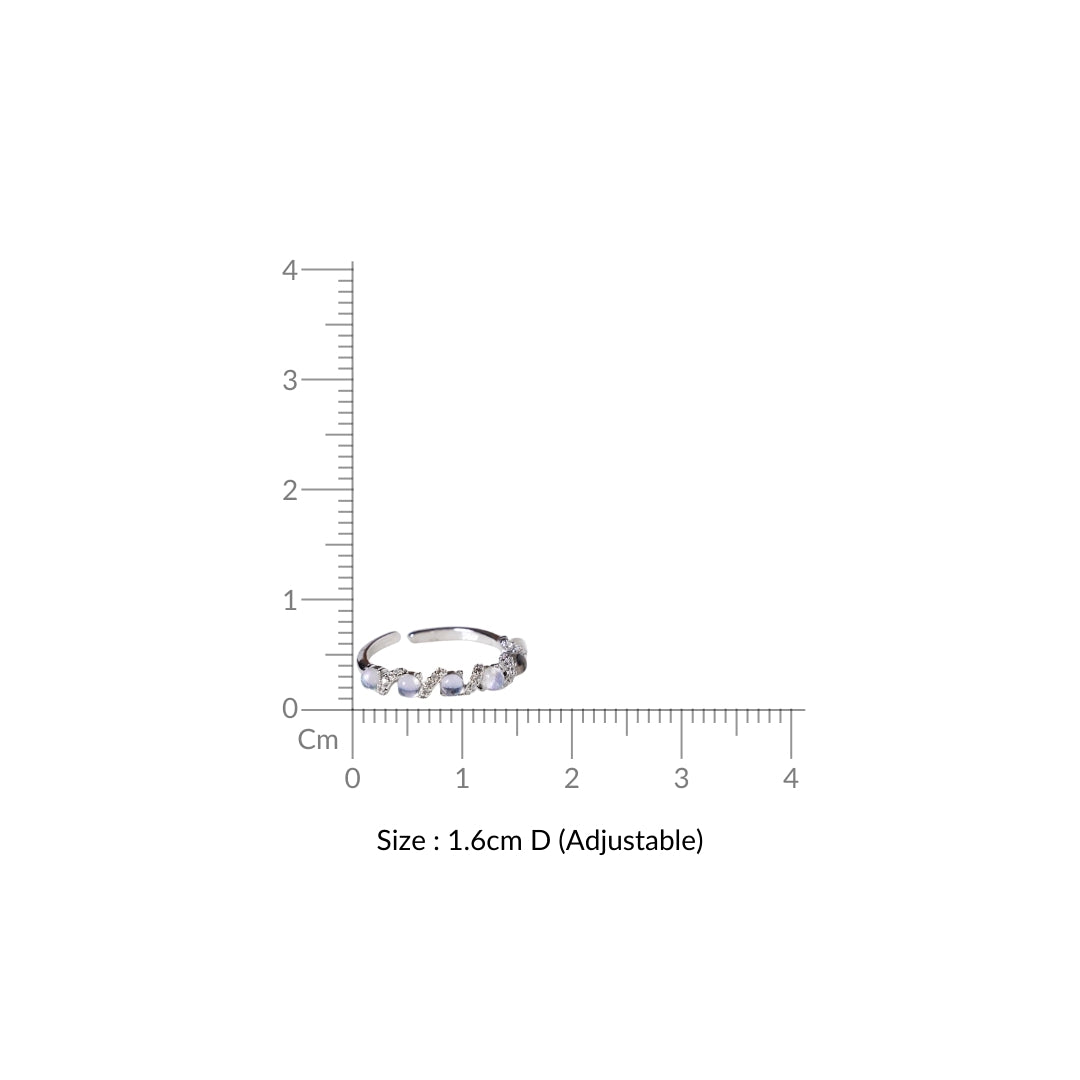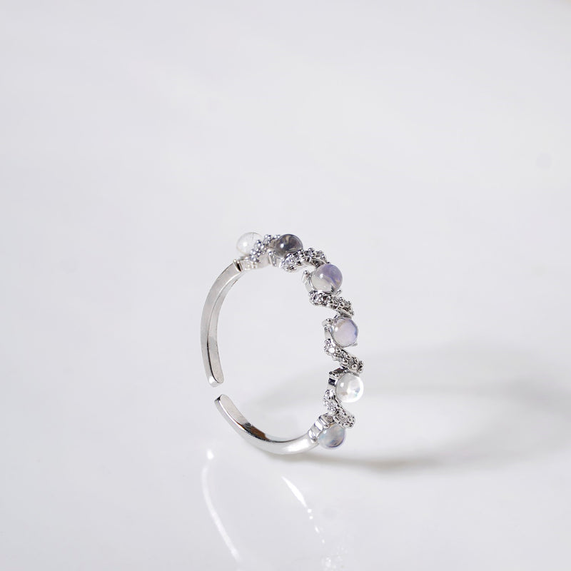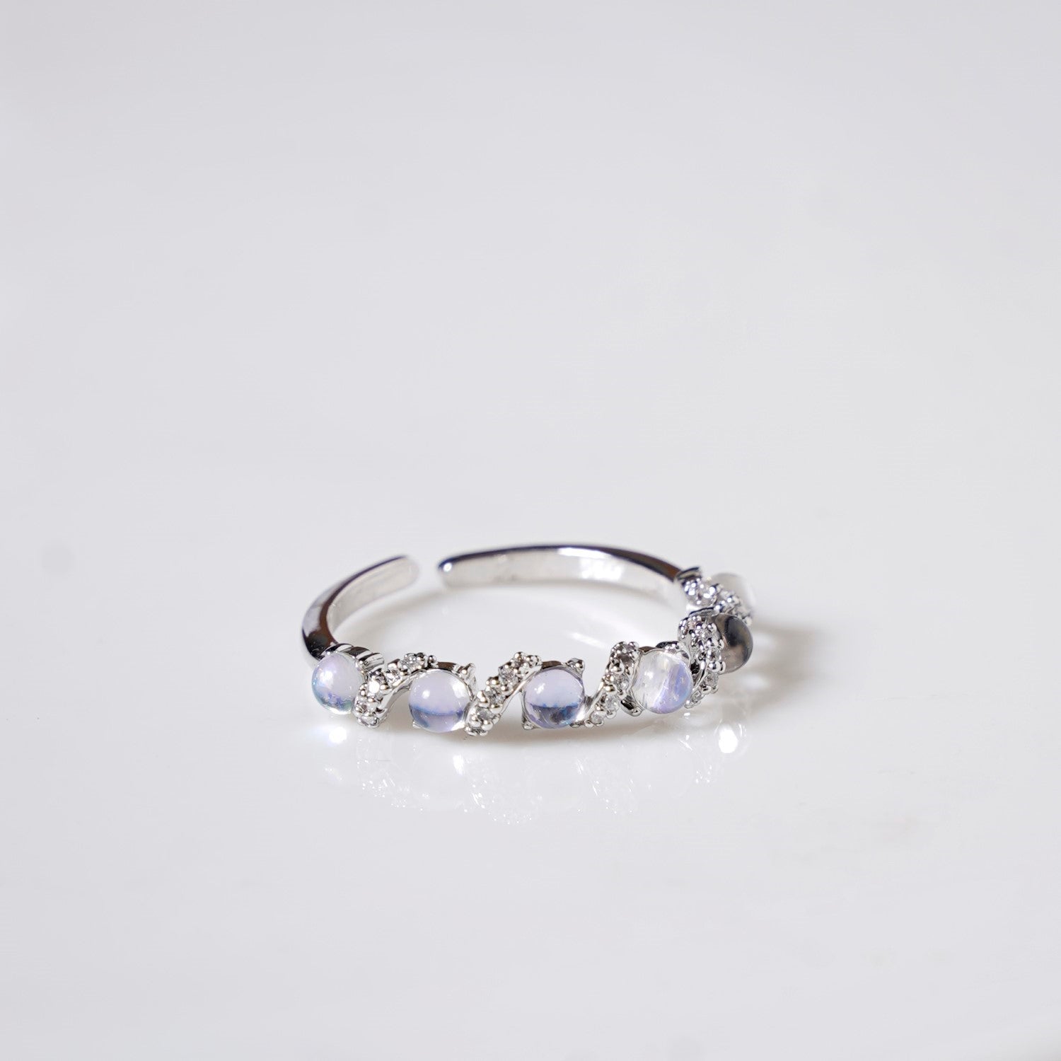 This captivating silver ring features a sinuous swirl design, gracefully adorned with sparkling stones that trace its path. Interspersed along the swirl are transparent PVC beads, each emitting a soft, iridescent glow that shifts with the light. The harmonious interplay of shimmering stones and luminous beads creates a mesmerizing effect, making this ring a standout piece for any occasion.