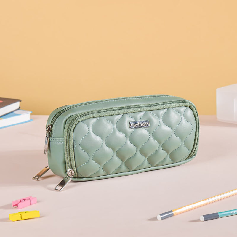 The sage green vegan leather pencil holder is made from high-quality material, showcasing a sleek and durable design. The eco-friendly pencil bag makes it easy to keep the stationery in organized manner with its 3 spacious compartments. The first compartment has an elastic loop which can give you the advantage to keep the pencils separately. The second compartment is a large spacious area, and the third one has an inner mesh pocket to hold erasers, paper clips, or any other small important objects. The stationery pouch also has space outside the mesh pocket. The stationery holder bag is perfect for any workspace or classroom as its compact design allows you to carry it everywhere. The bag has strong stitching and a waterproof interior and exterior, hence it can be carried while travelling too.
