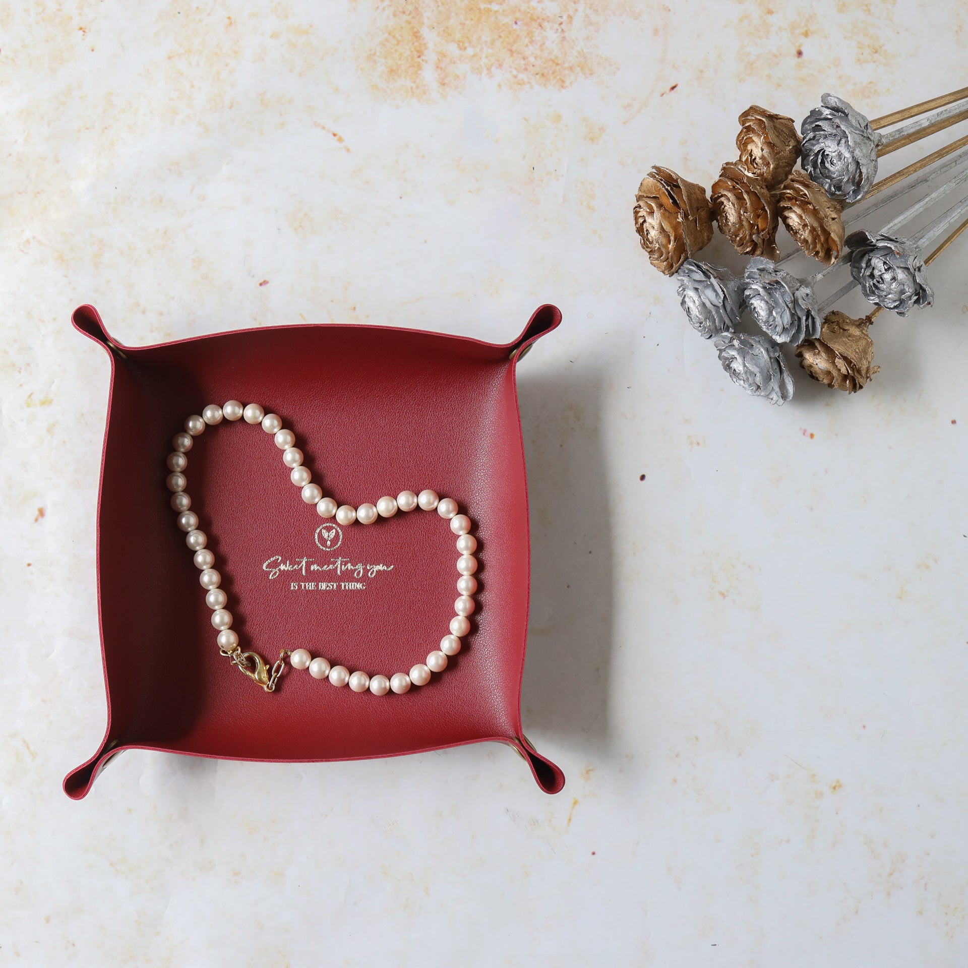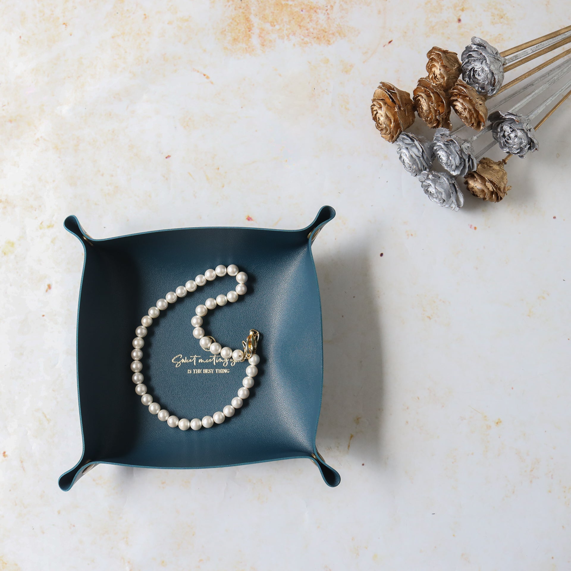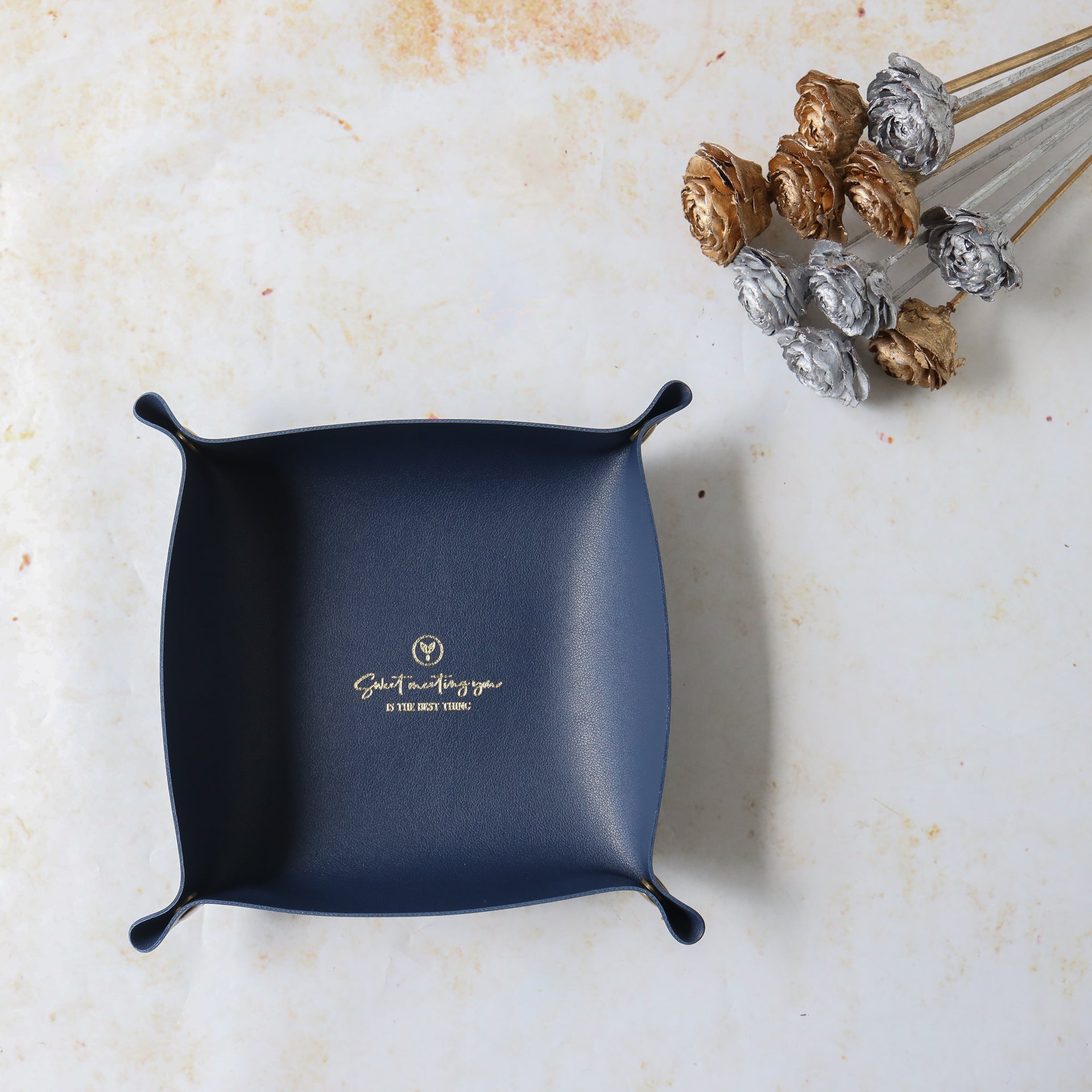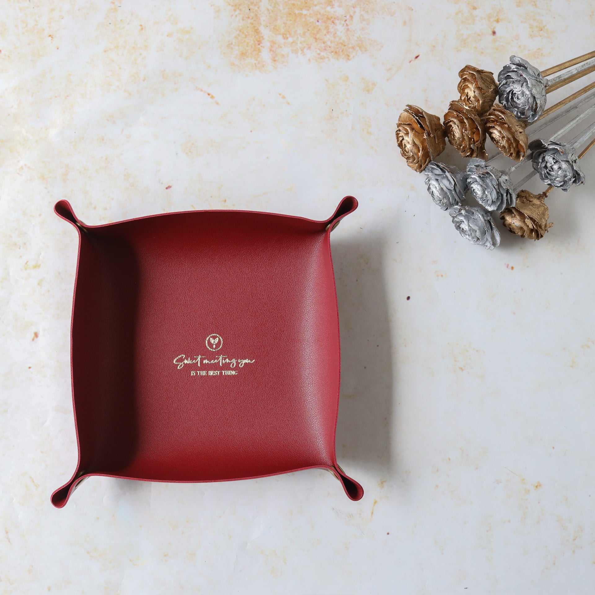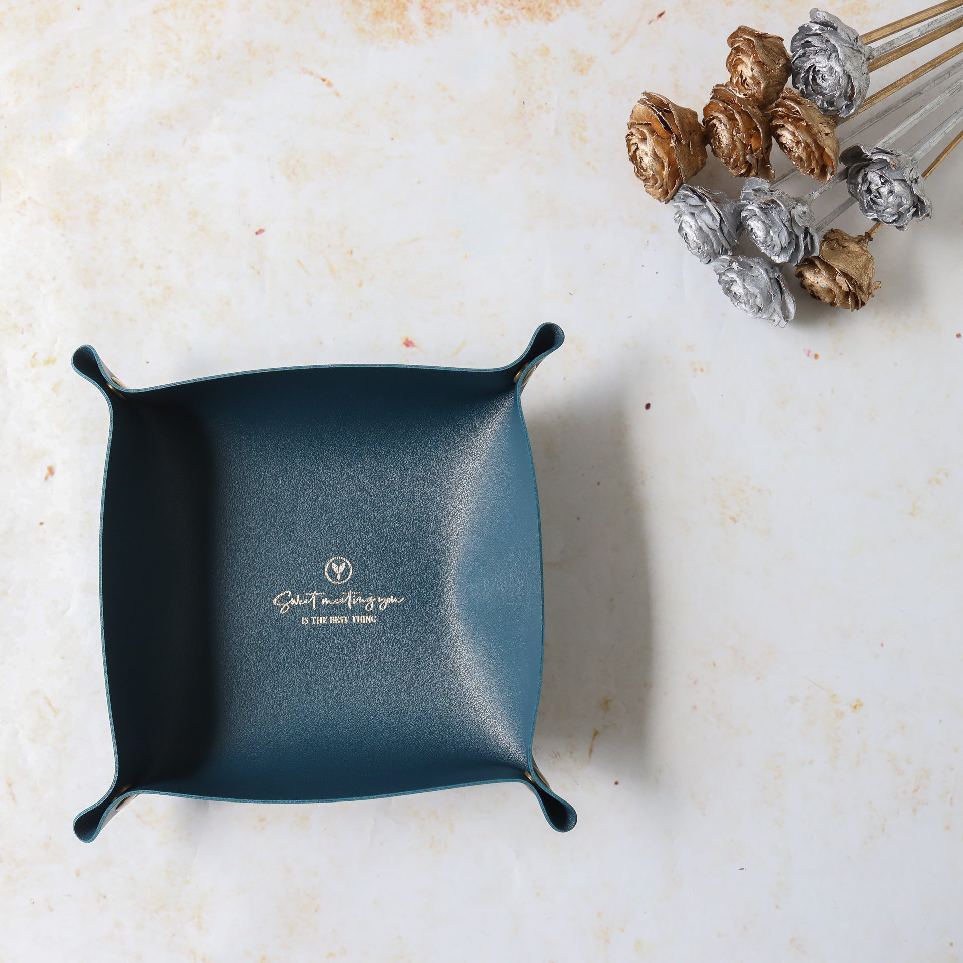 Leather storage tray that can be used to organise any desk or table and can add a touch of luxe with the leather finish. It comes as a leather mat with buttons on four corners that can be buttoned to make the mat into a storage valet. The organiser tray can be placed in the living area to hold remotes or in the room to organise a cluttered corner or on the study desk to organise stationery. The leather tray can be used as a valet to keep daily essentials like wallet and keys, as a decorative storage tray in the room or as an organizer for the dresser to keep perfume, junk and jewellery.